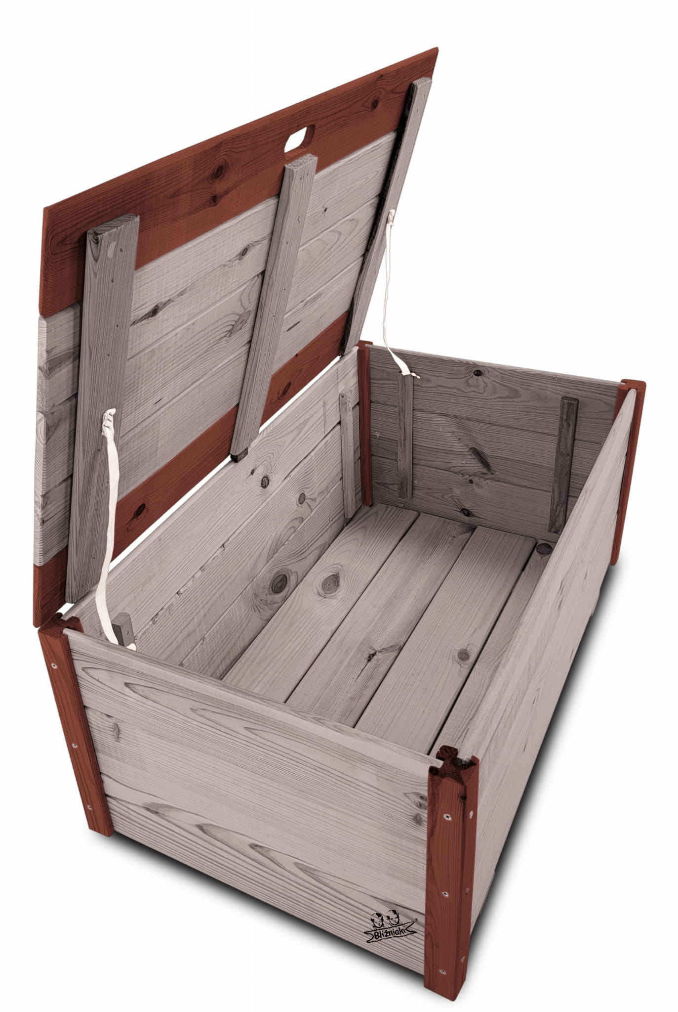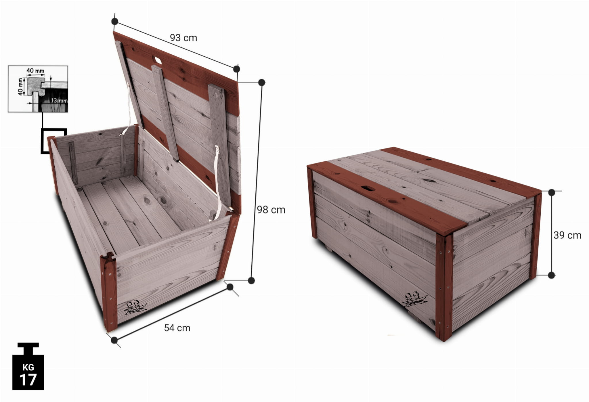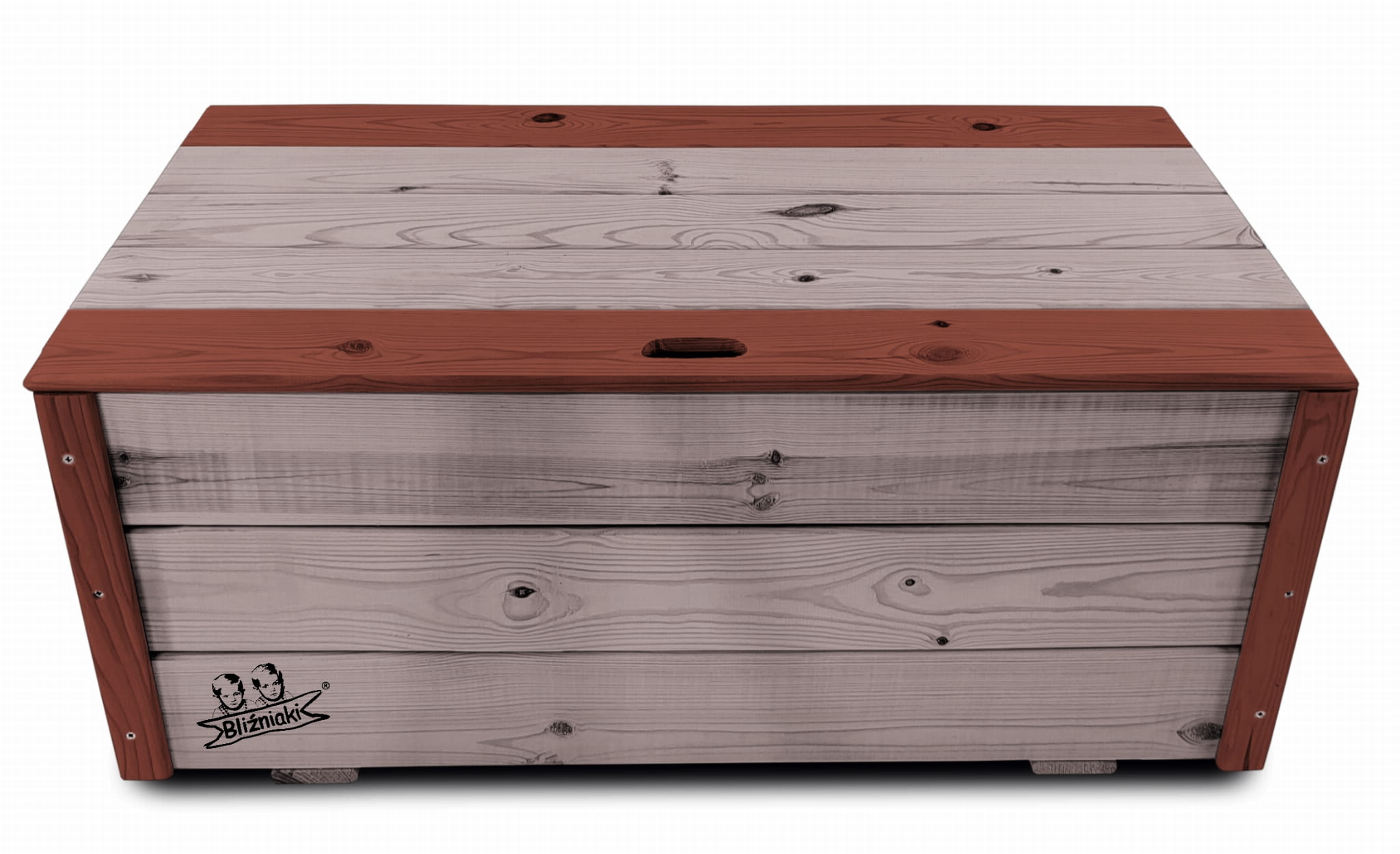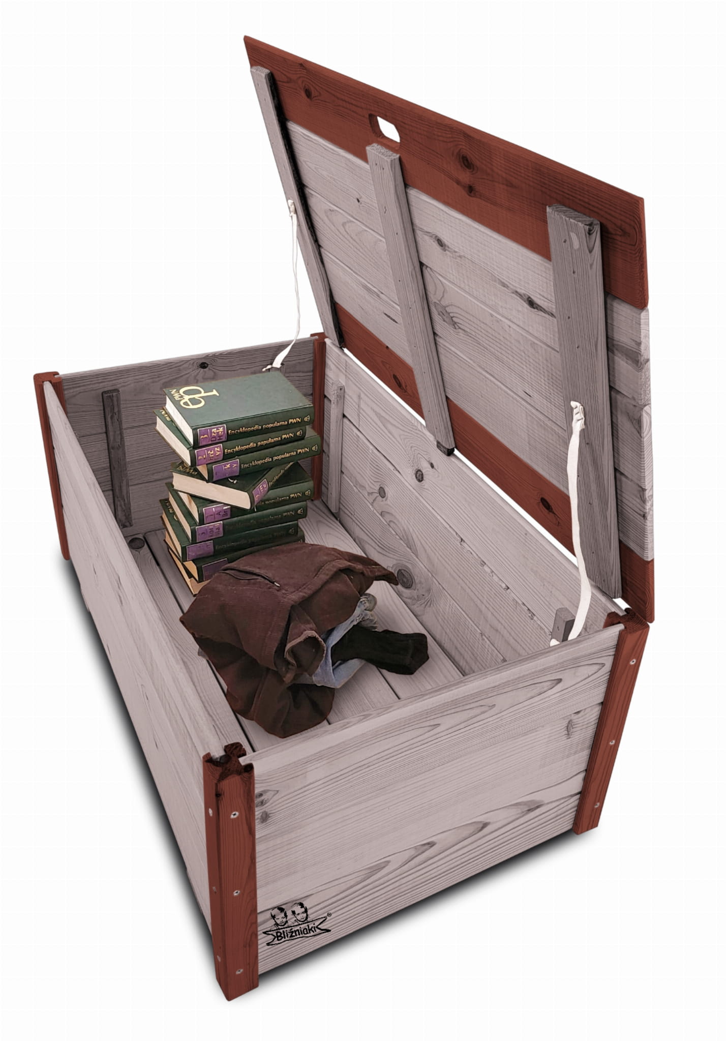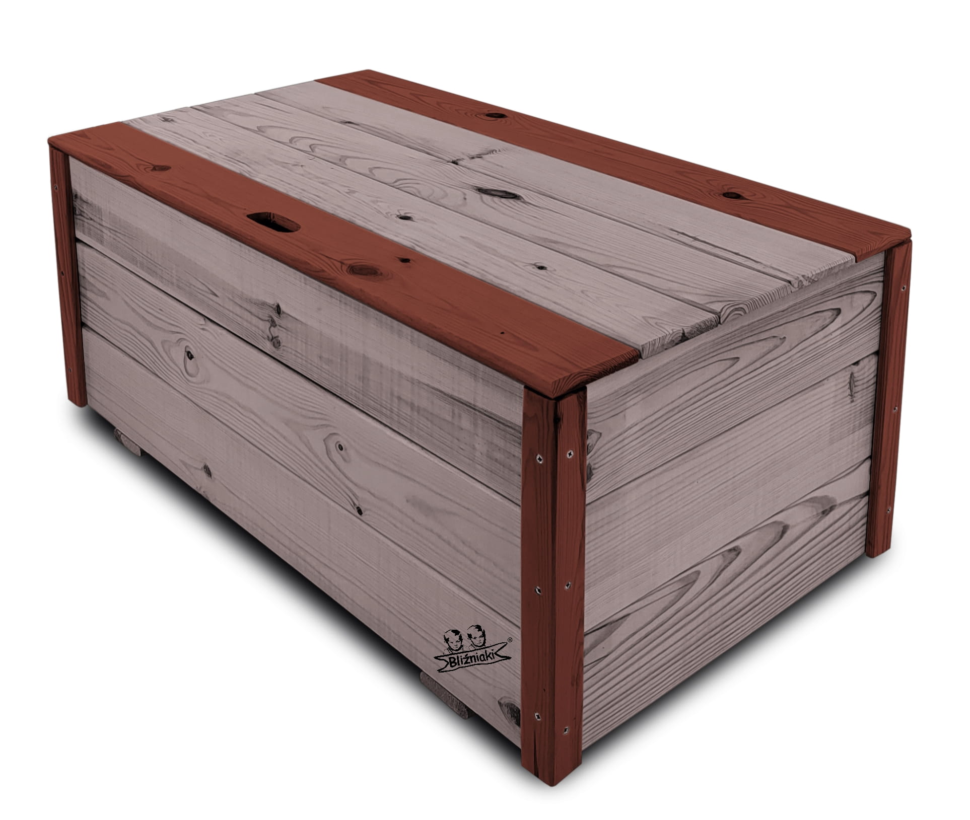 Produkt wykonany został z suszonego drewna sosnowego. Zabezpieczony metodą impregnowania. Środek na bazie wody użyty do impregnacji jest w pełni ekologiczny i bezpieczny dla ludzi i zwierząt. Zabezpieczone w taki sposób drewno sprawia, że skrzynia jest odporna na szkodliwe działanie wody oraz wilgoci, promieni UV, a także grzybów i pleśni, może być więc przechowywana przez cały rok na zewnątrz.