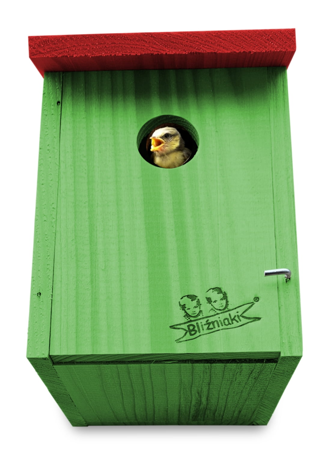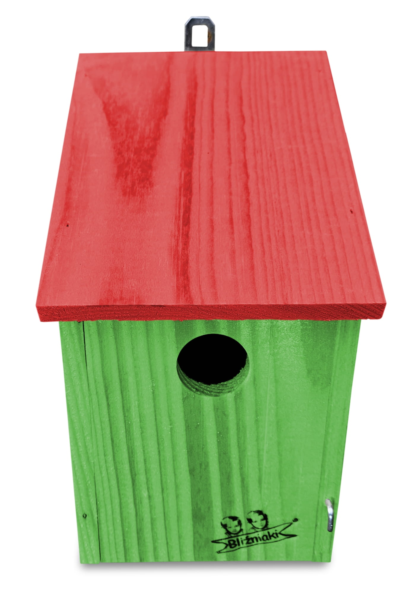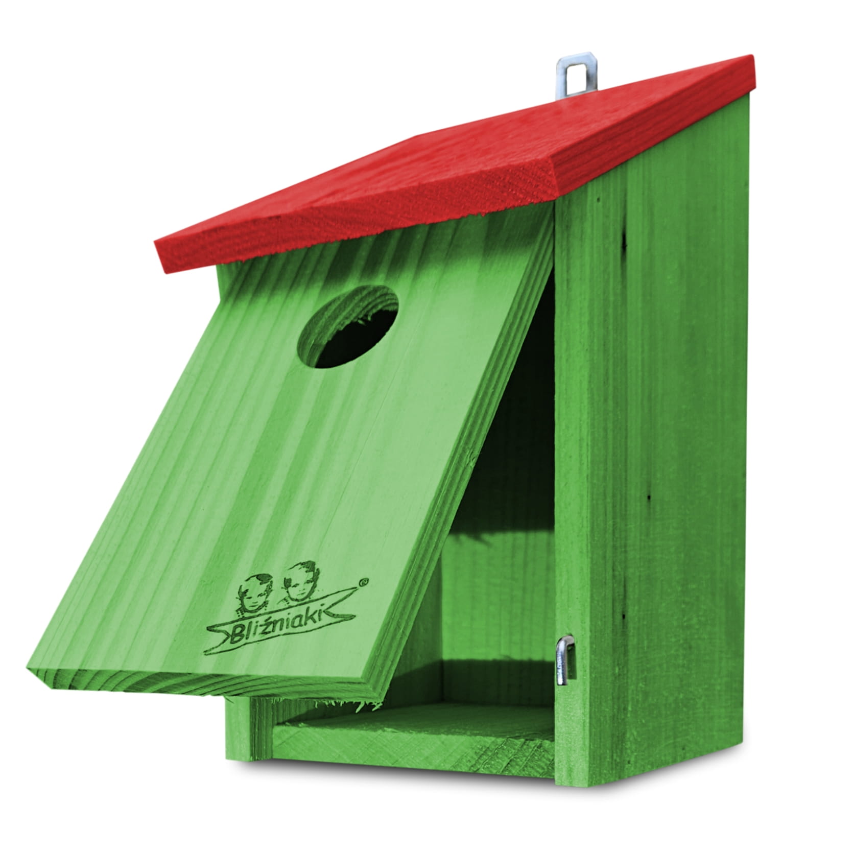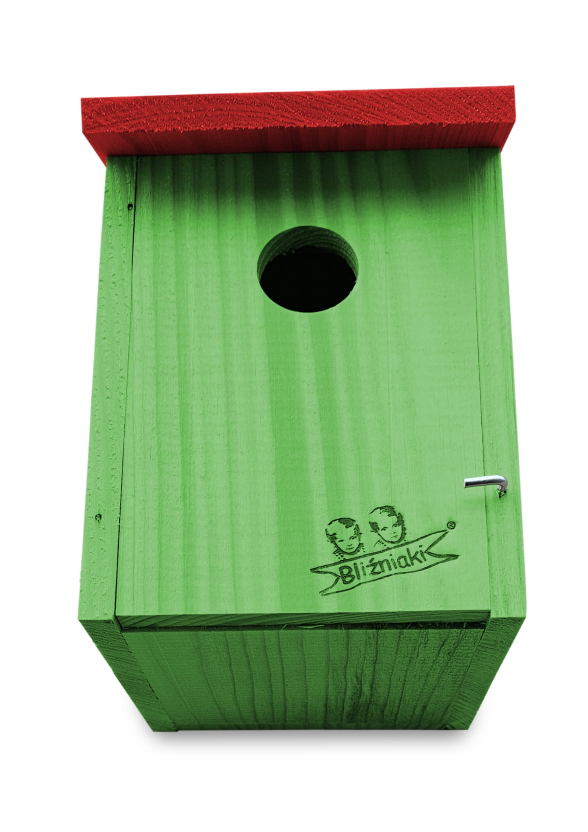 W przeważającej części skrzynka lęgowa jest w kolorze JASNYM ZIELONYM, dach pokryty został kolorem CZERWONYM.