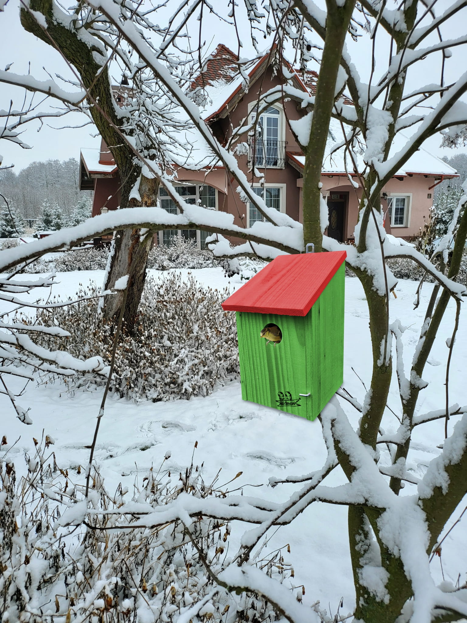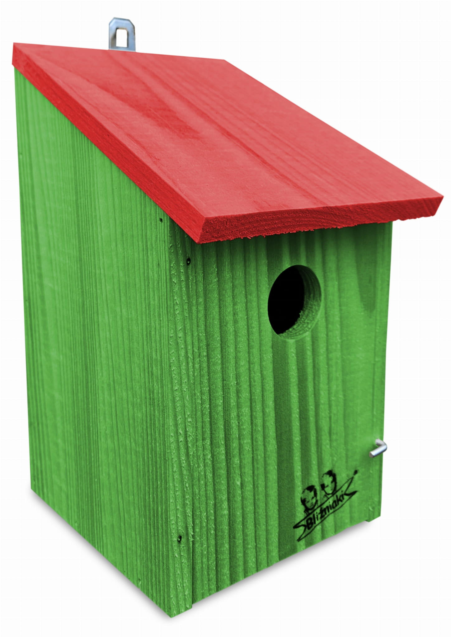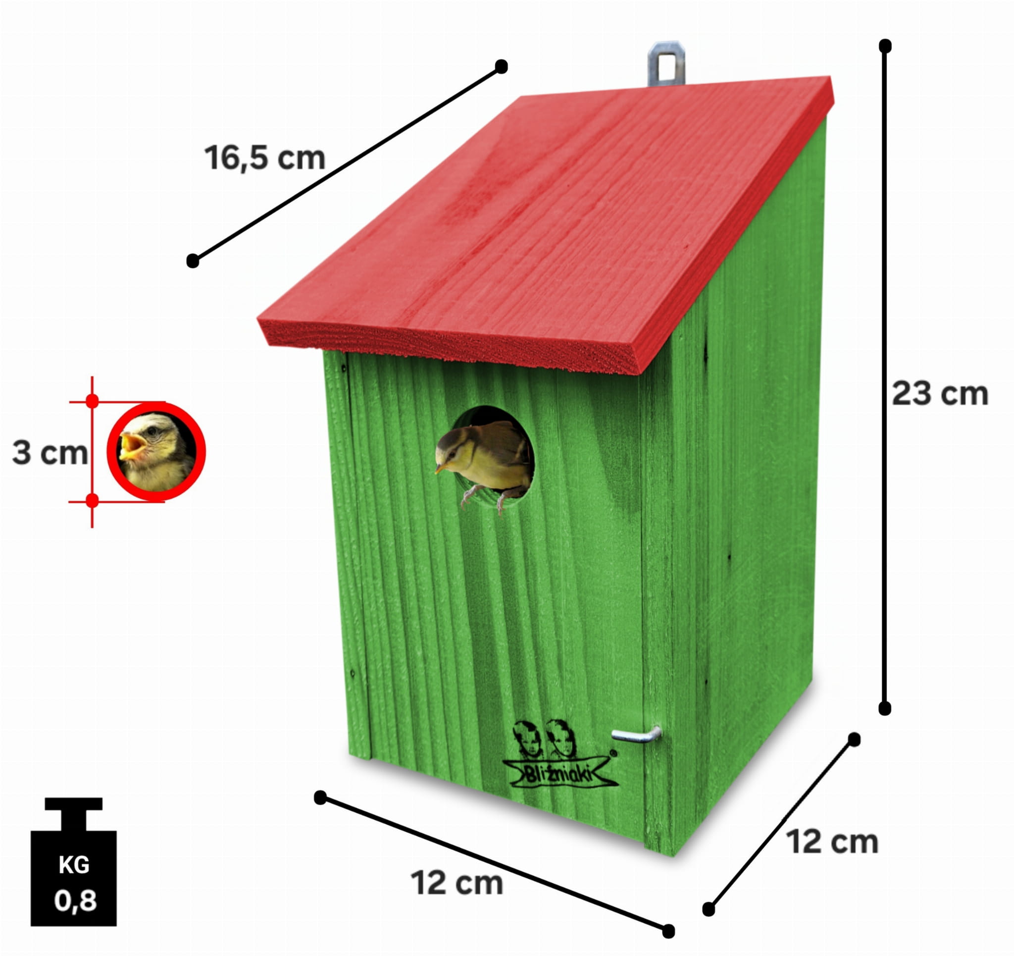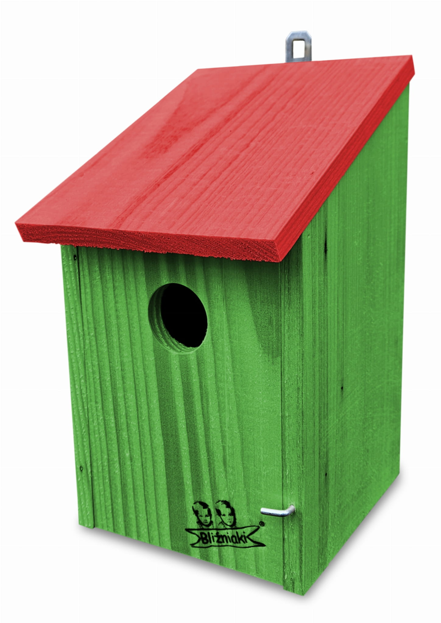 W przeważającej części skrzynka lęgowa jest w kolorze JASNYM ZIELONYM, dach pokryty został kolorem CZERWONYM.