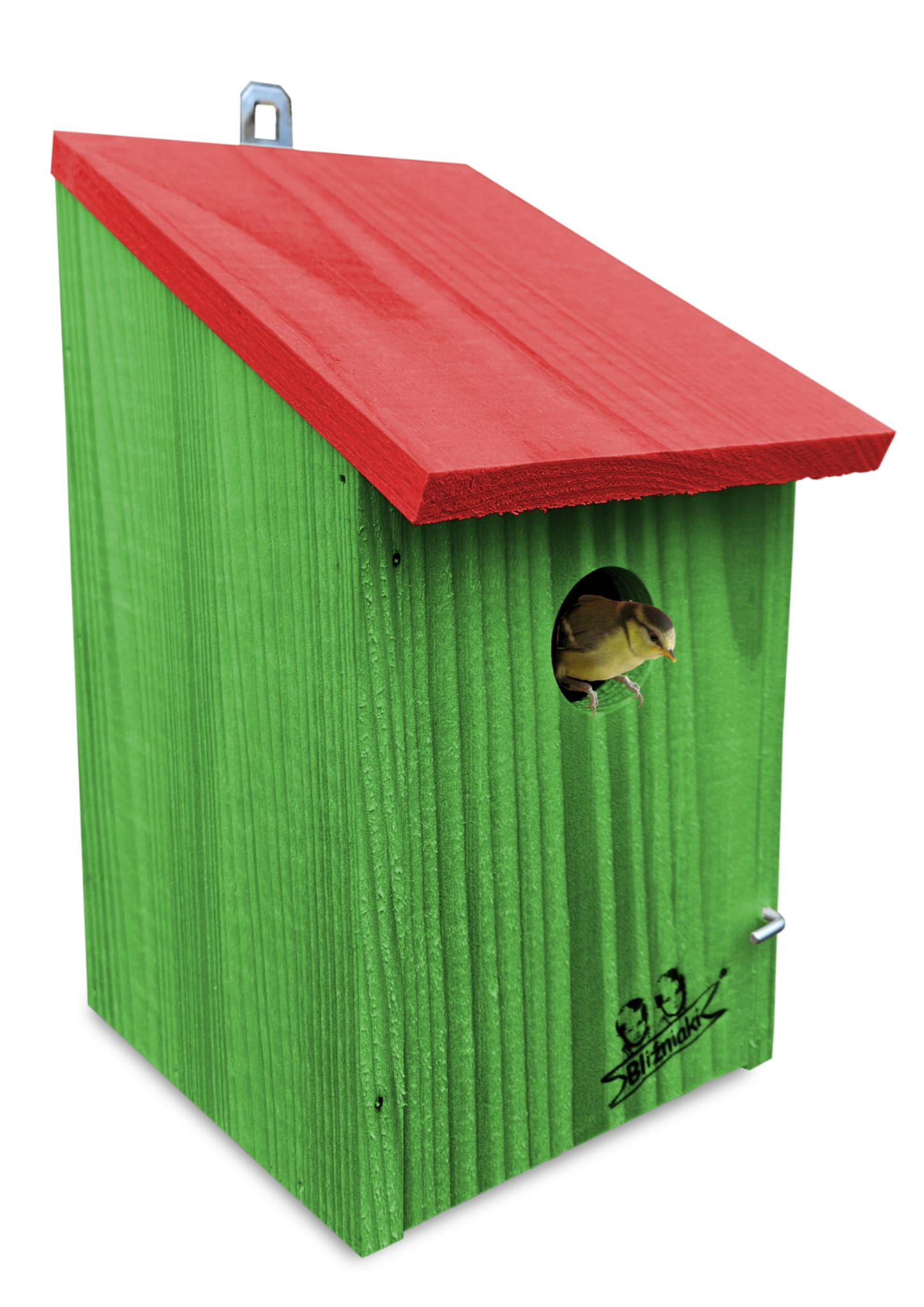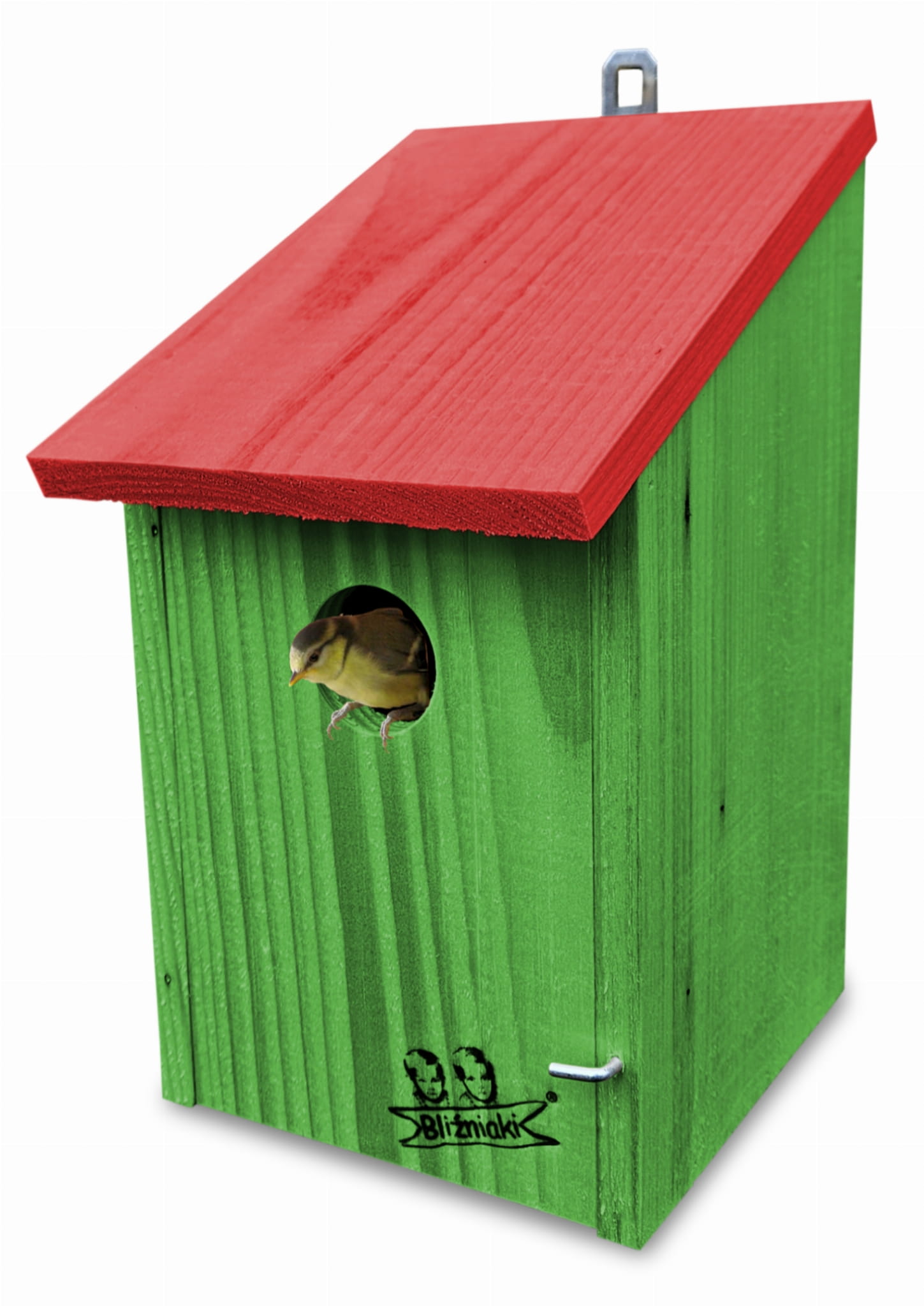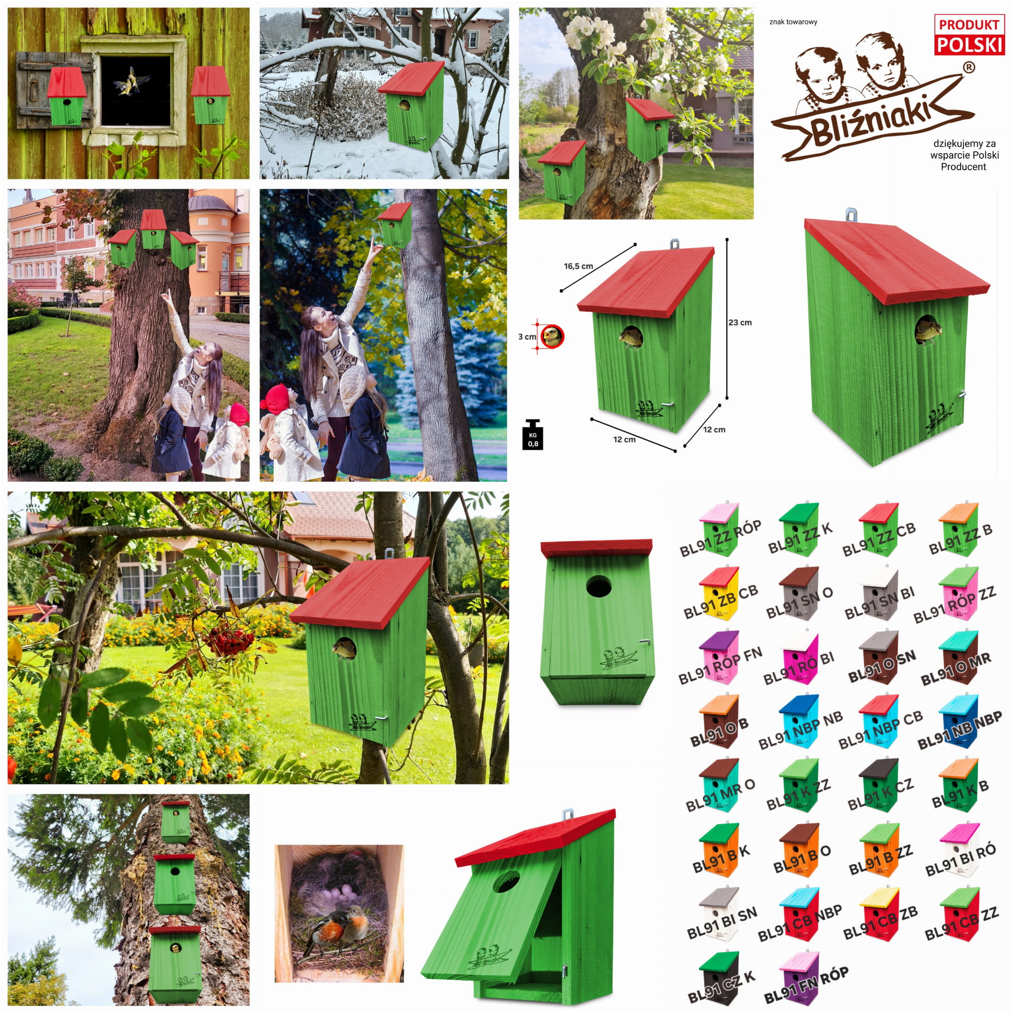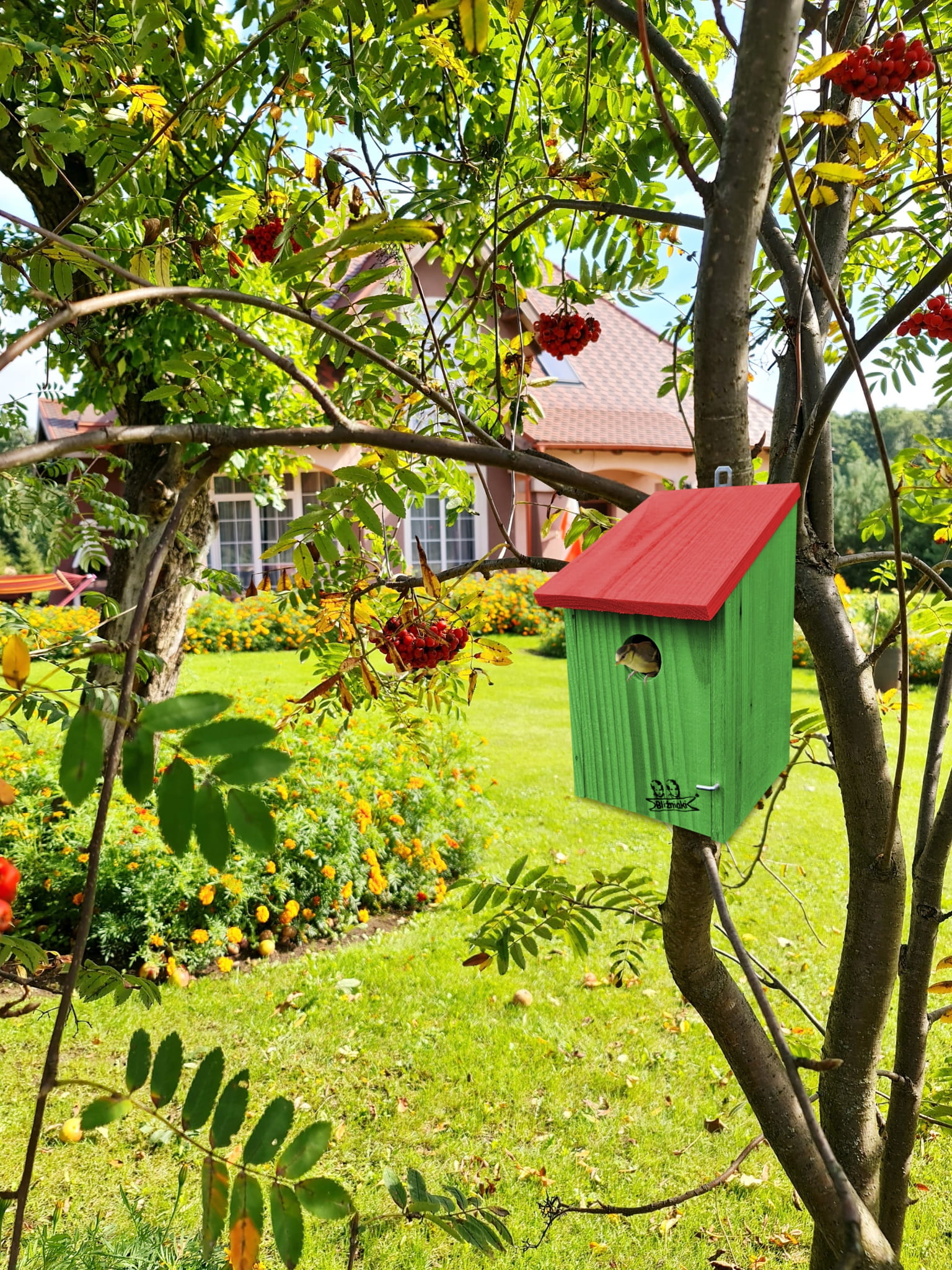 W przeważającej części skrzynka lęgowa jest w kolorze JASNYM ZIELONYM, dach pokryty został kolorem CZERWONYM.