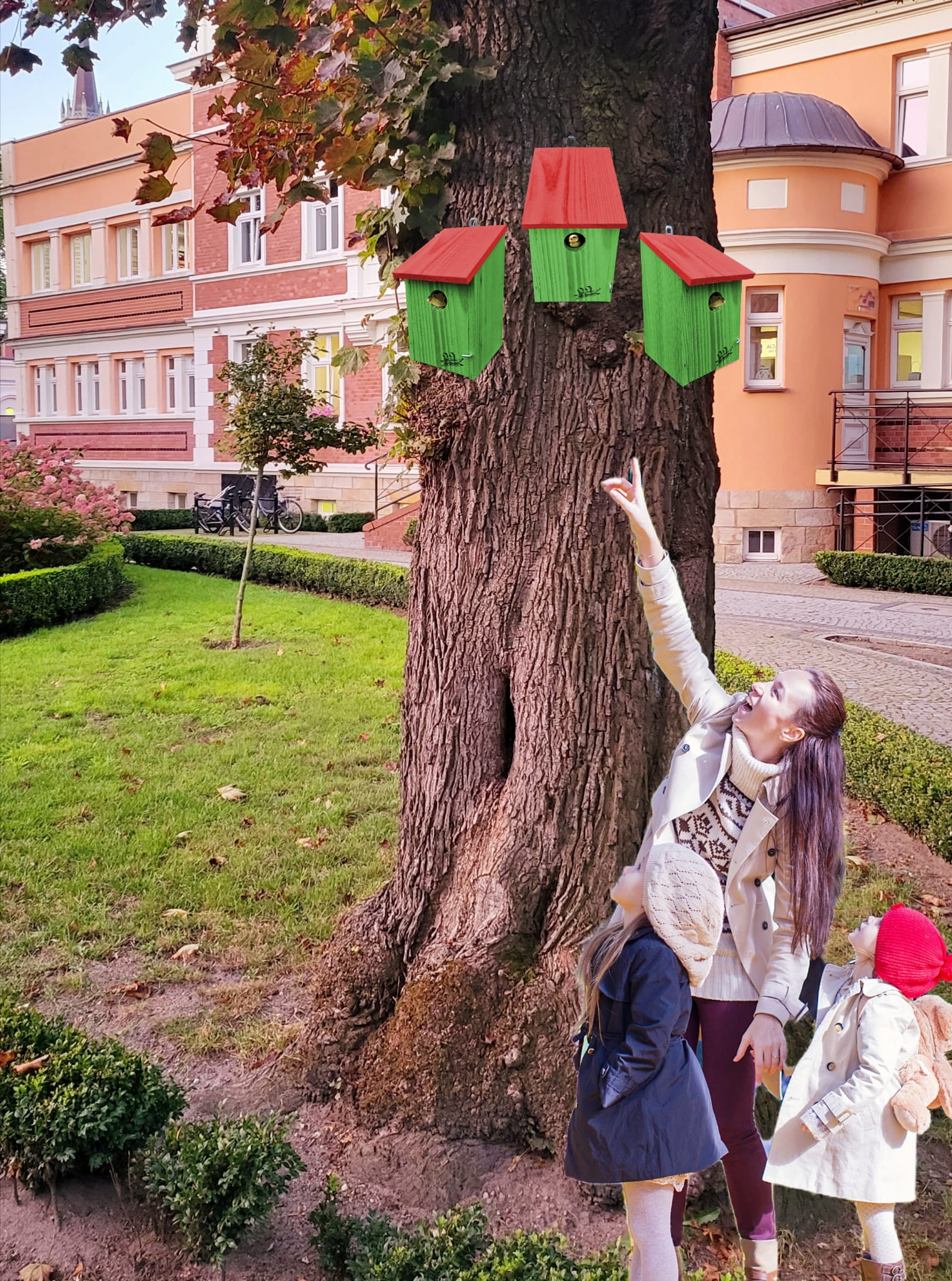 Budki lęgowe, które imitują dziuplę w drzewie warto umieścić w miejscu zacienionym, spokojnym, w odległości ok. 2 m od siebie.