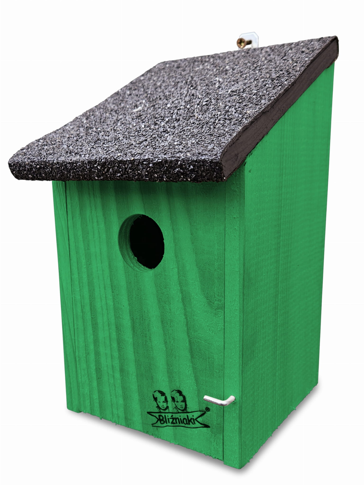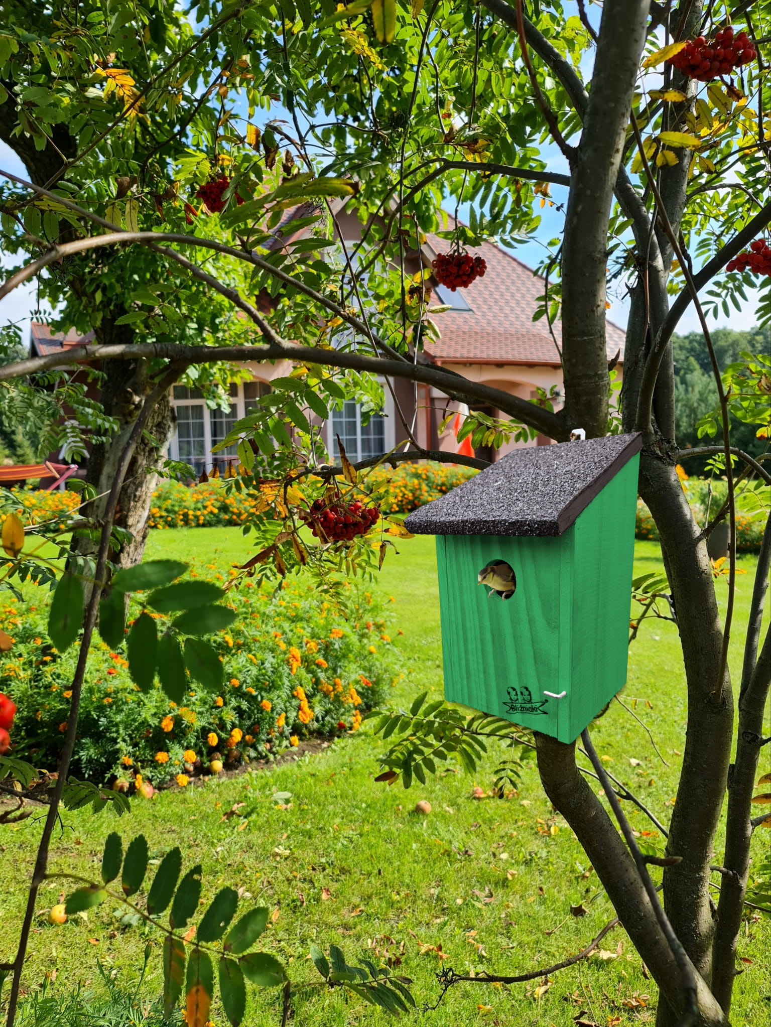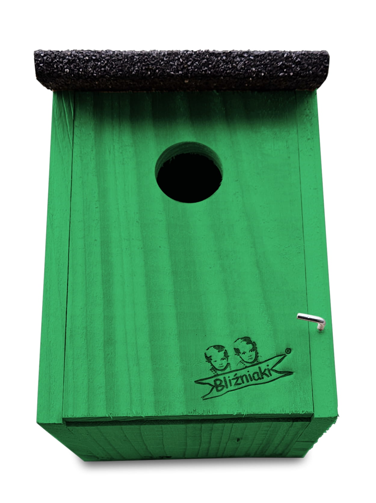W przeważającej części skrzynka lęgowa jest w kolorze ZIELONYM, dach został pokryty PAPĄ BITUMICZNĄ w kolorze CZARNYM.
