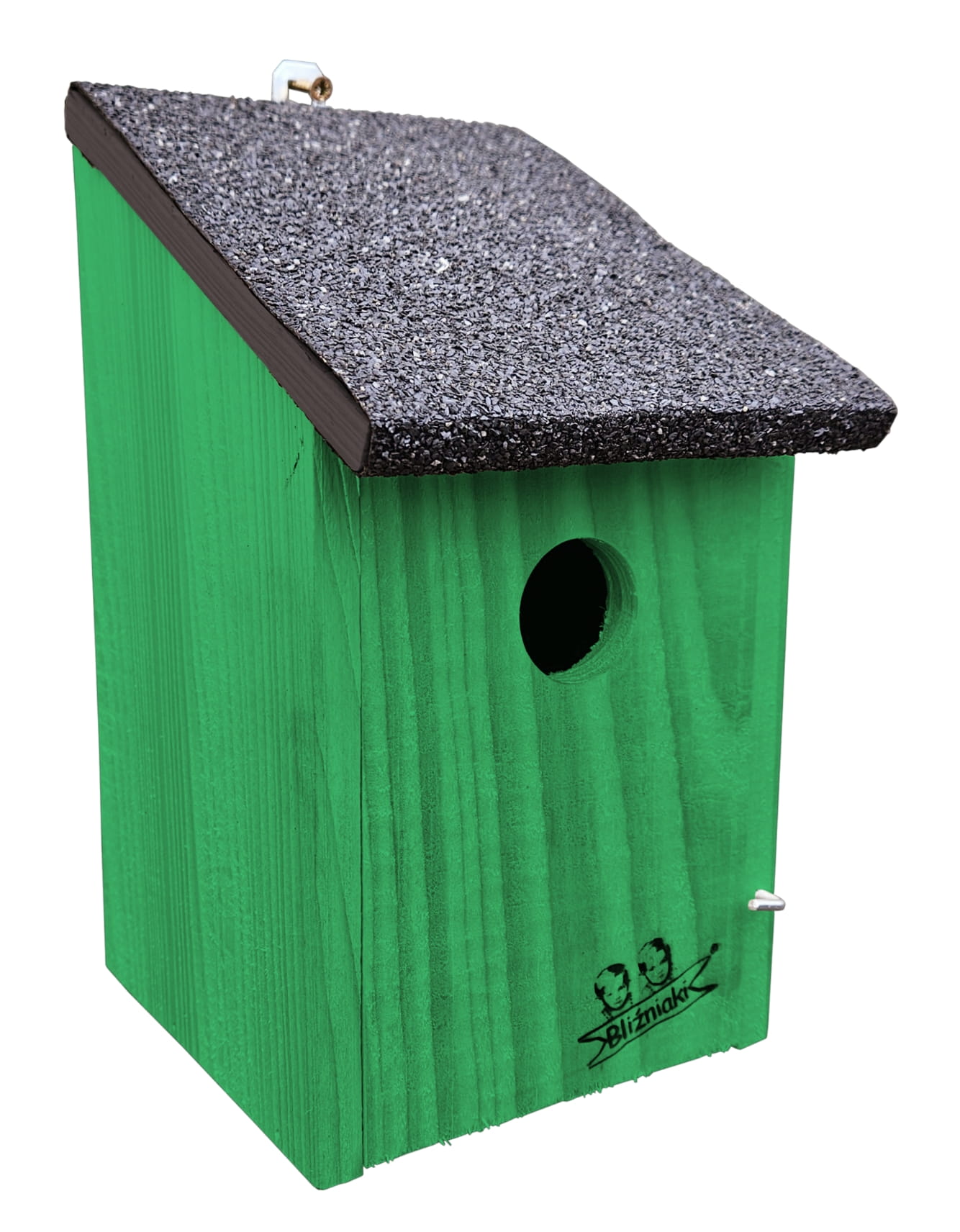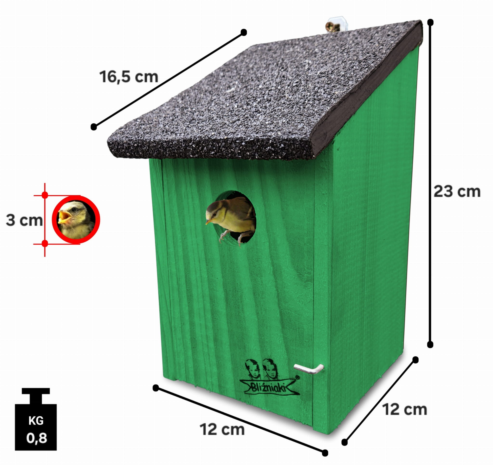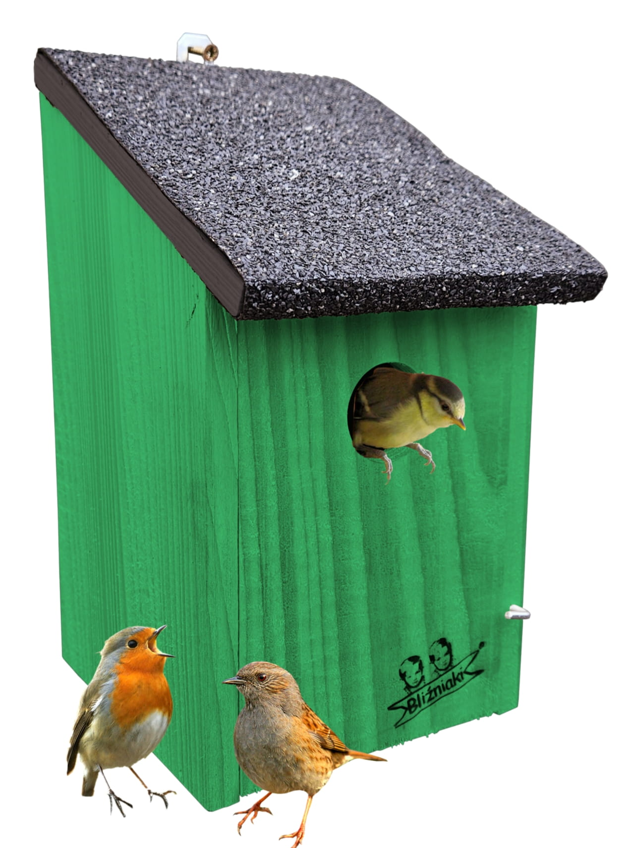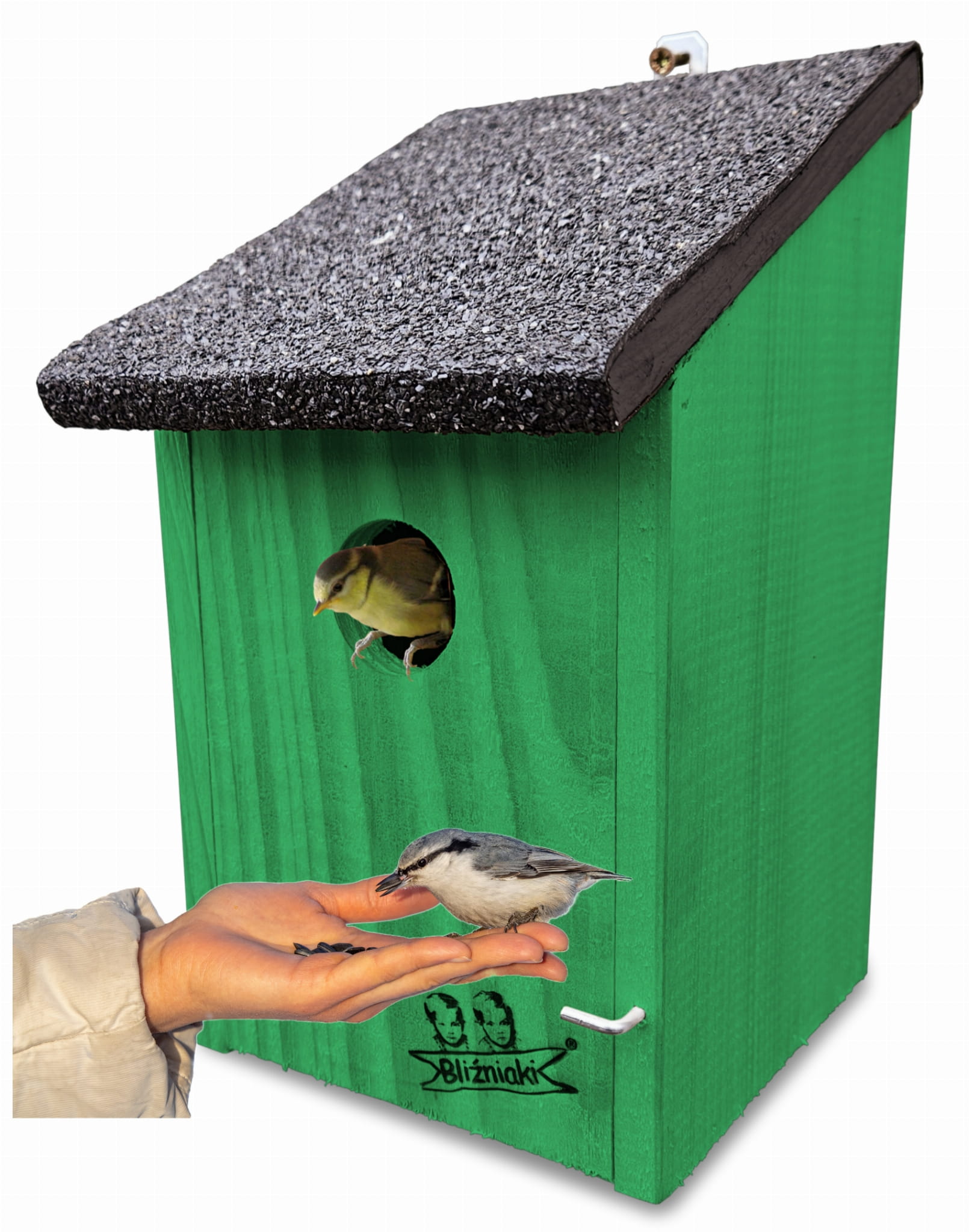 W przeważającej części skrzynka lęgowa jest w kolorze ZIELONYM, dach został pokryty PAPĄ BITUMICZNĄ w kolorze CZARNYM.