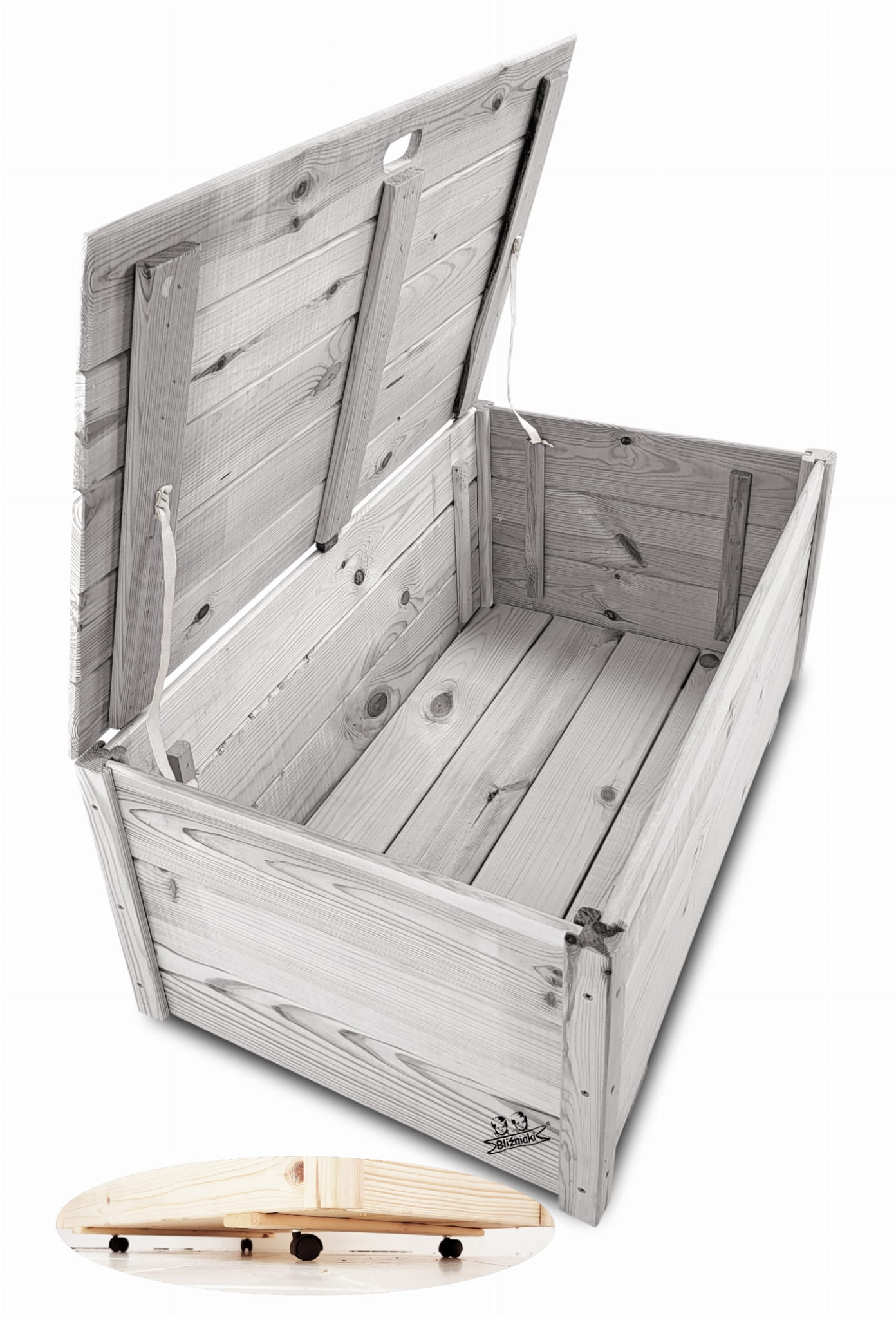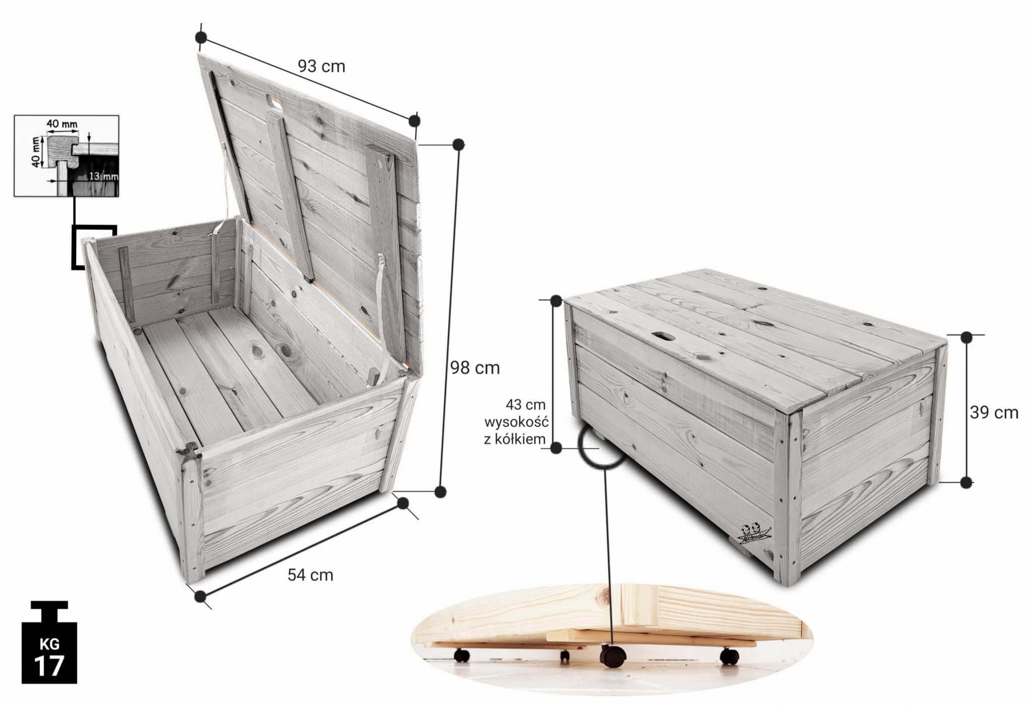 Produkt wykonany został z suszonego drewna sosnowego. Zabezpieczony metodą impregnowania. Środek na bazie wody użyty do impregnacji jest w pełni ekologiczny i bezpieczny dla ludzi i zwierząt. Zabezpieczone w taki sposób drewno sprawia, że skrzynia jest odporna na szkodliwe działanie wody oraz wilgoci, promieni UV, a także grzybów i pleśni, może być więc przechowywana przez cały rok na zewnątrz. Produkt w jednolitym kolorze PASTELOWYM SZARYM.