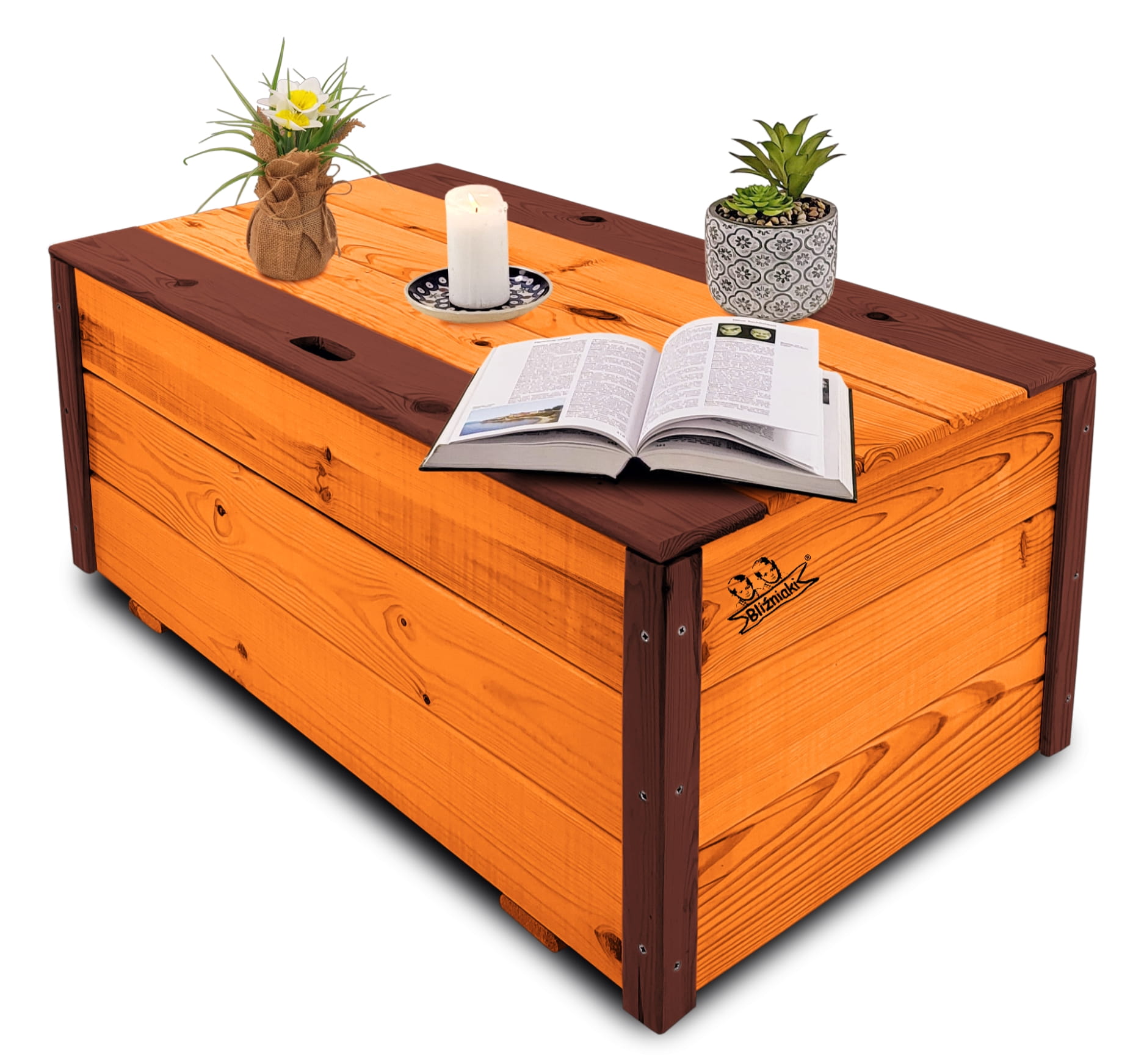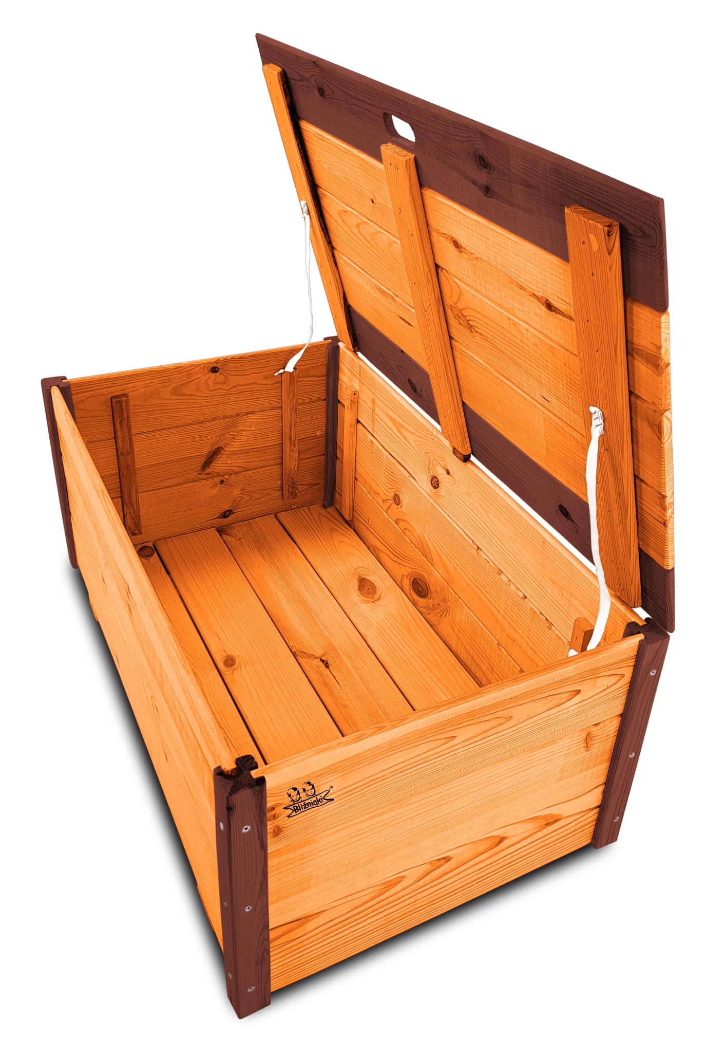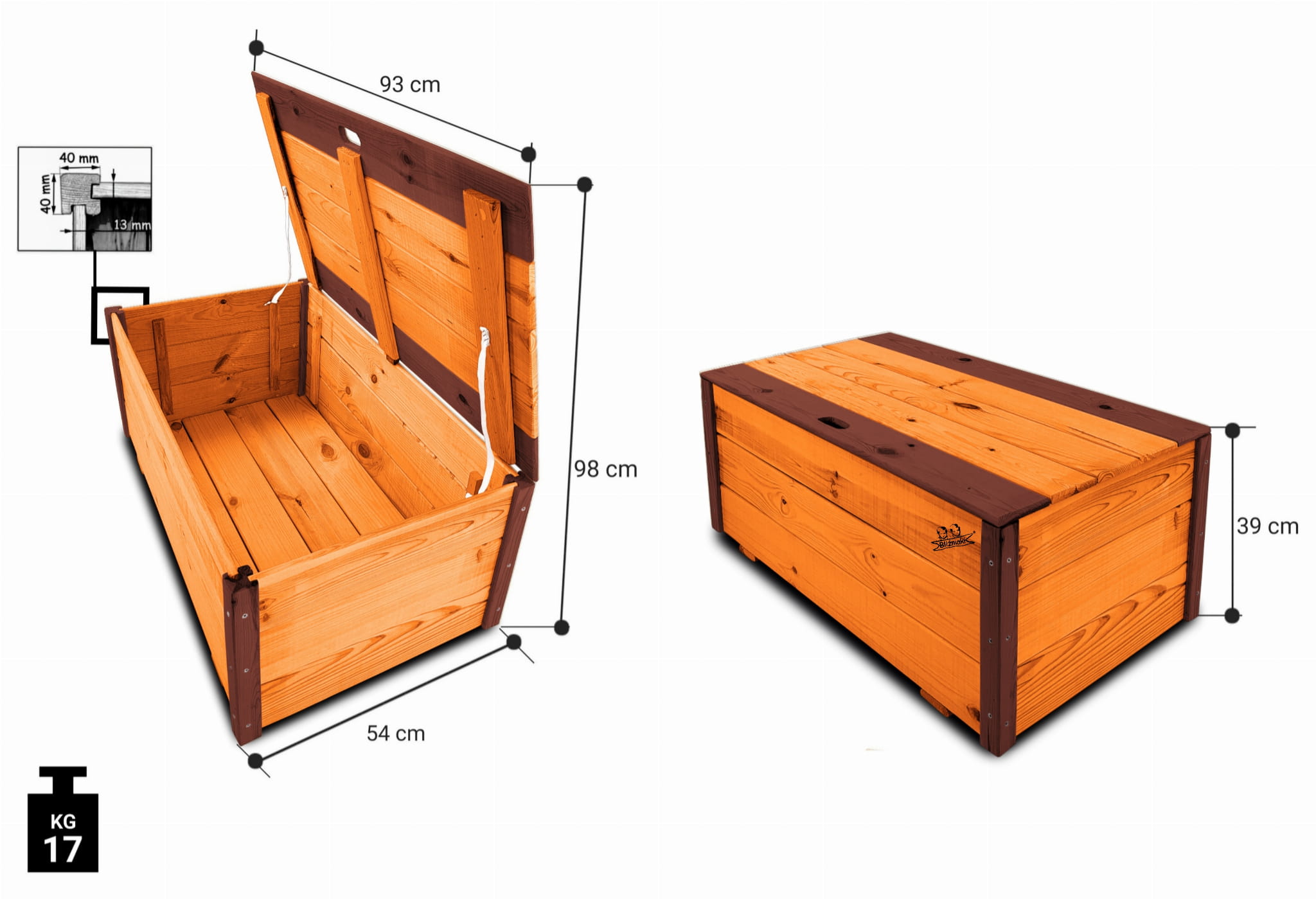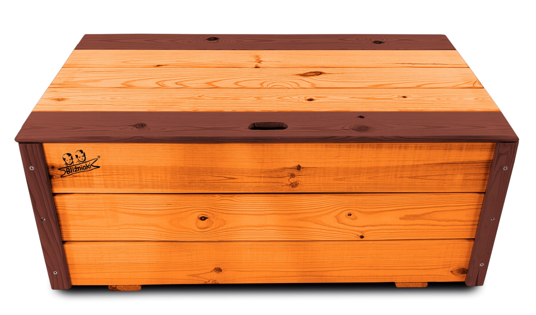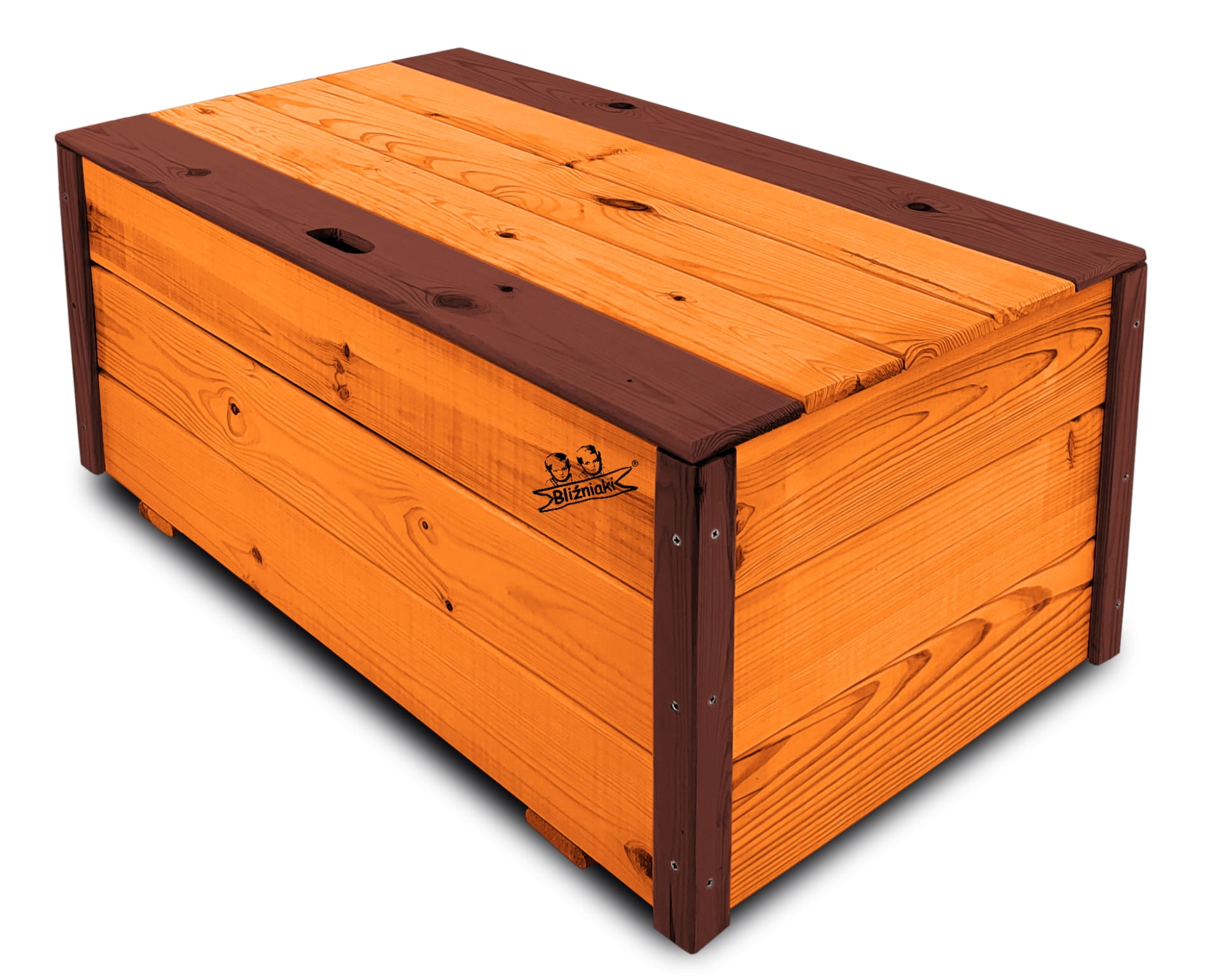 Produkt wykonany został z suszonego drewna sosnowego. Zabezpieczony metodą impregnowania. Środek na bazie wody użyty do impregnacji jest w pełni ekologiczny i bezpieczny dla ludzi i zwierząt. Zabezpieczone w taki sposób drewno sprawia, że skrzynia jest odporna na szkodliwe działanie wody oraz wilgoci, promieni UV, a także grzybów i pleśni, może być więc przechowywana przez cały rok na zewnątrz. Produkt dwukolorowy, w podstawowej przeważającej części w kolorze OLCHOWYM, został wykończony w kątownikach i listwach kolorem ORZECHOWYM.