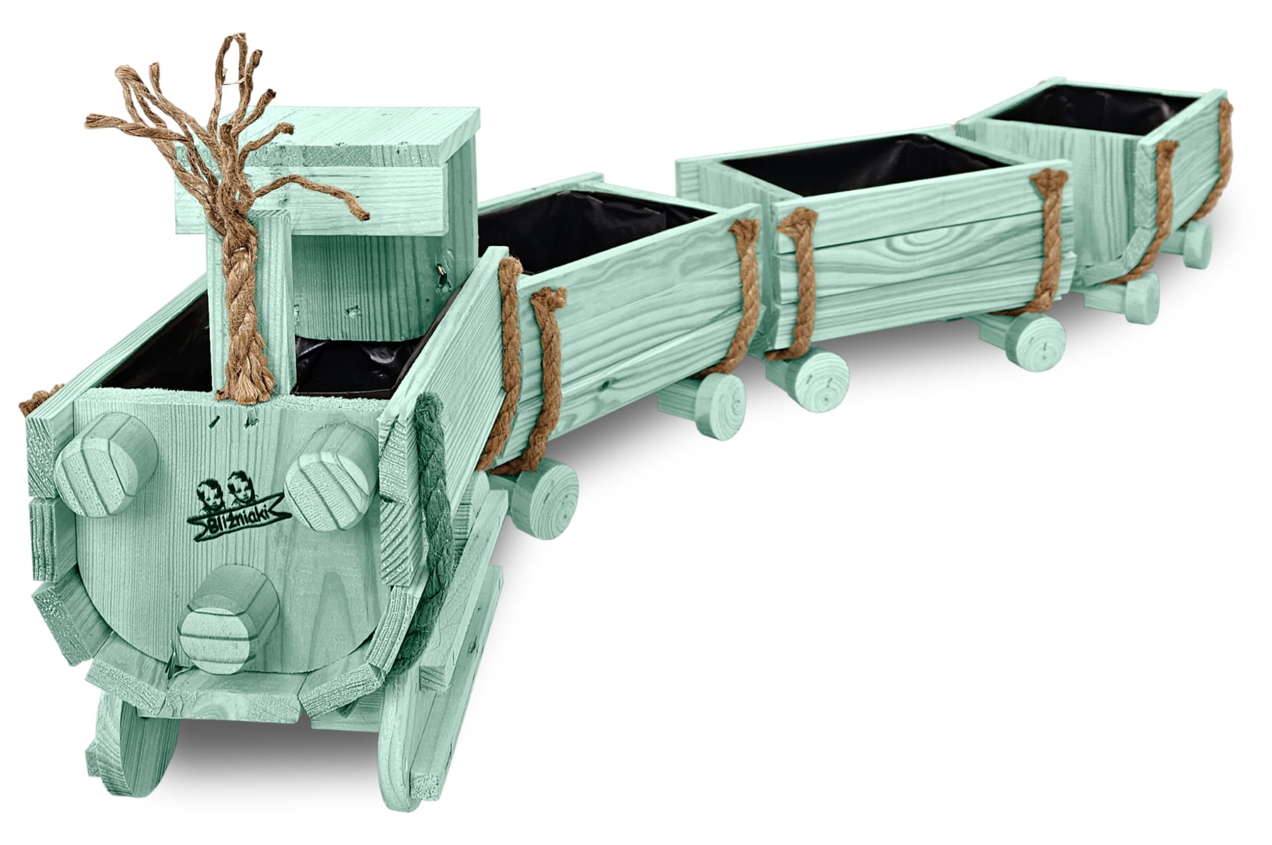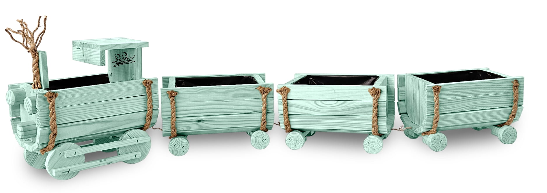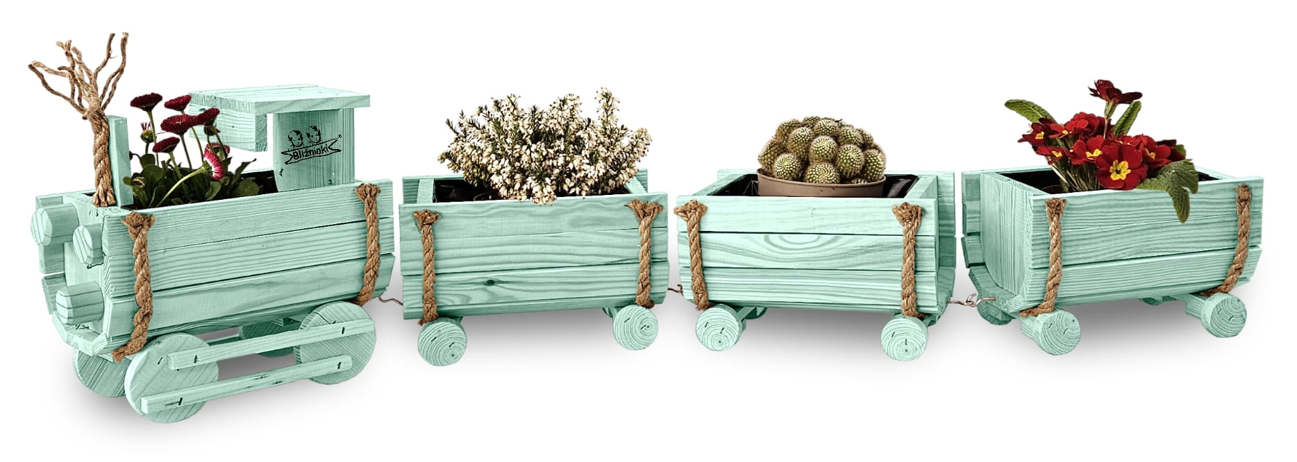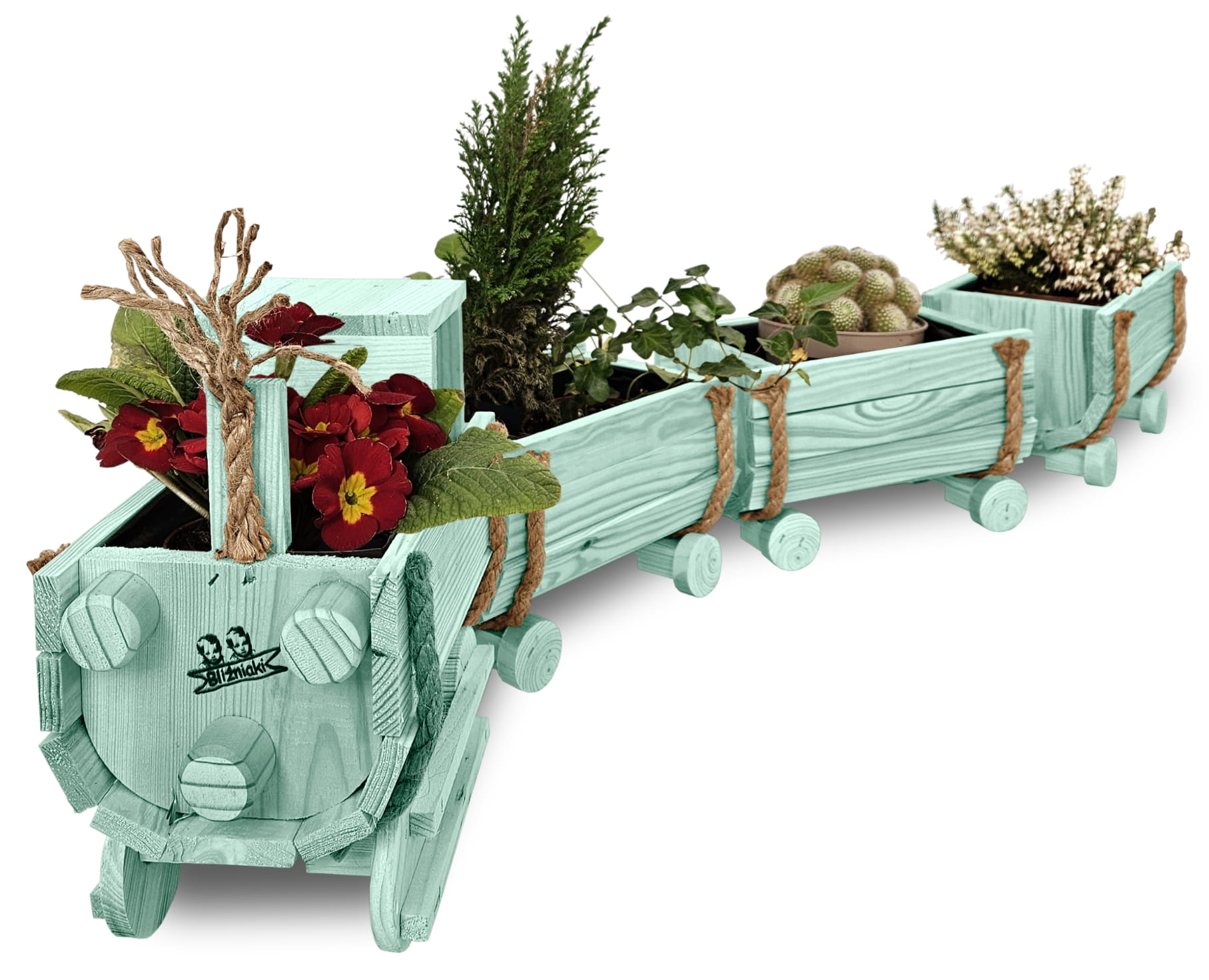 DREWNIANY KWIETNIK W KSZTAŁCIE POCIĄGU Z LOKOMOTYWĄ I WAGONAMI