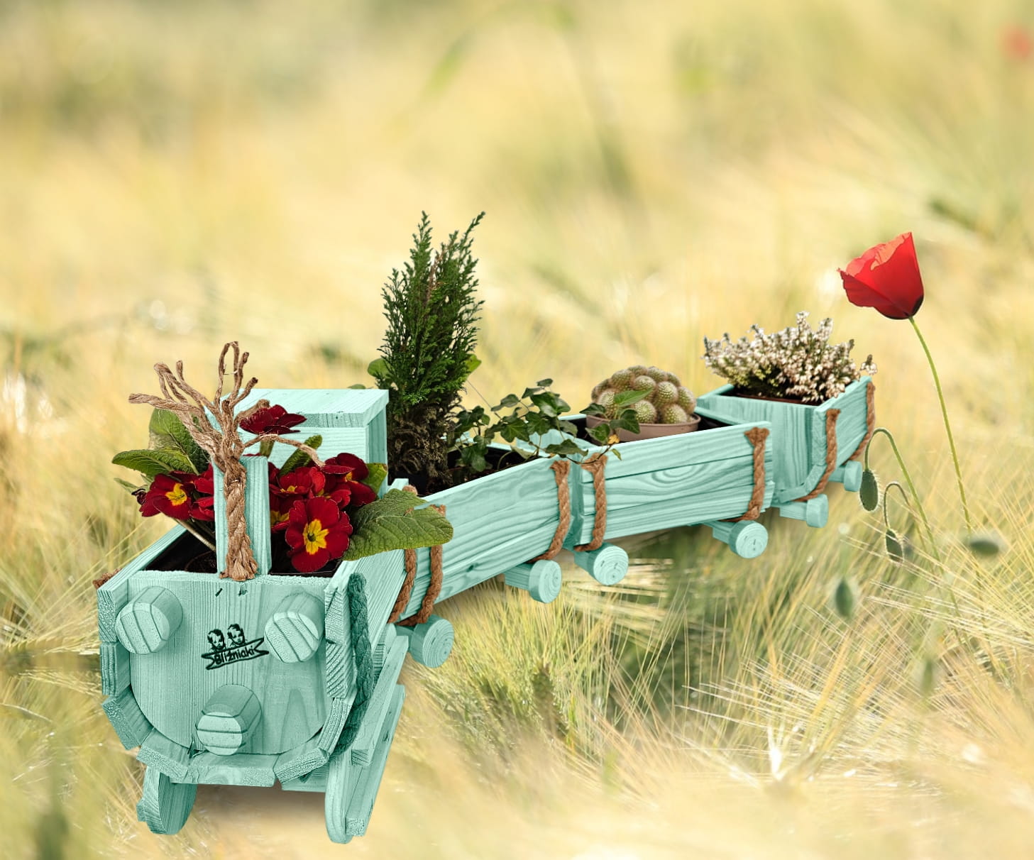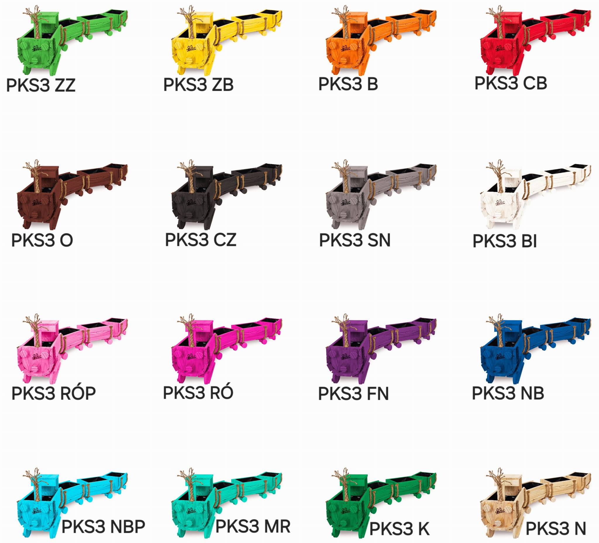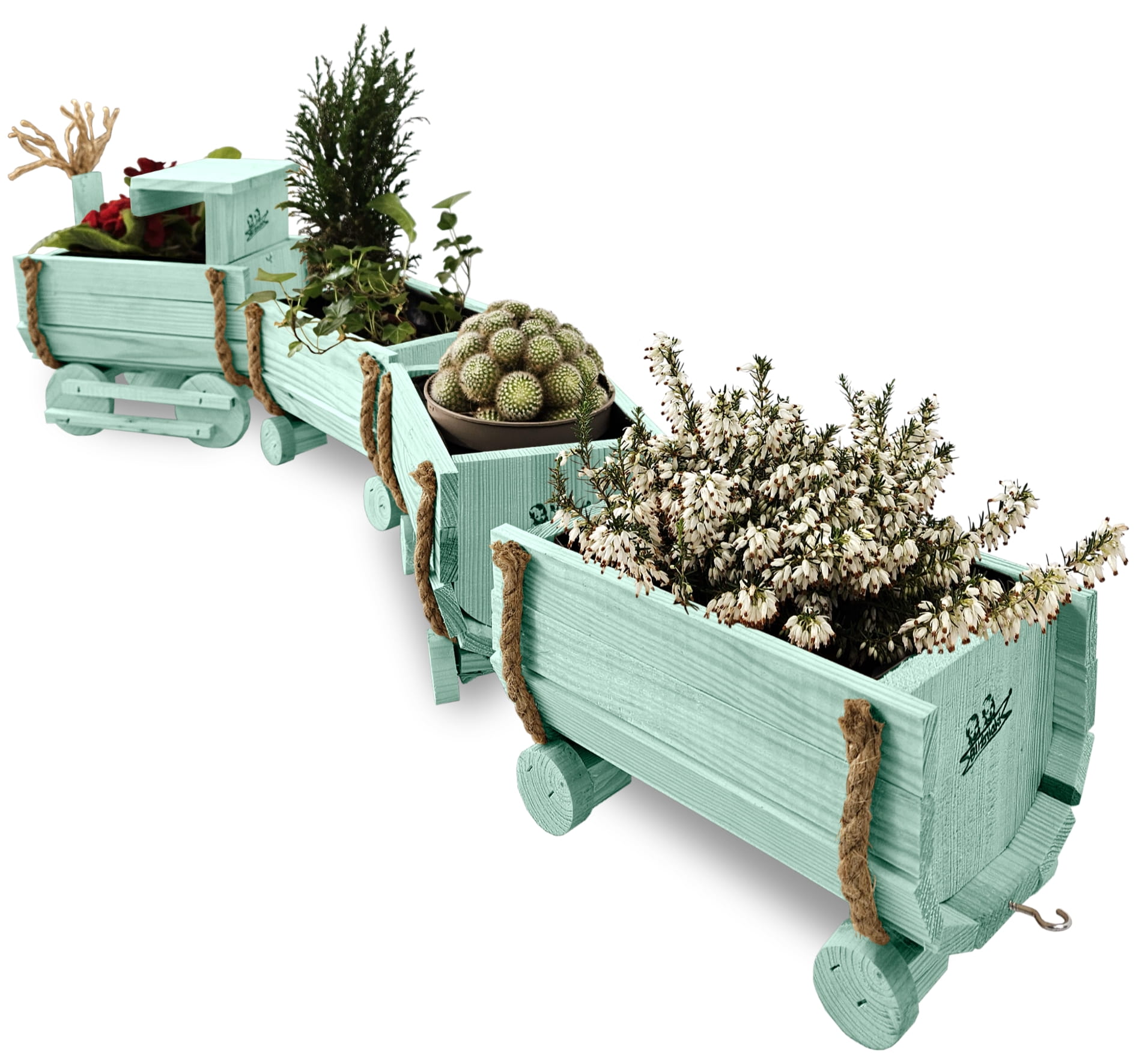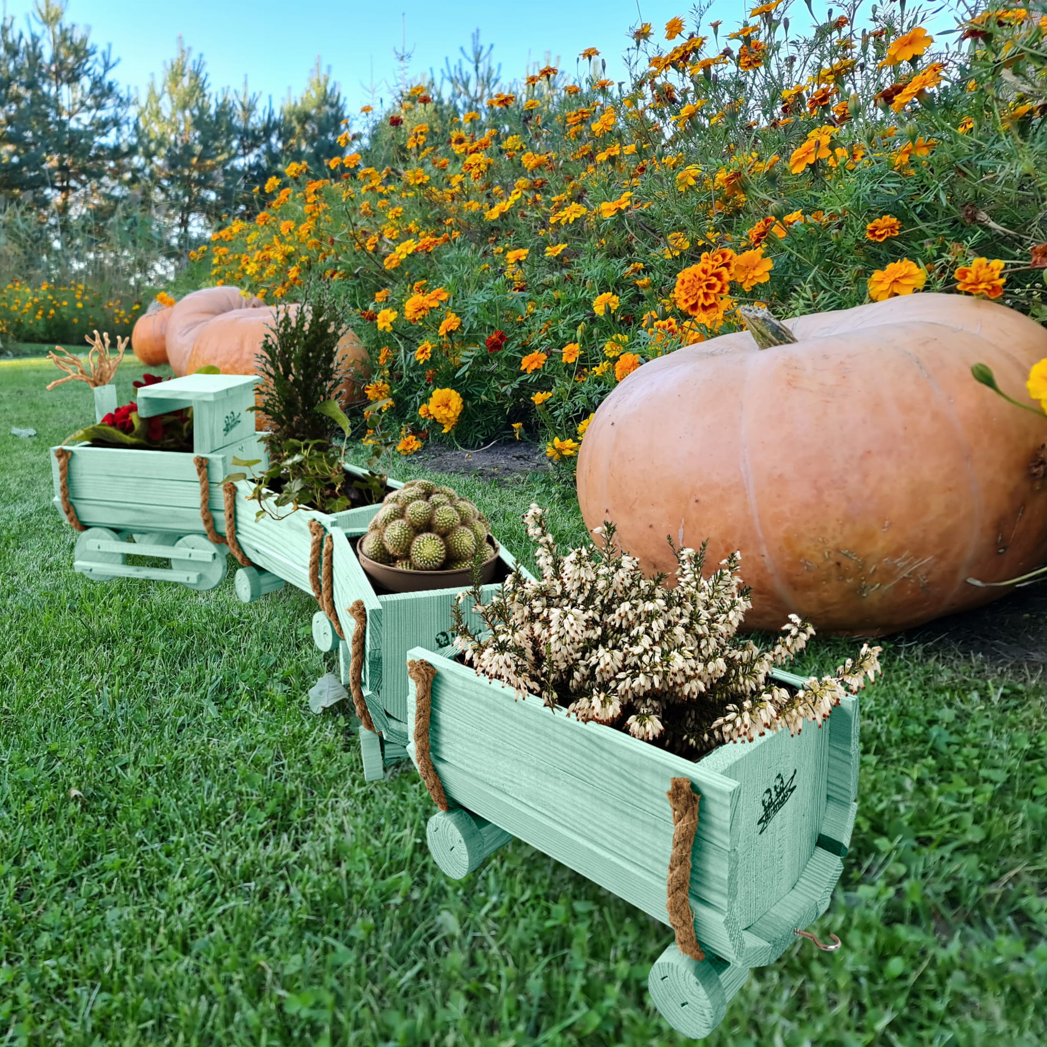 DREWNIANY KWIETNIK W KSZTAŁCIE POCIĄGU Z LOKOMOTYWĄ I WAGONAMI