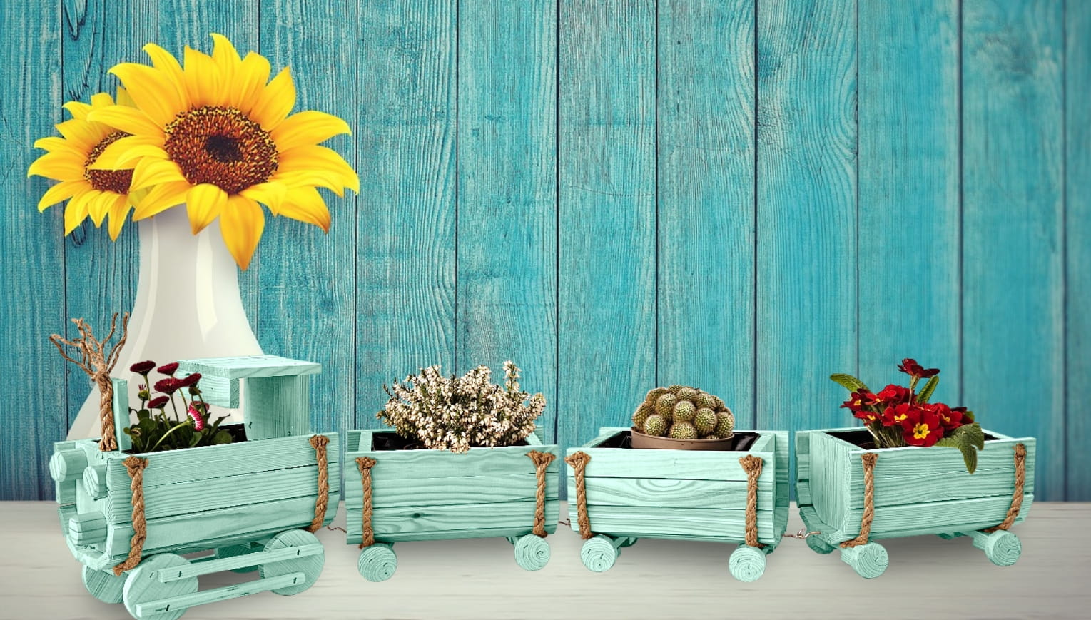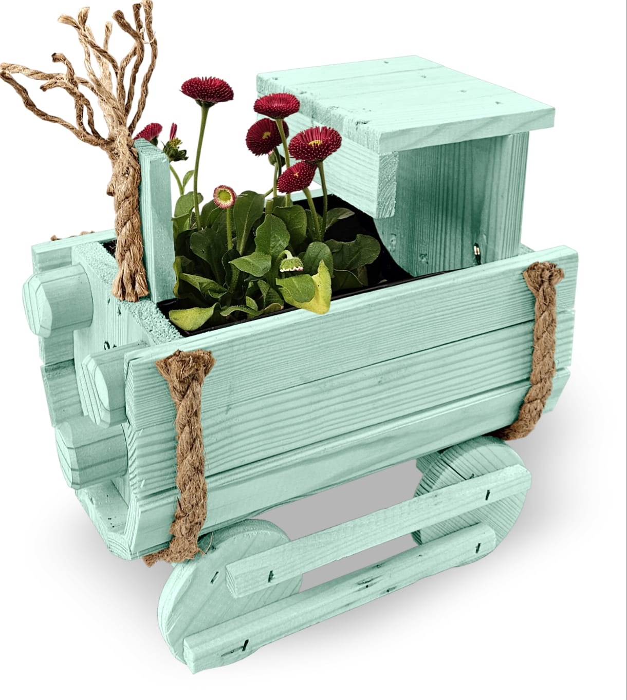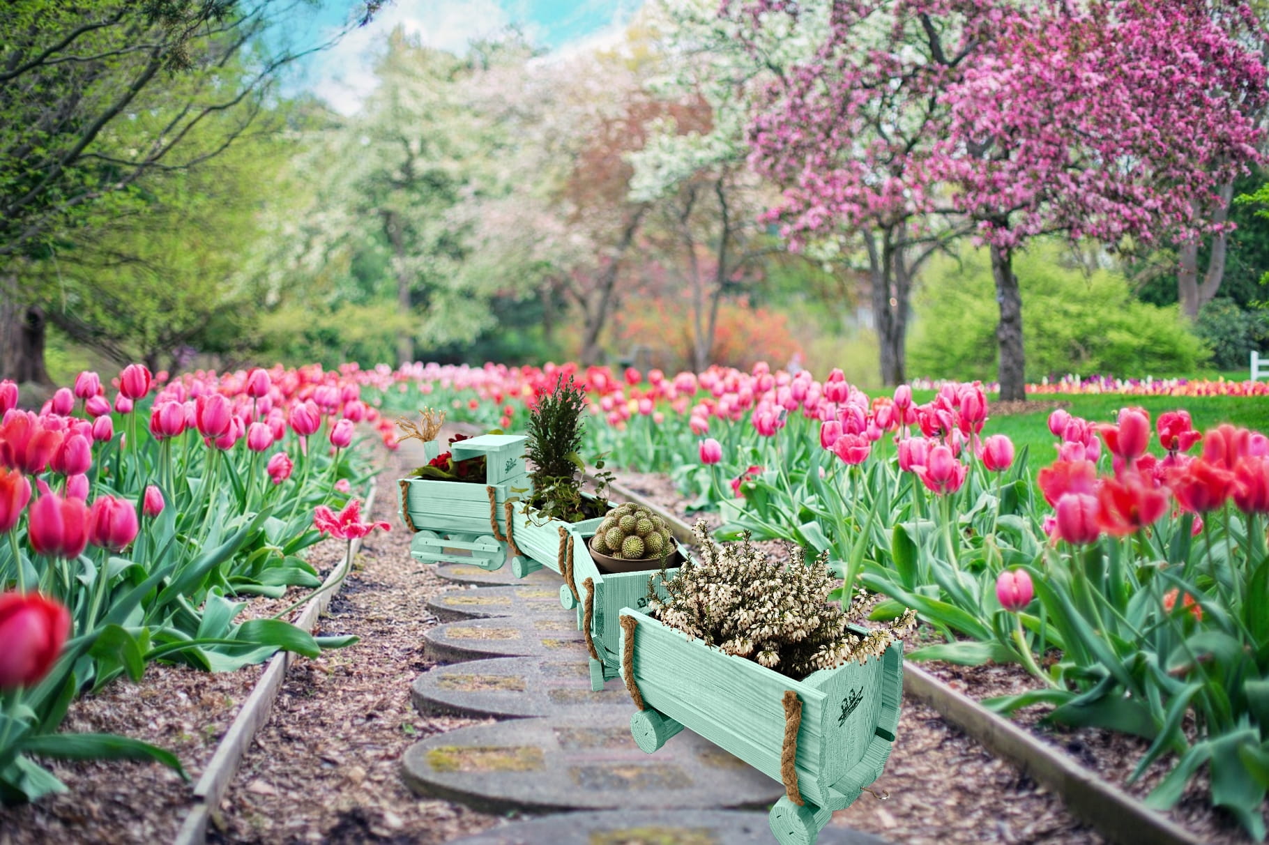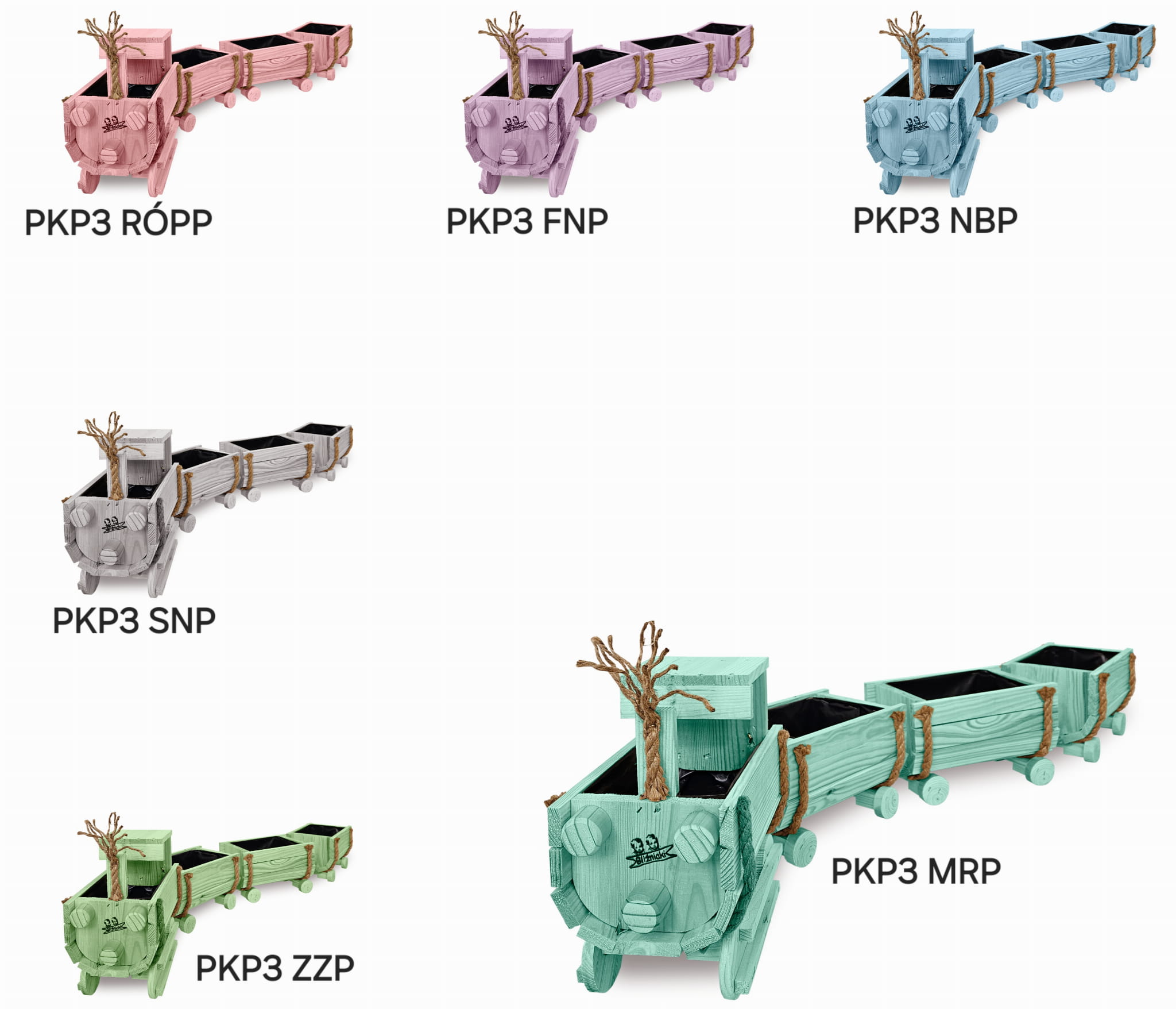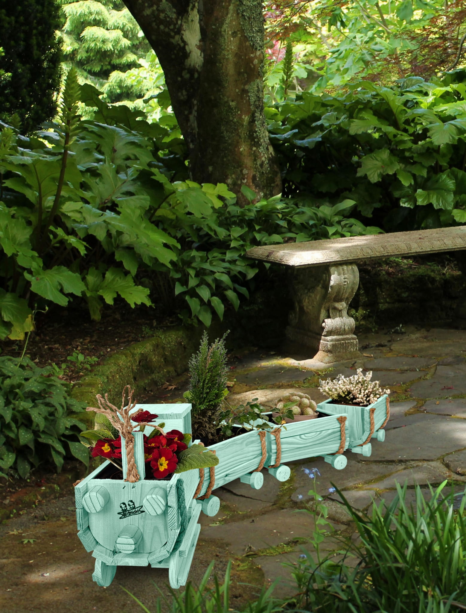DREWNIANY KWIETNIK W KSZTAŁCIE POCIĄGU Z LOKOMOTYWĄ I WAGONAMI