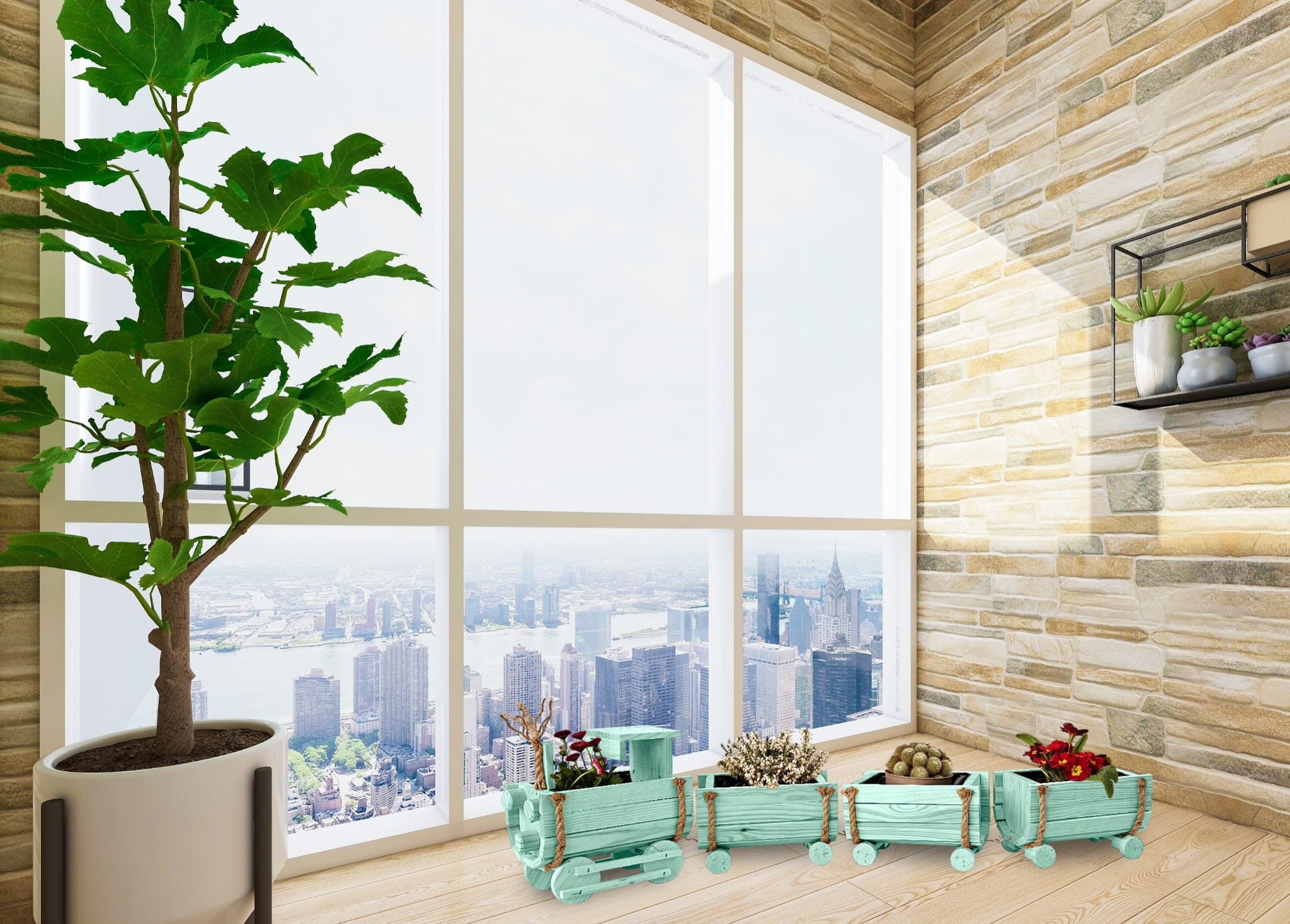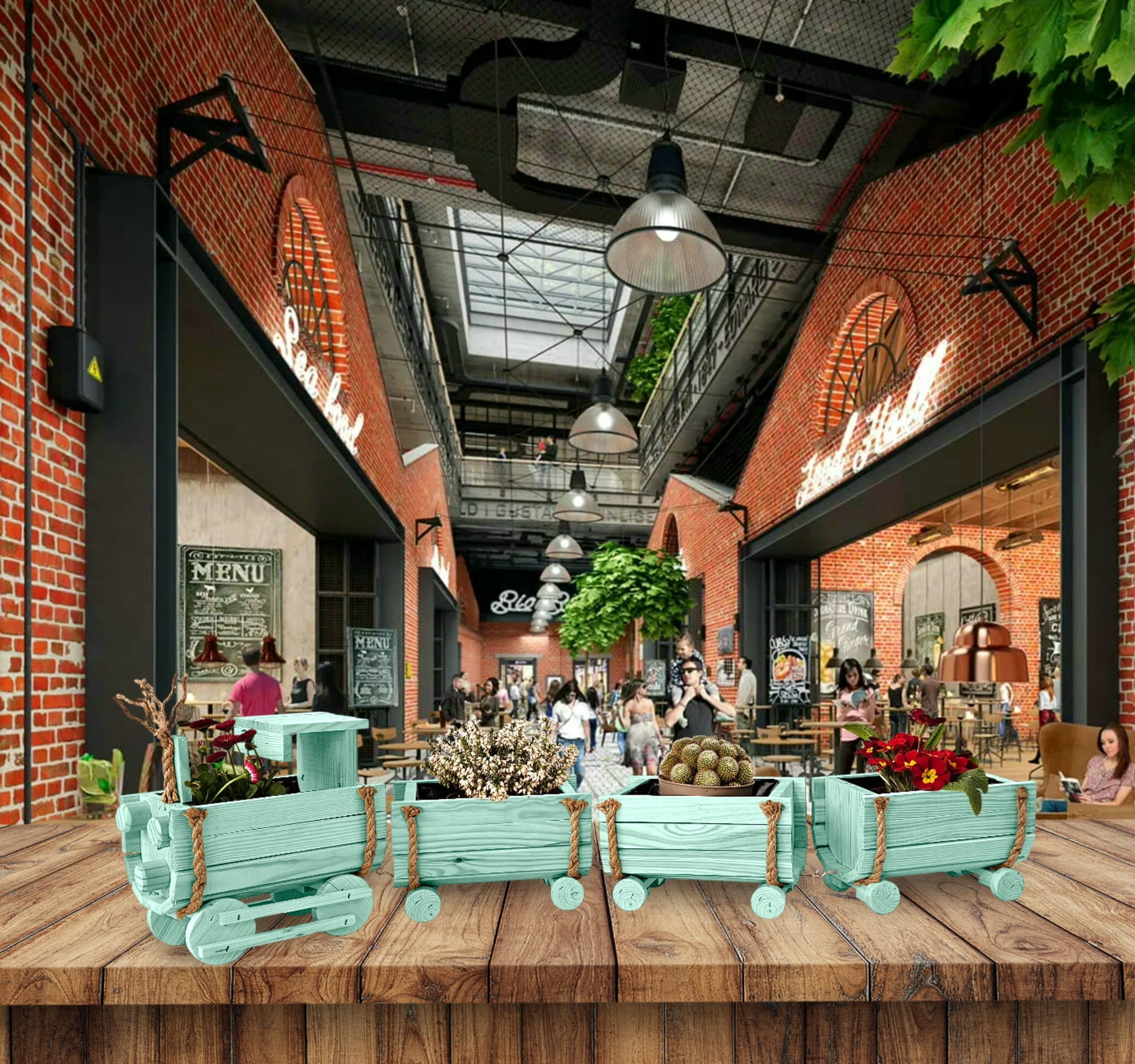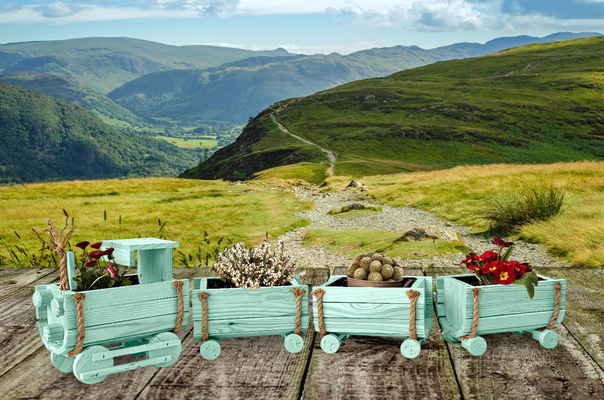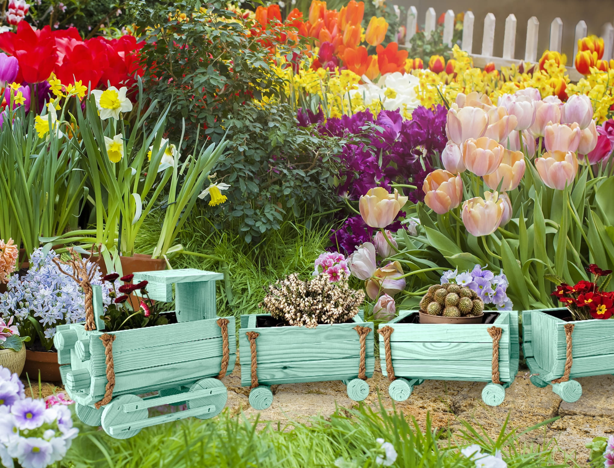 DREWNIANY KWIETNIK W KSZTAŁCIE POCIĄGU Z LOKOMOTYWĄ I WAGONAMI