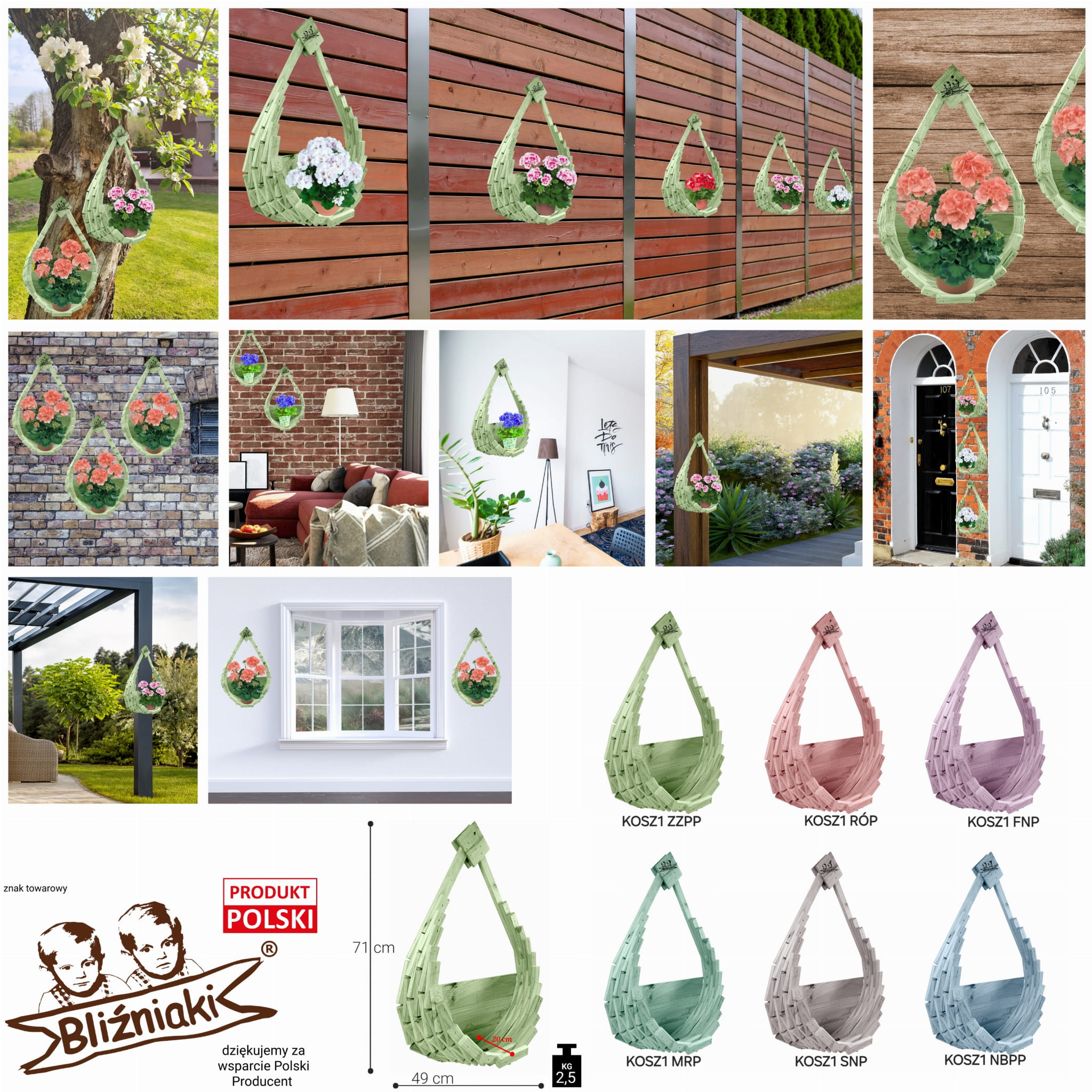Kosz może zostać w łatwy sposób powieszony na elementach budynku, w ogrodzie, na pergolach lub postawiony na tarasie, w ogrodzie, w obejściu domu lub wewnątrz domu.