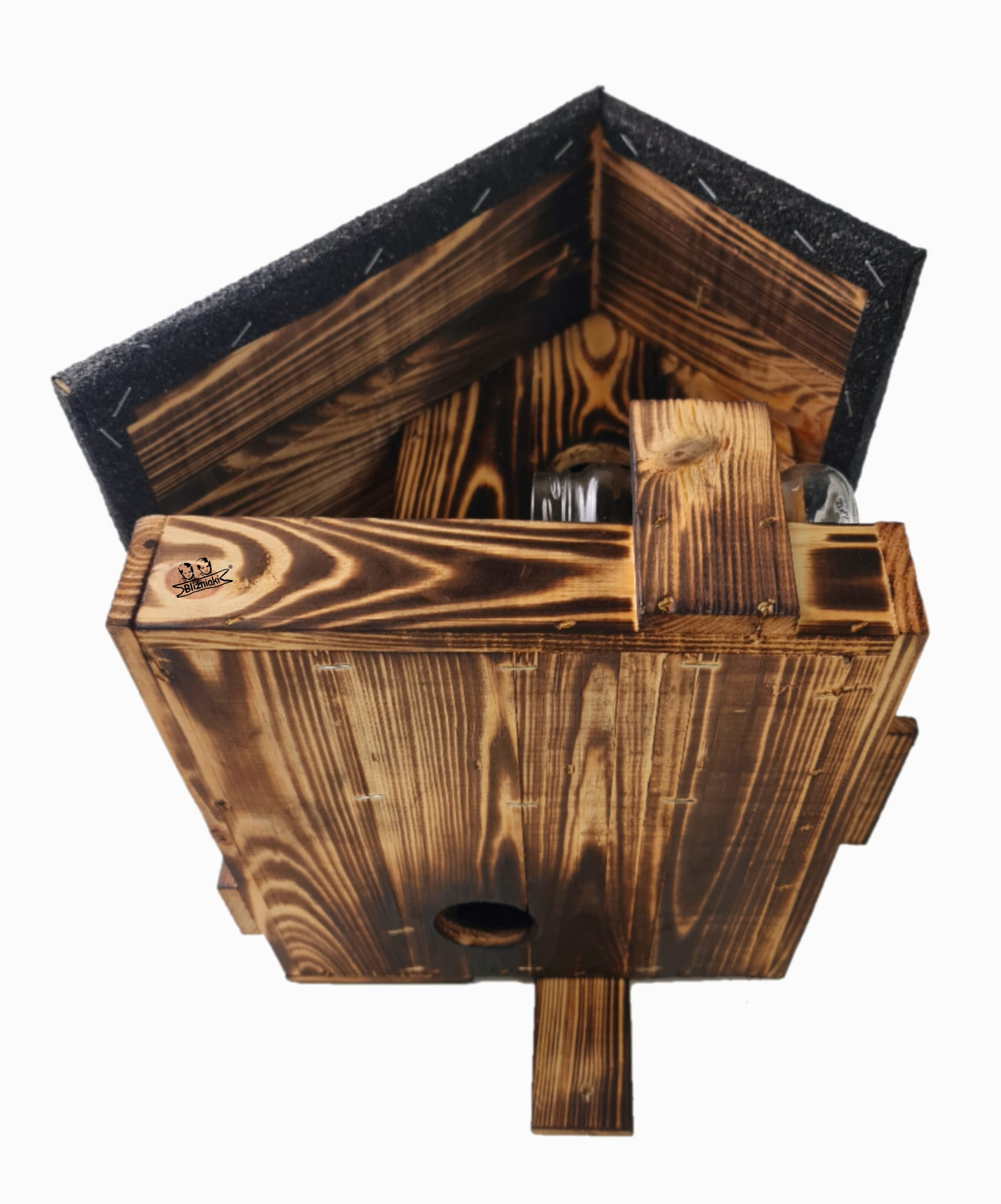 Budka wykonana jest w całości z drewna, impregnowana metodą opalania ogniem.