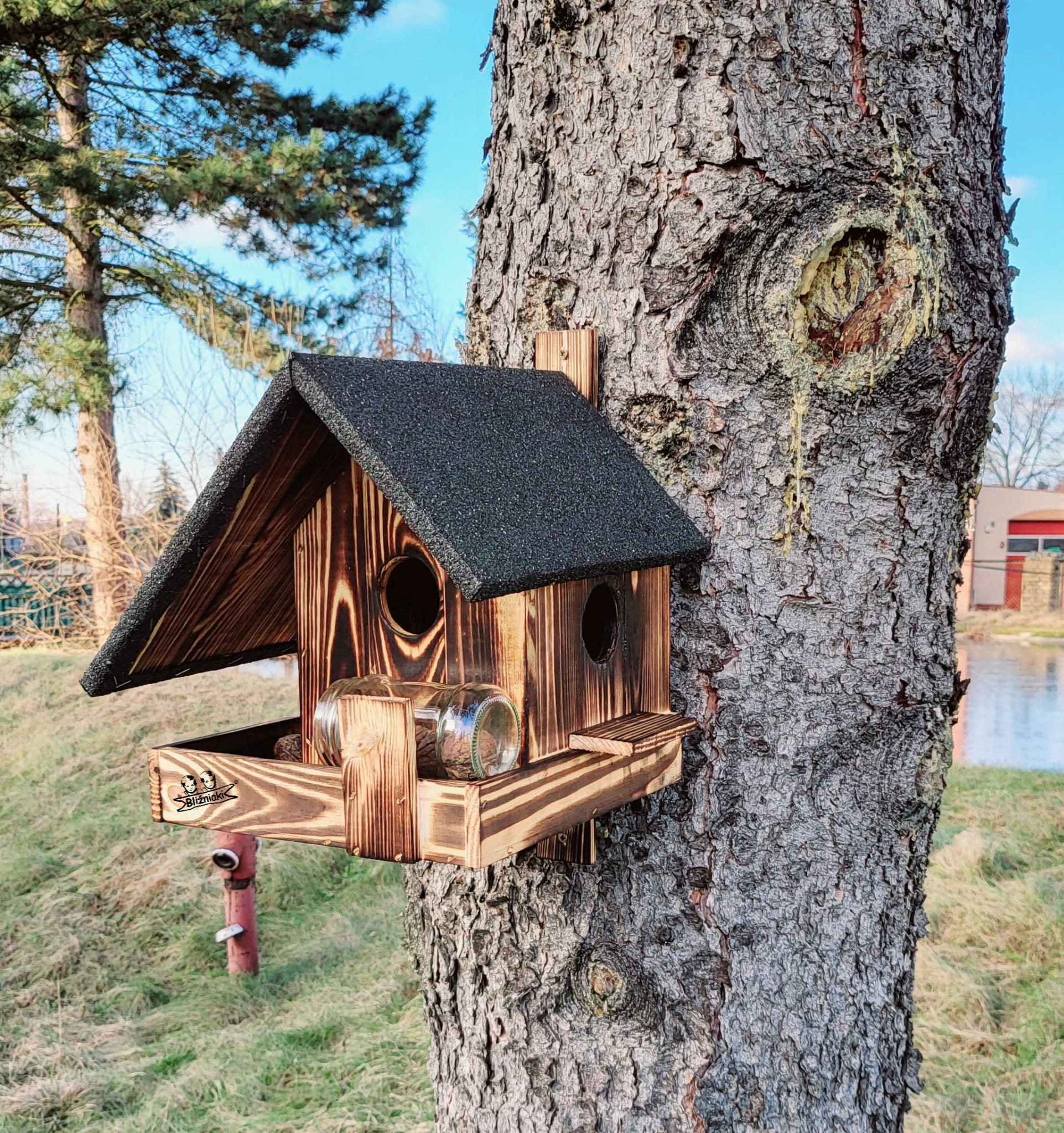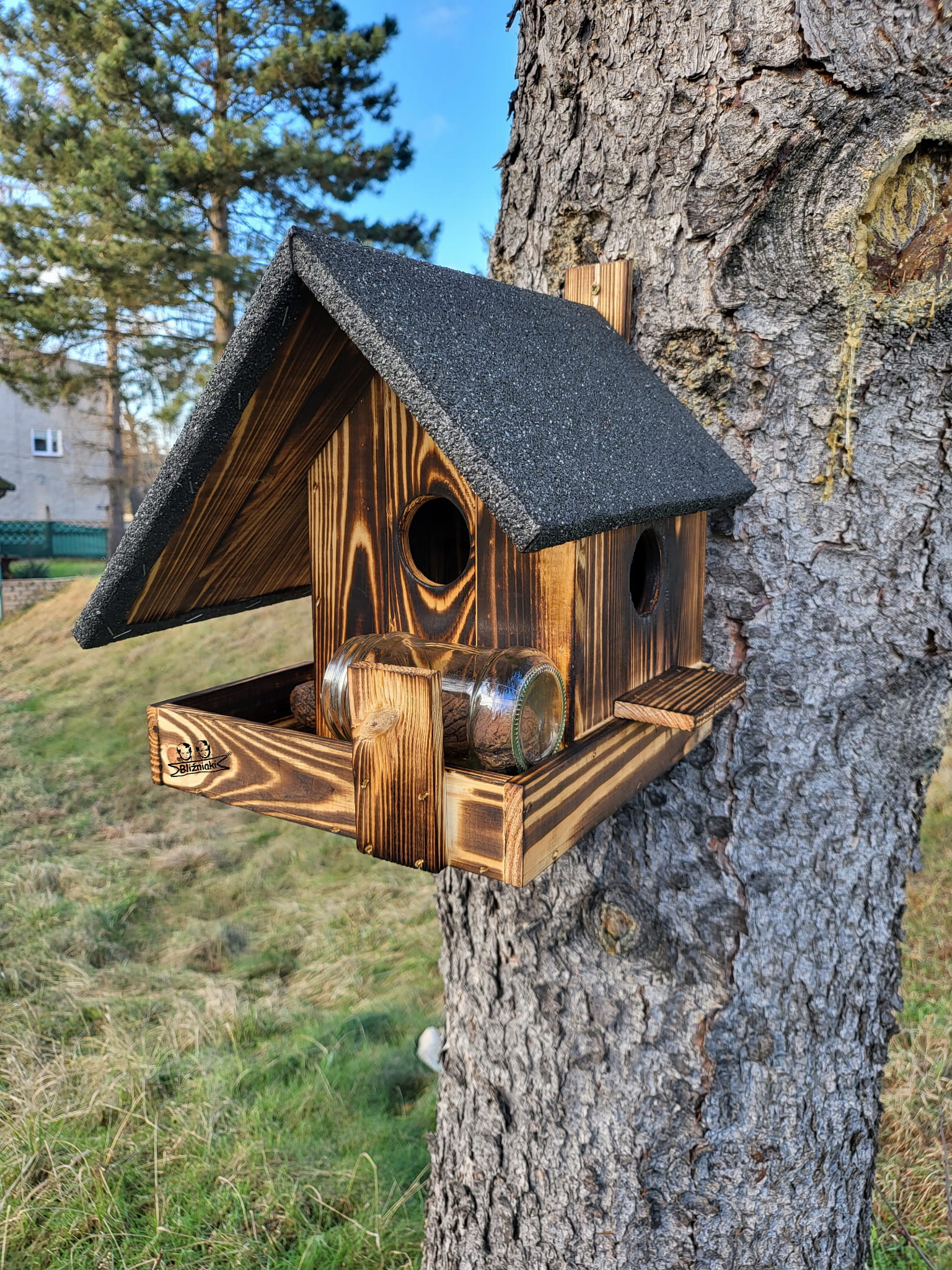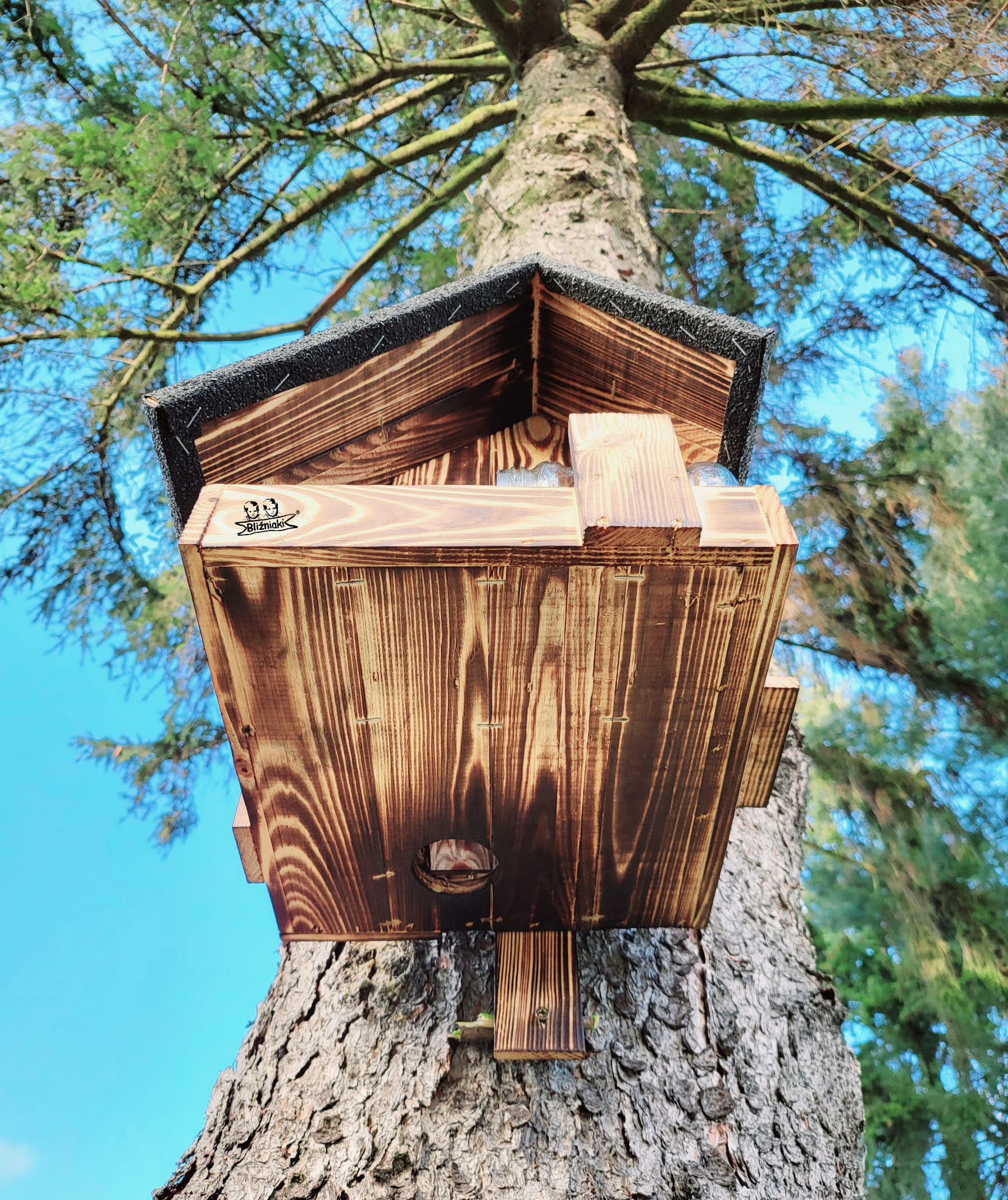 - Domek dla Wiewiórki wykonany jest z drewna solidnie zabezpieczonego metodą opalania ogniem. Na dachu położona jest PAPA.