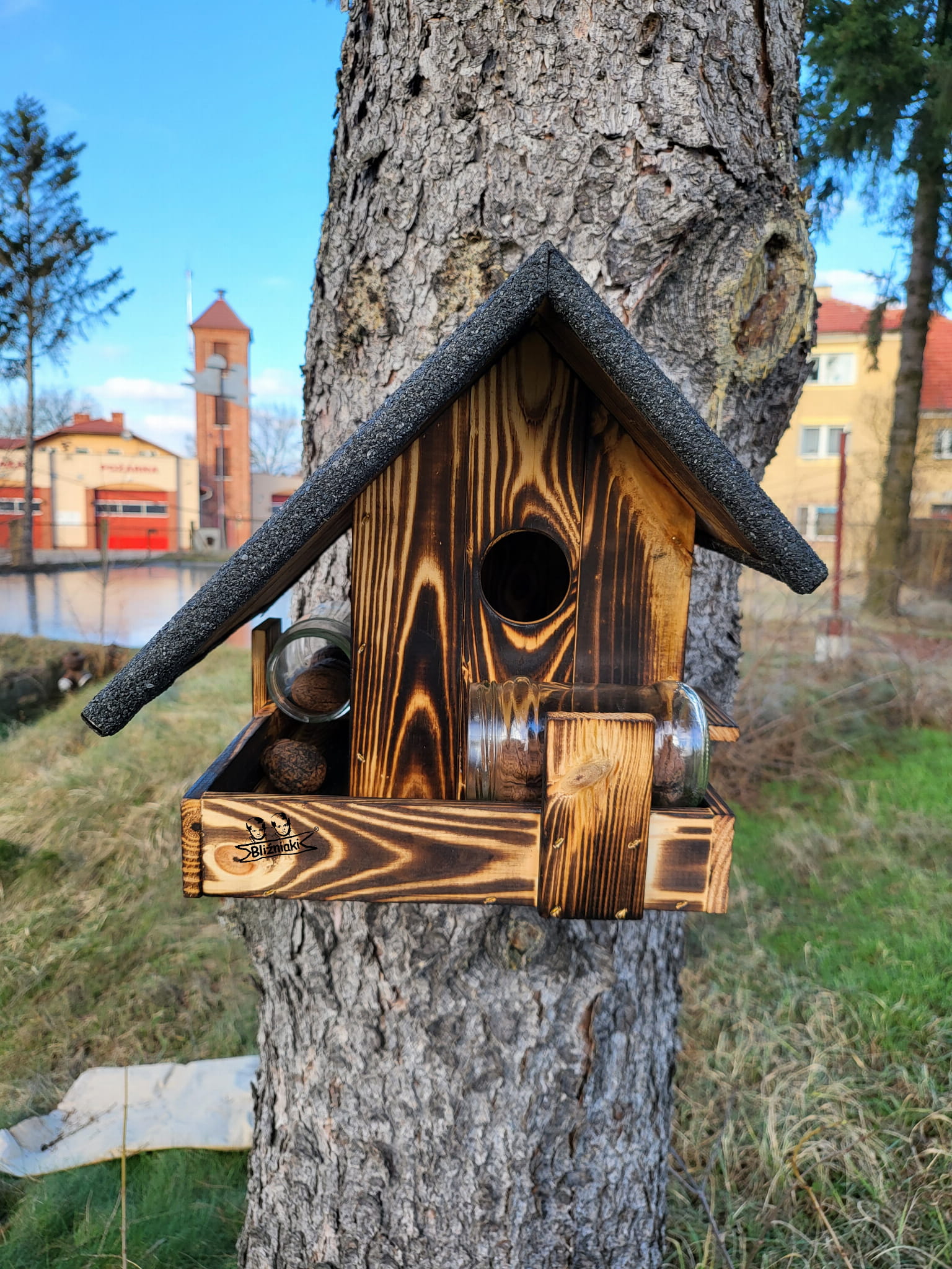 - W domku można położyć słoik z orzechami, na przykład podczas spaceru z dziećmi umieścić Wiewiórkom pokarm