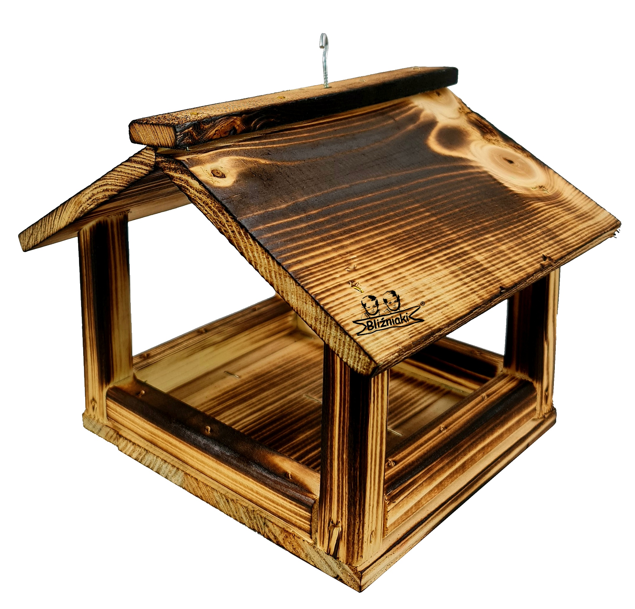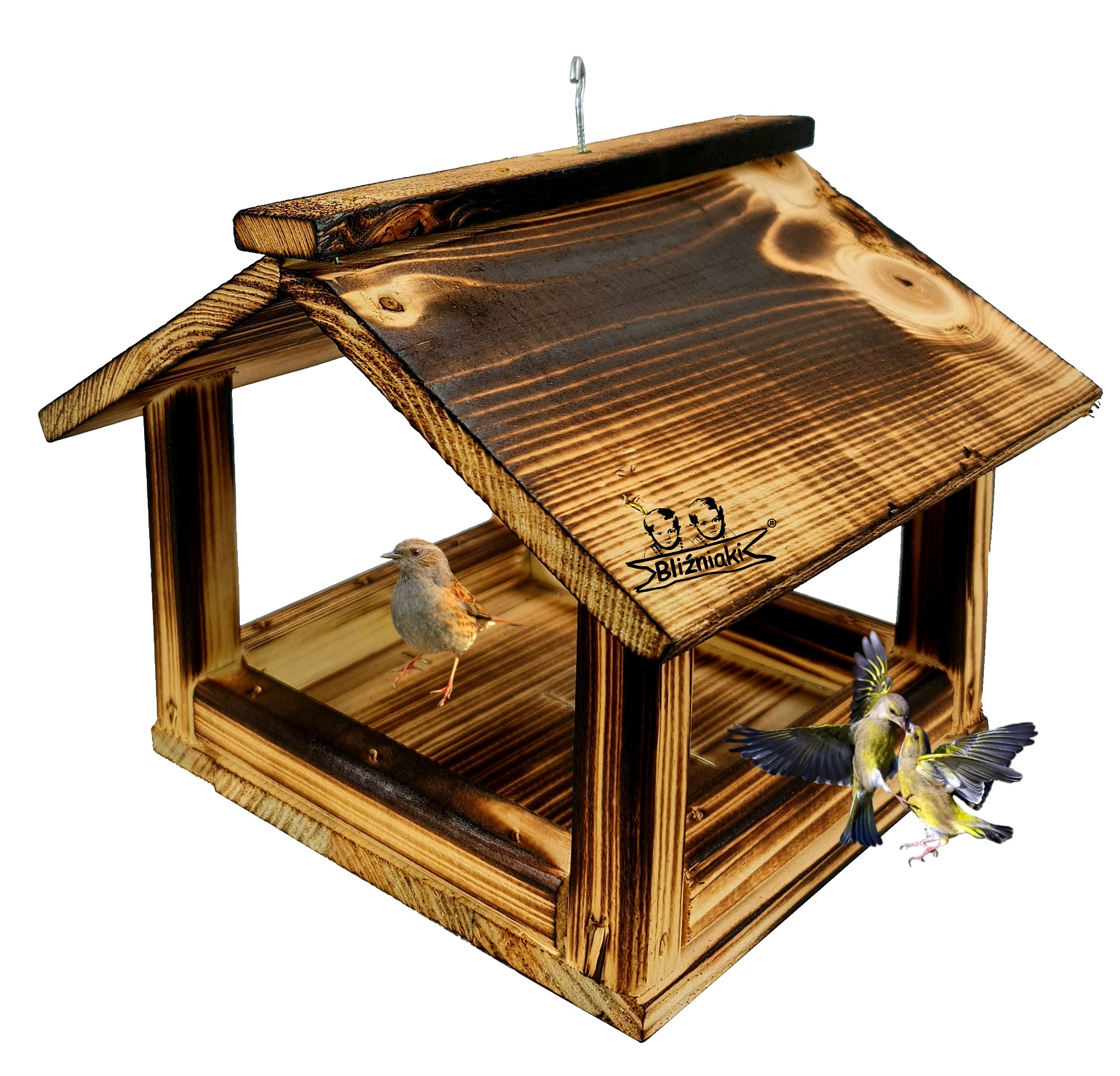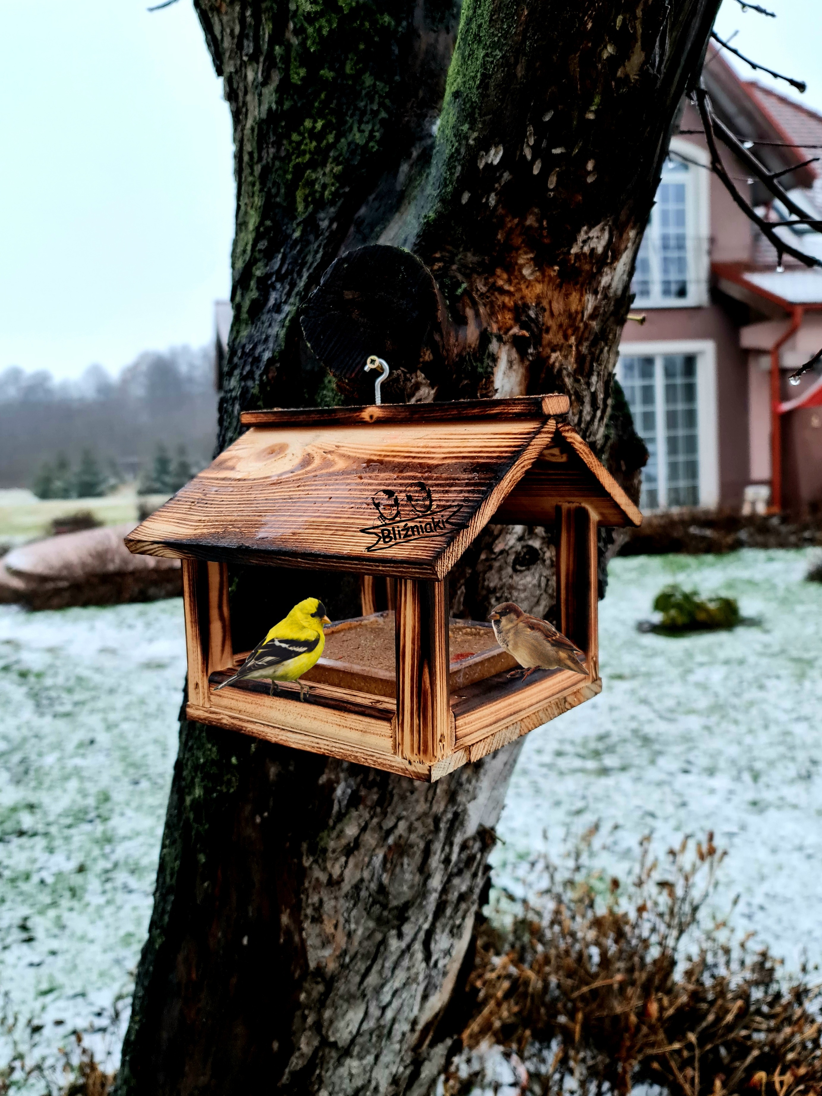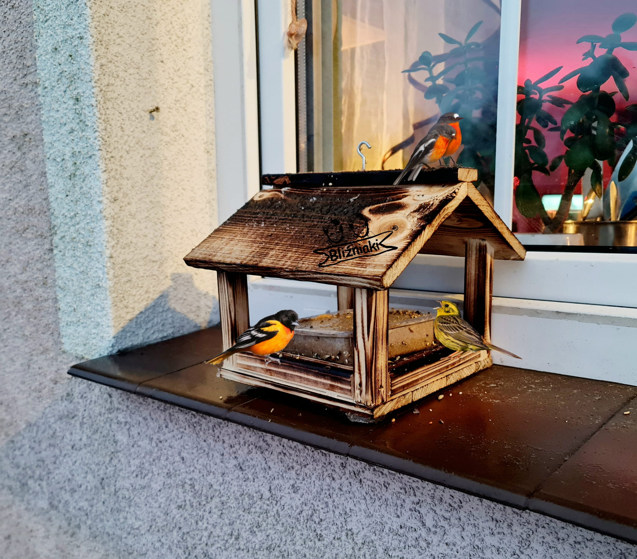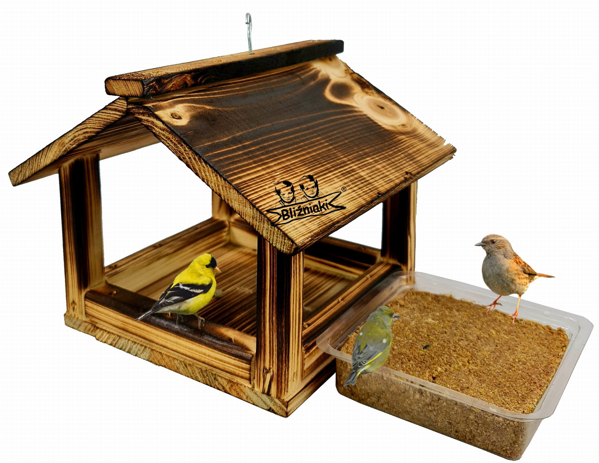 Drewniany Ekologiczny Mały Karmnik Dla Ptaków Stojący Na Parapet Lub Do Zawieszenia Na Drzewie Z Haczykiem (K135 OPAL)