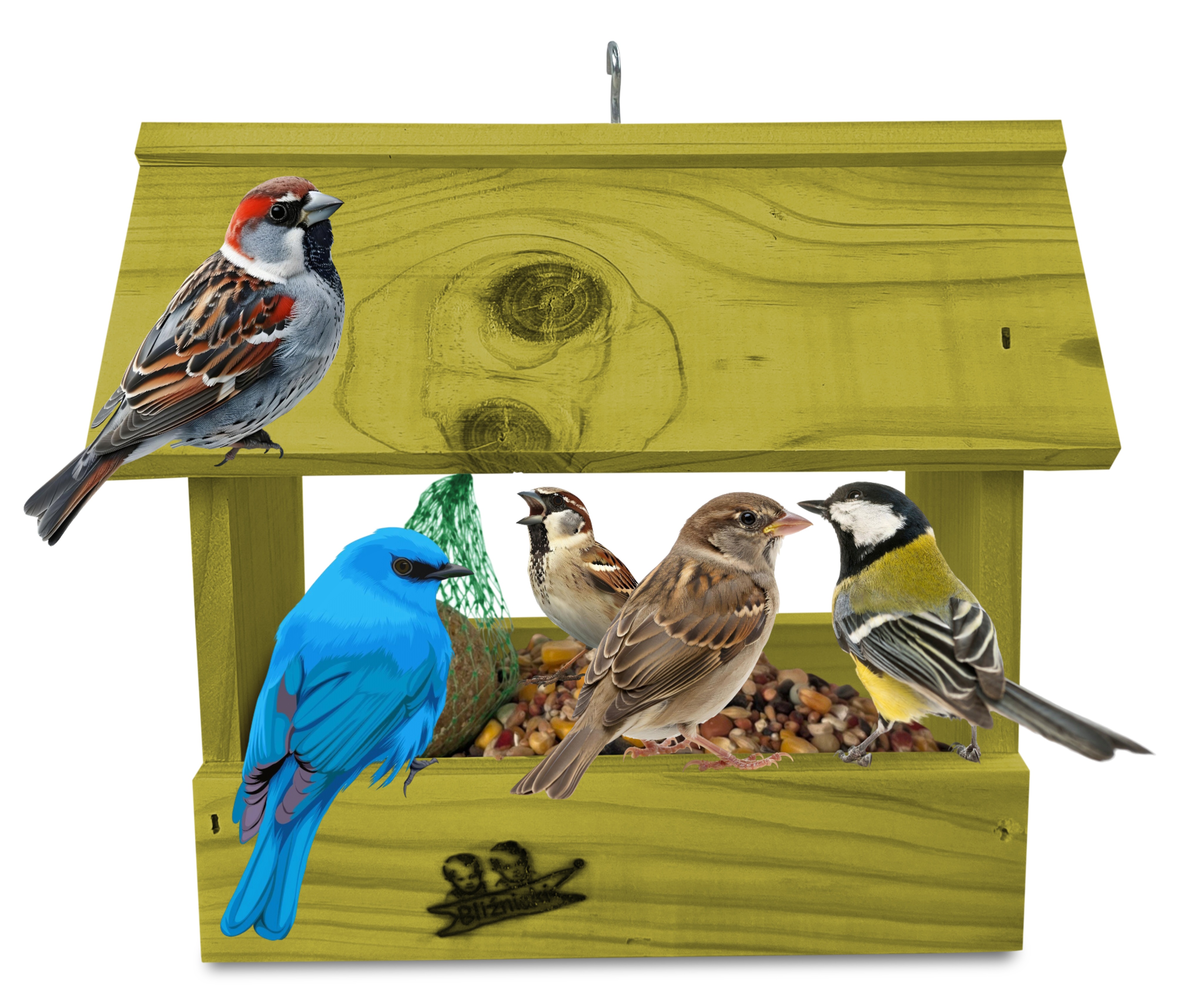 - U góry widoczny jest haczyk umożliwiający zawieszenie karmnika w dowolnym miejscu, możliwe jest również jego postawienie