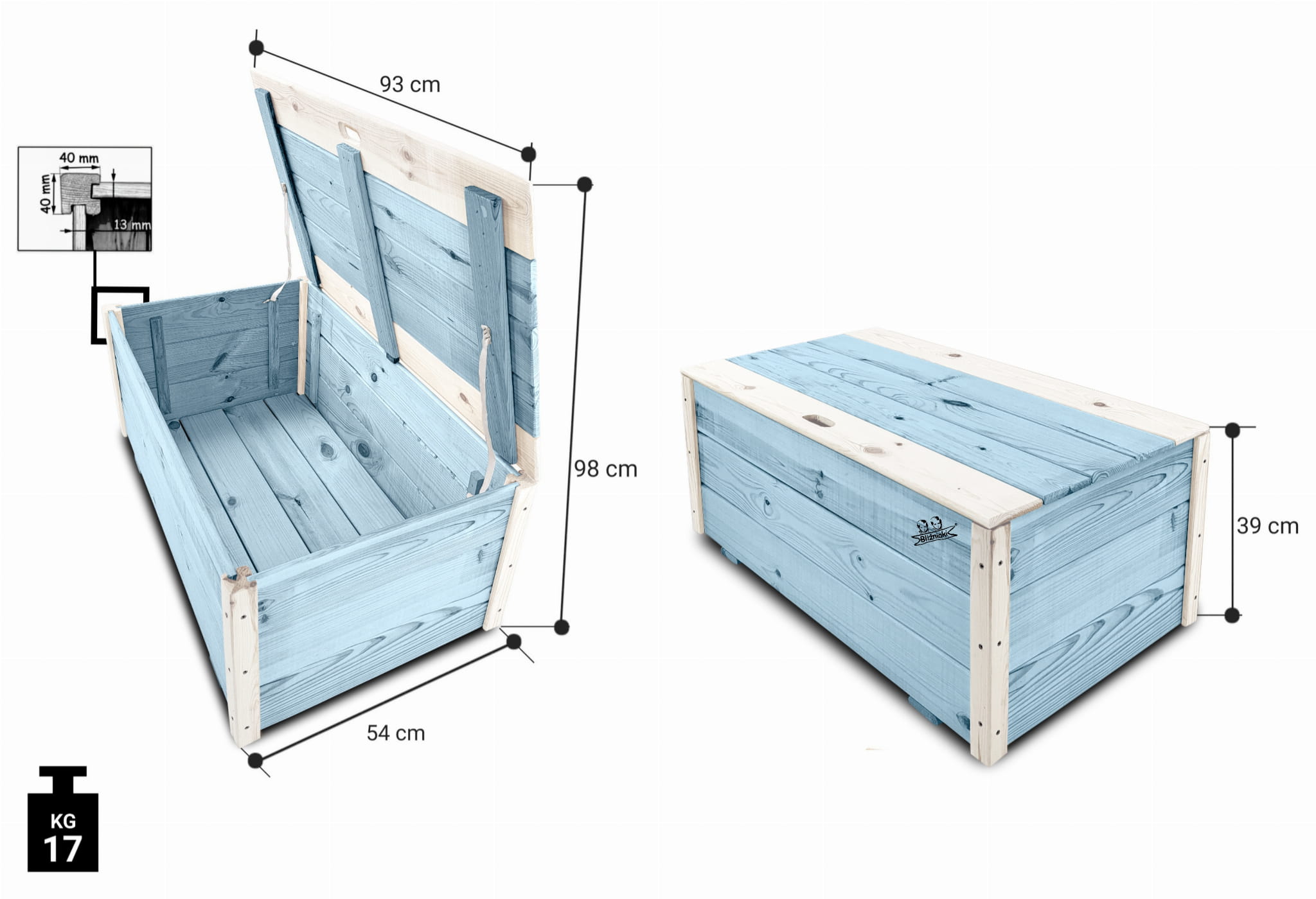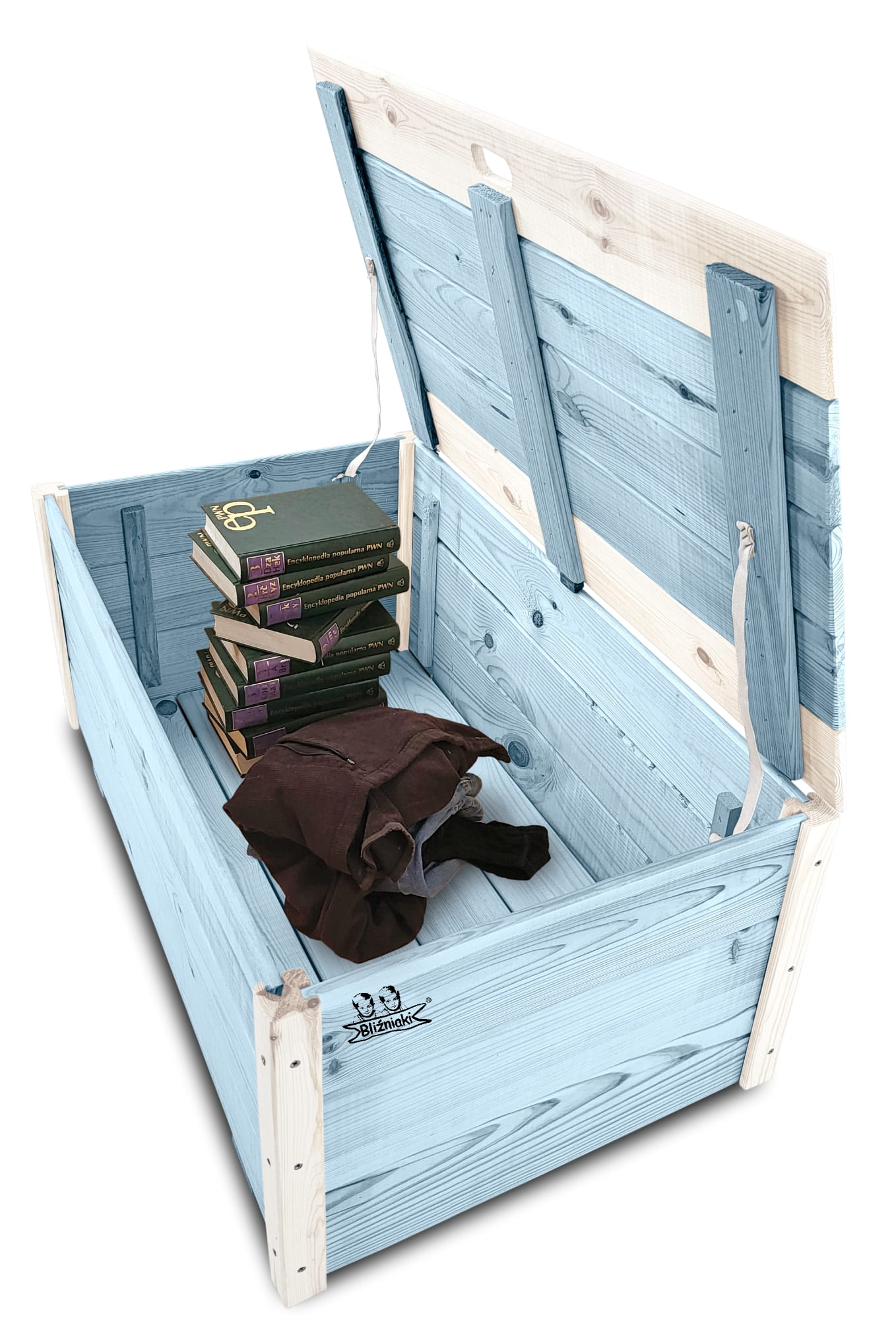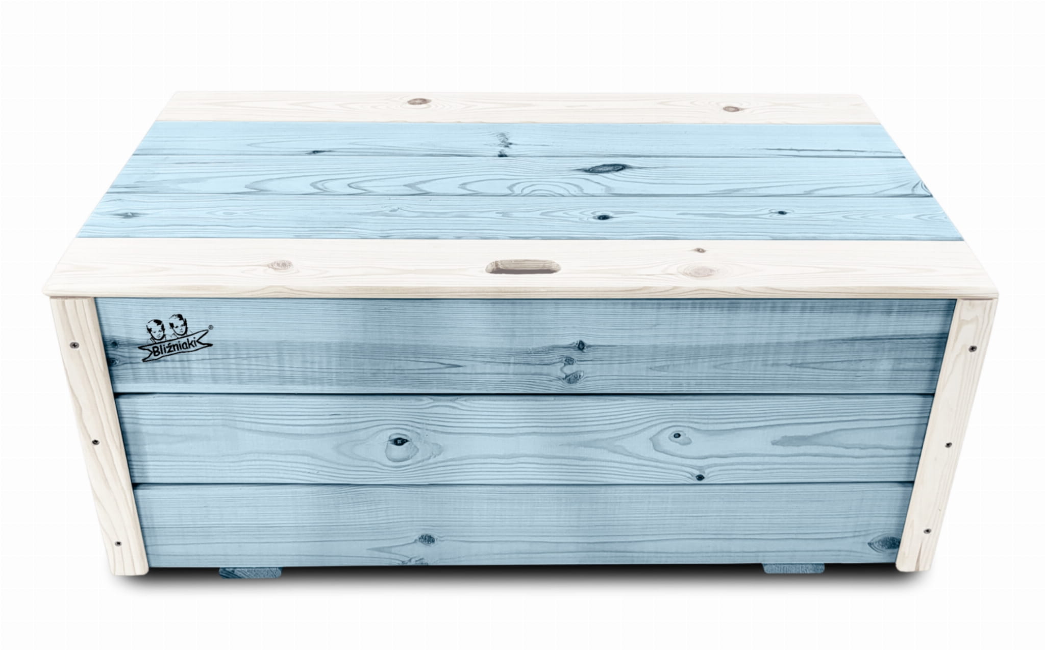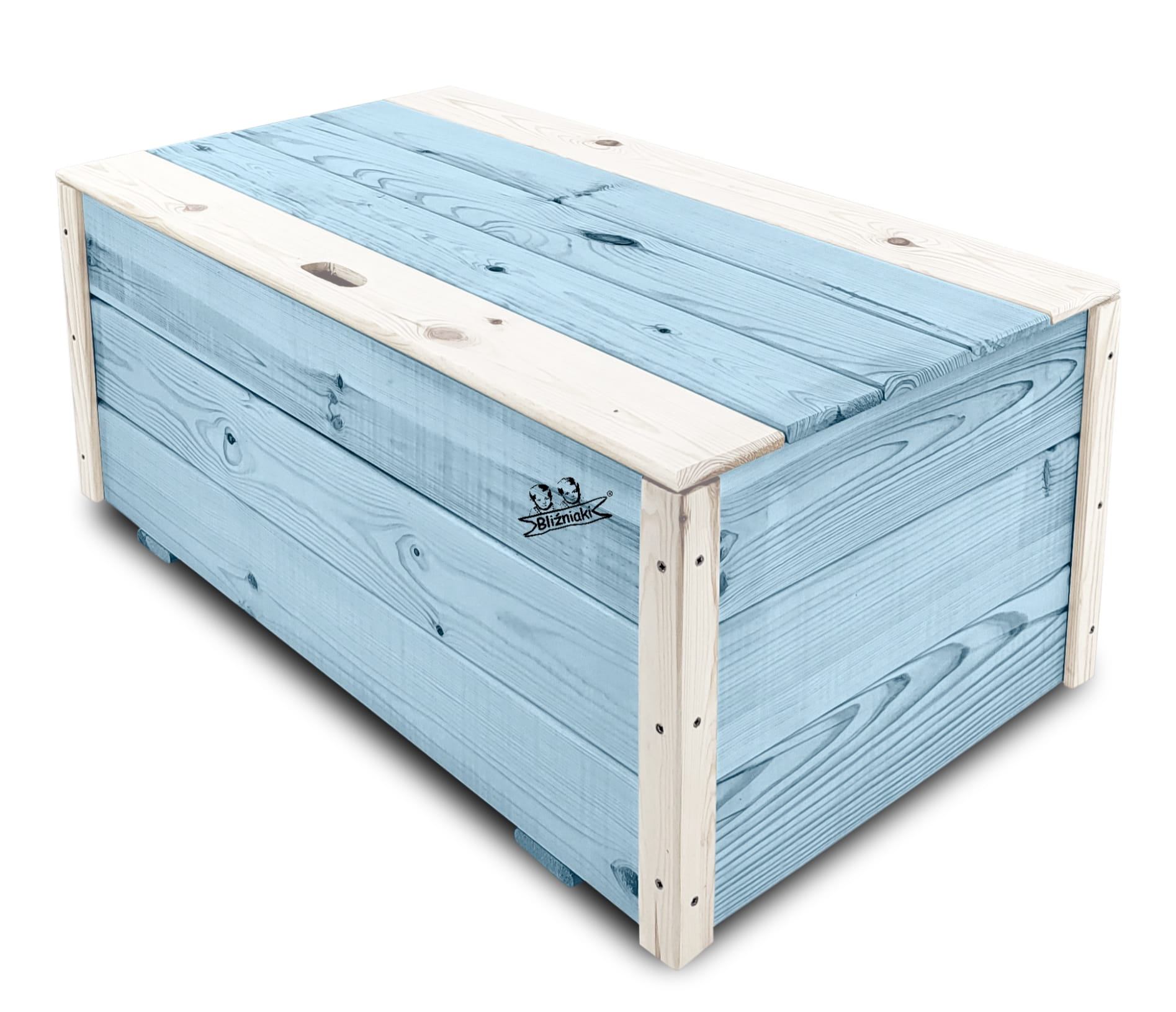 Produkt wykonany został z suszonego drewna sosnowego. Zabezpieczony metodą impregnowania. Środek na bazie wody użyty do impregnacji jest w pełni ekologiczny i bezpieczny dla ludzi i zwierząt. Zabezpieczone w taki sposób drewno sprawia, że skrzynia jest odporna na szkodliwe działanie wody oraz wilgoci, promieni UV, a także grzybów i pleśni, może być więc przechowywana przez cały rok na zewnątrz. Produkt dwukolorowy, w podstawowej przeważającej części w kolorze PASTELOWYM JASNYM NIEBIESKIM, został wykończony w kątownikach i listwach kolorem BIAŁYM.