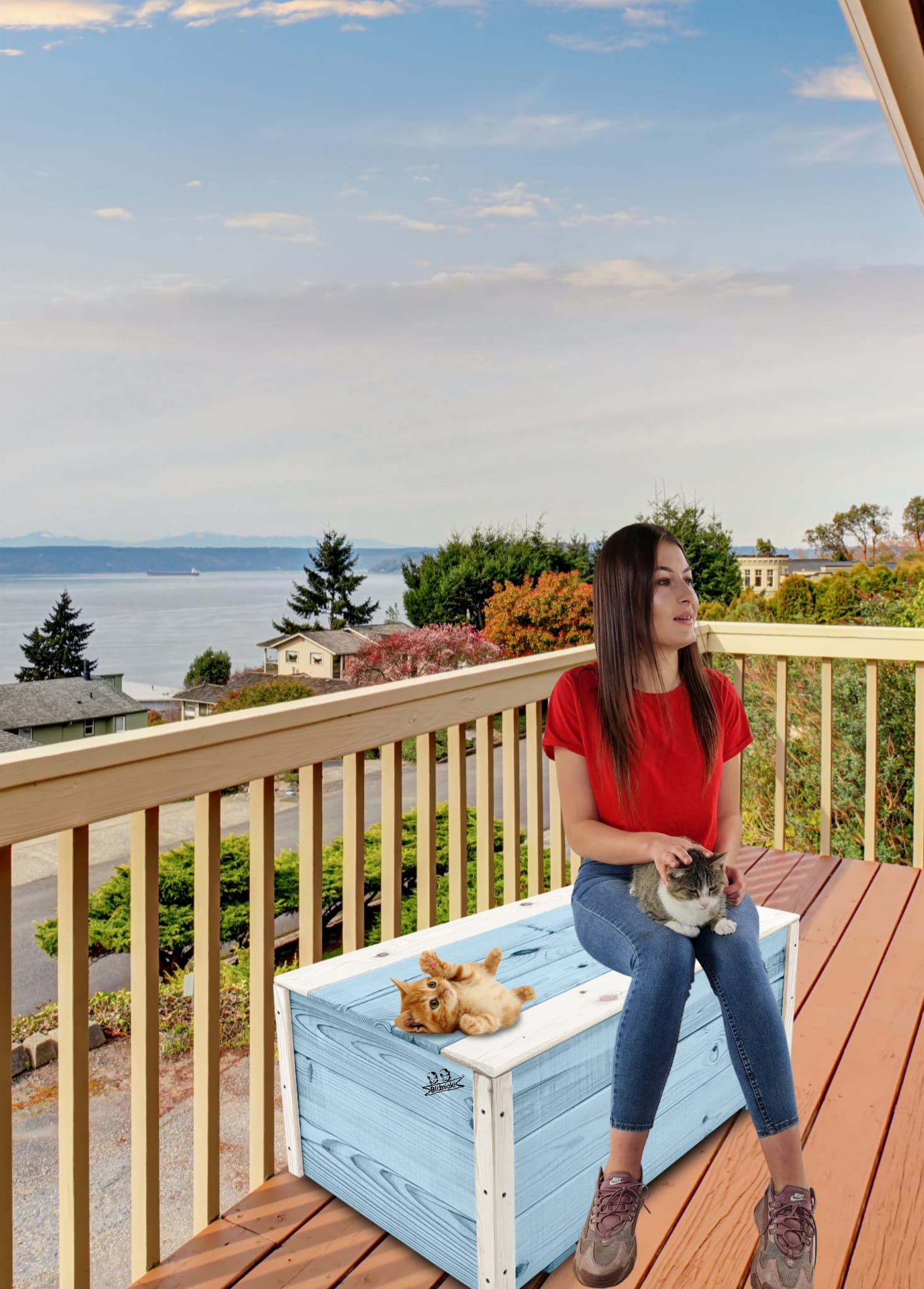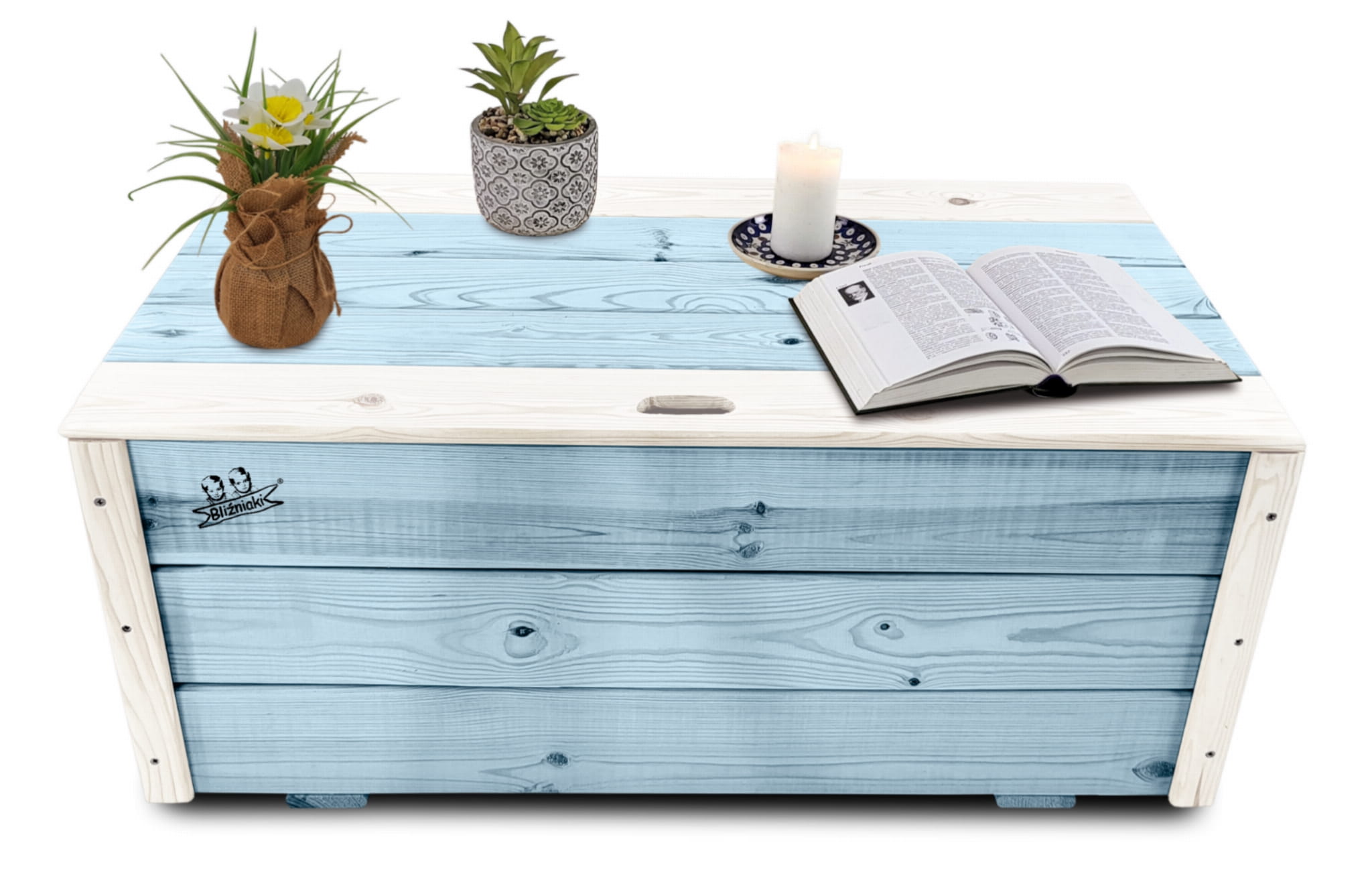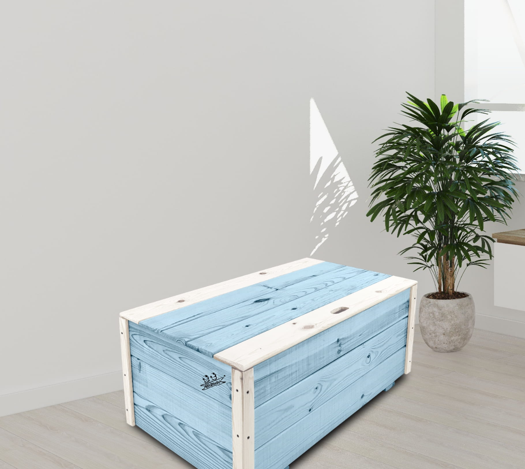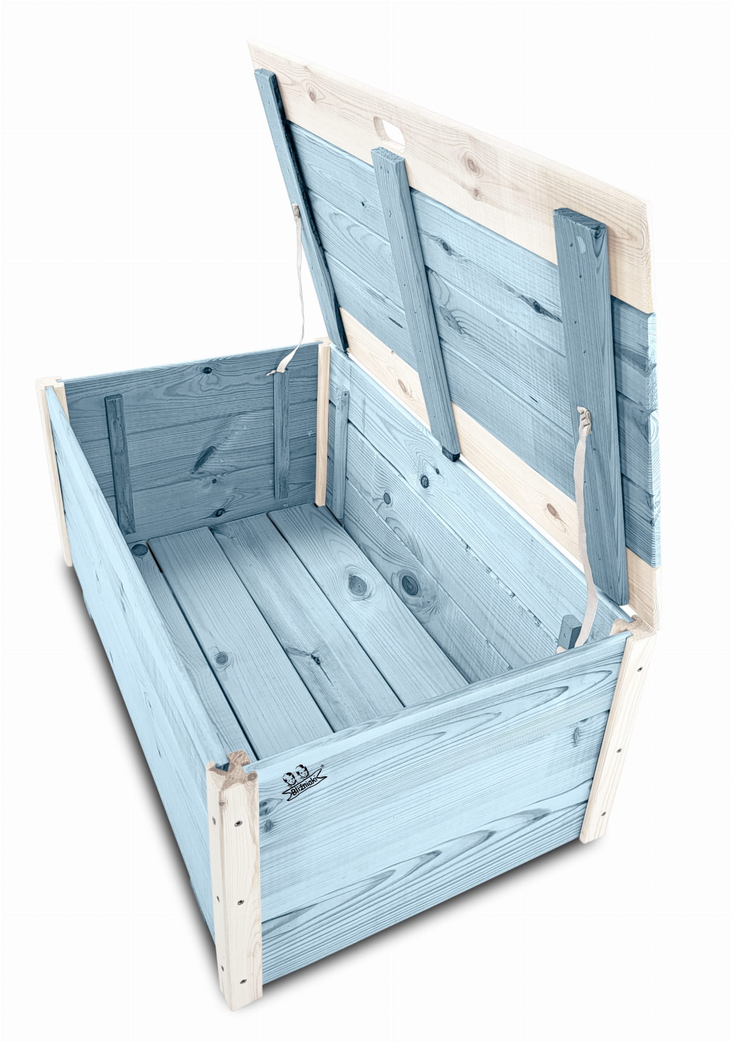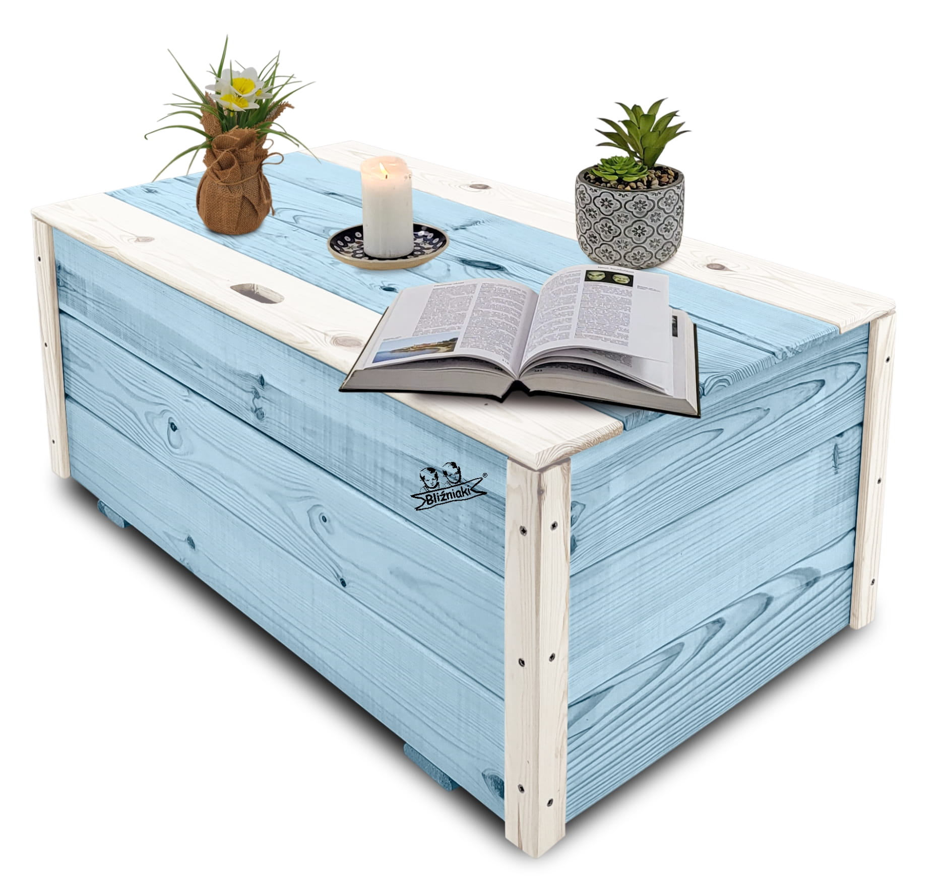 Produkt wykonany został z suszonego drewna sosnowego. Zabezpieczony metodą impregnowania. Środek na bazie wody użyty do impregnacji jest w pełni ekologiczny i bezpieczny dla ludzi i zwierząt. Zabezpieczone w taki sposób drewno sprawia, że skrzynia jest odporna na szkodliwe działanie wody oraz wilgoci, promieni UV, a także grzybów i pleśni, może być więc przechowywana przez cały rok na zewnątrz. Produkt dwukolorowy, w podstawowej przeważającej części w kolorze PASTELOWYM JASNYM NIEBIESKIM, został wykończony w kątownikach i listwach kolorem BIAŁYM.