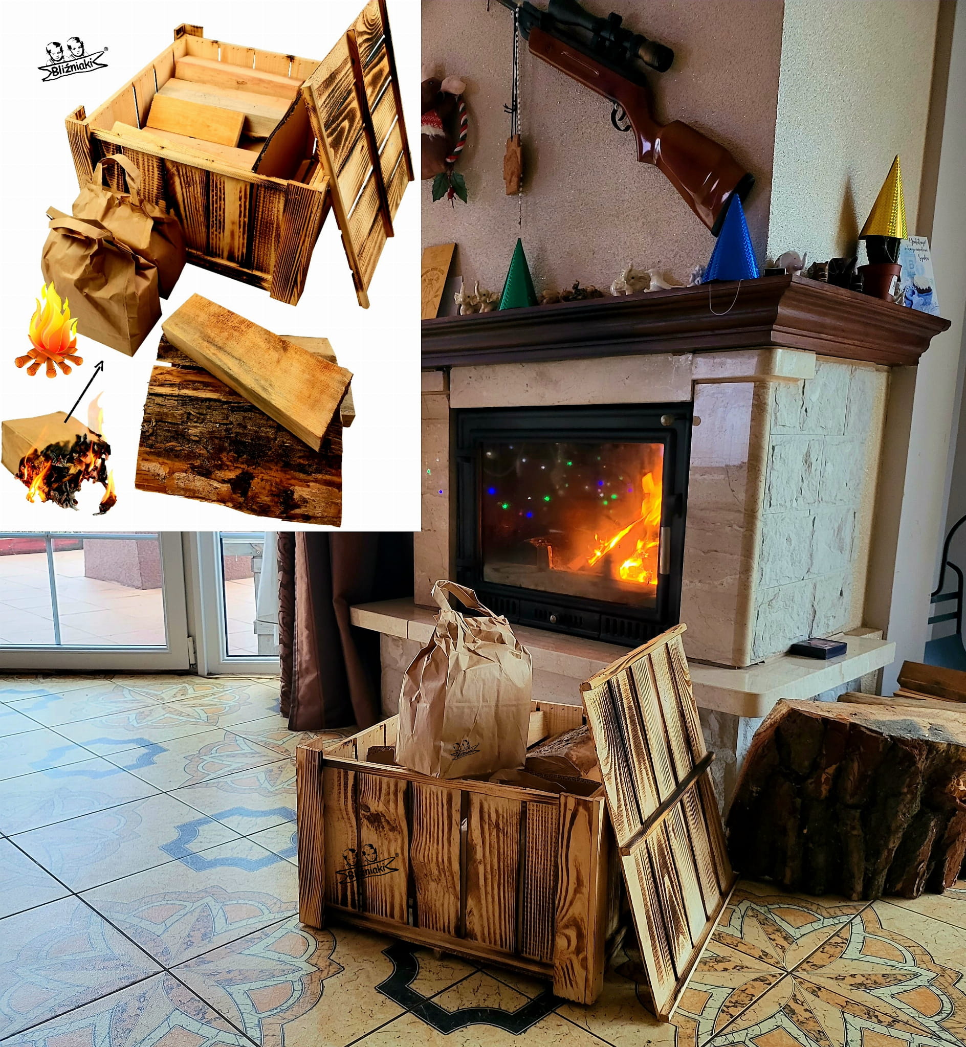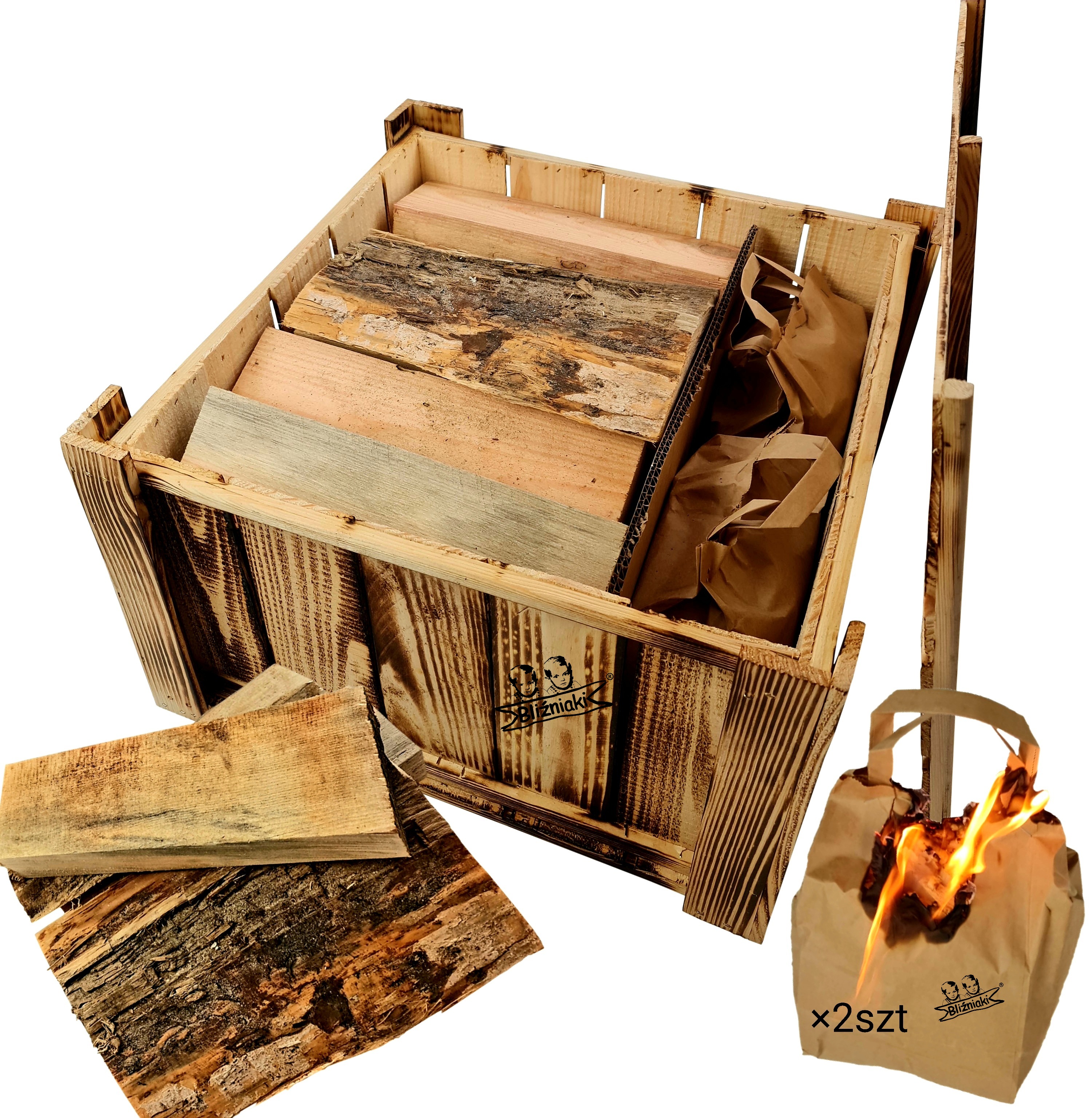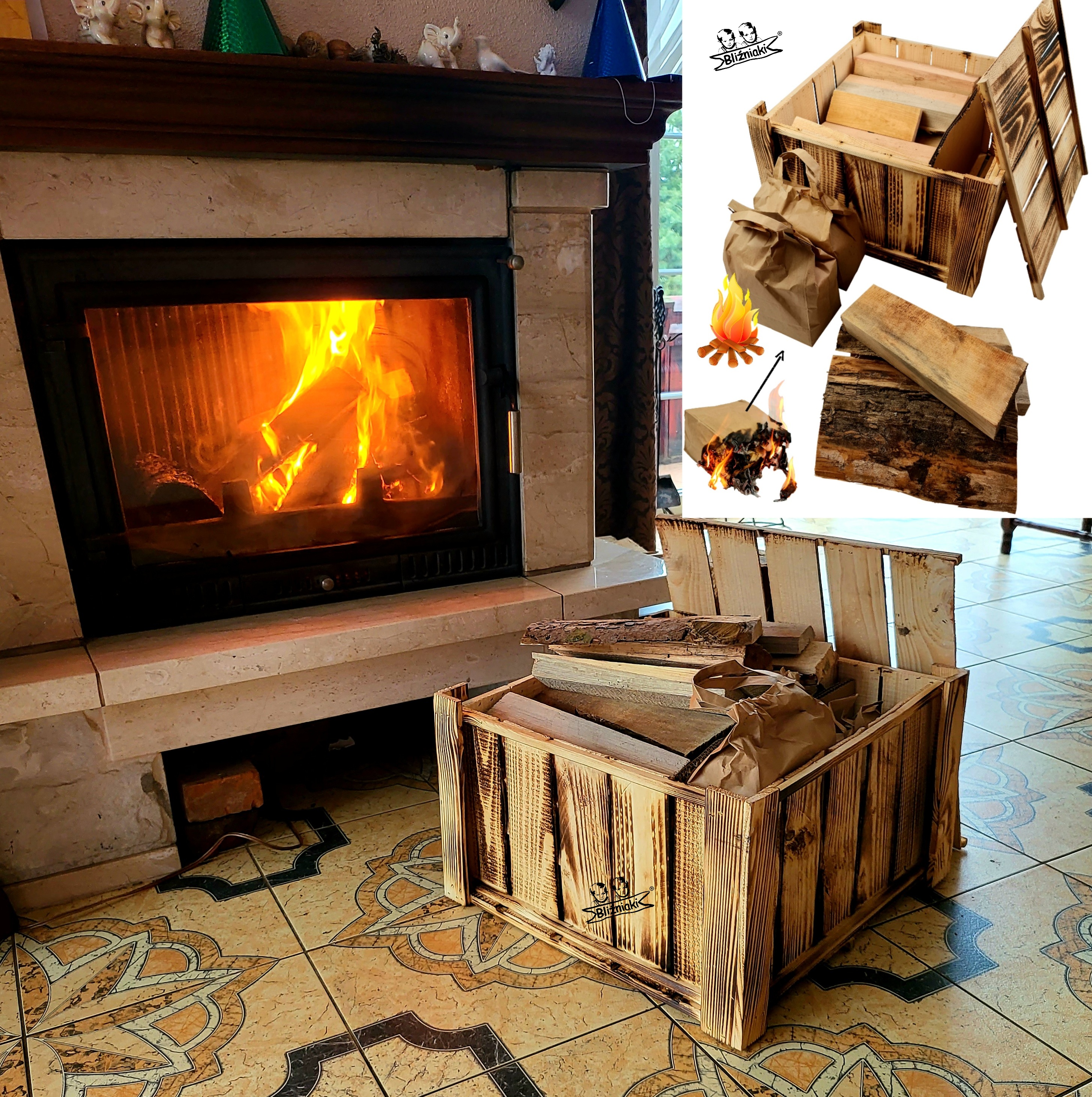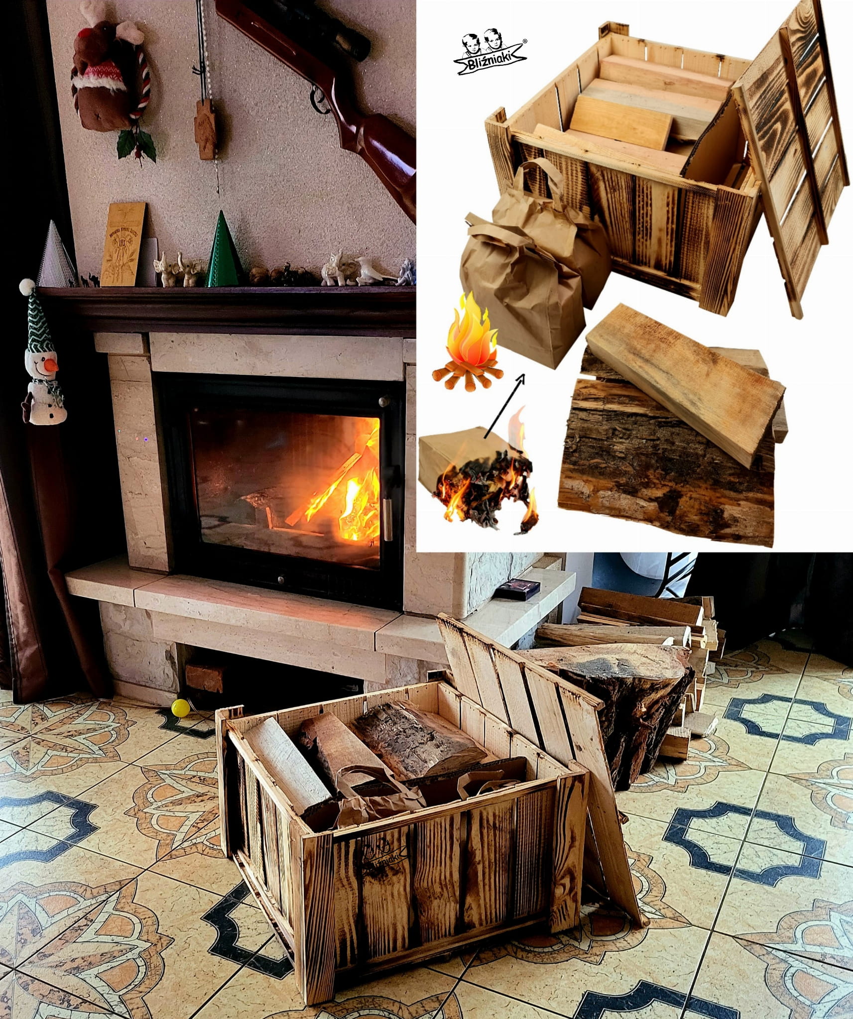 Drewno Kominkowe W Skrzyni Opał Do Kominka + 2 Torebki Rozpałki Podpałki Do Kominka Na Ognisko ( RZYGR1 14KG)