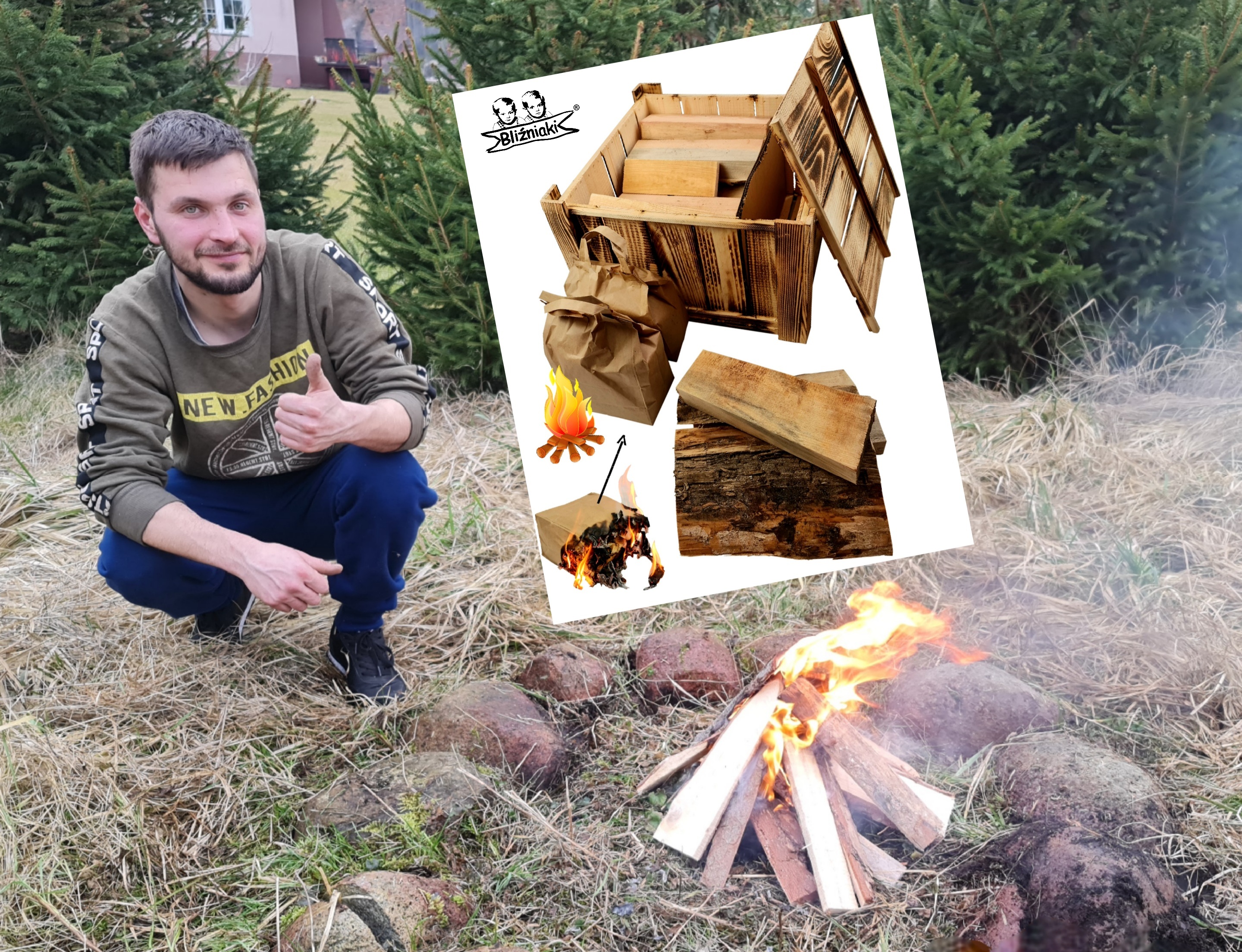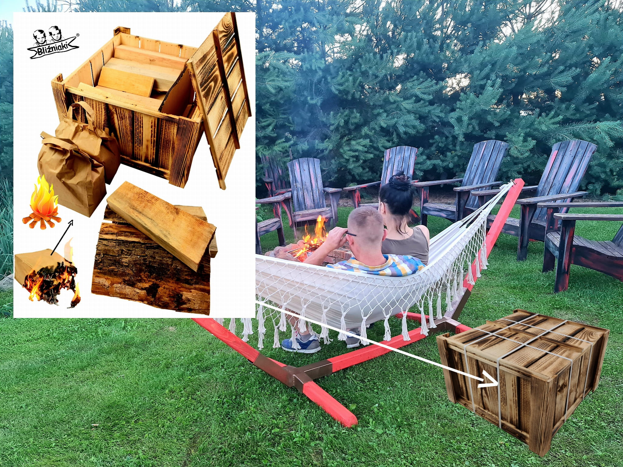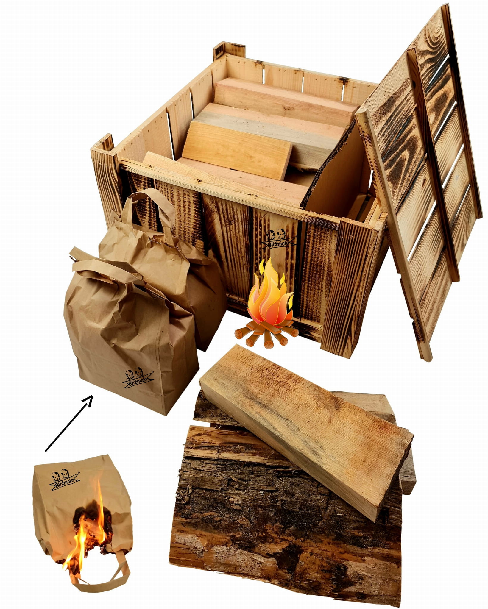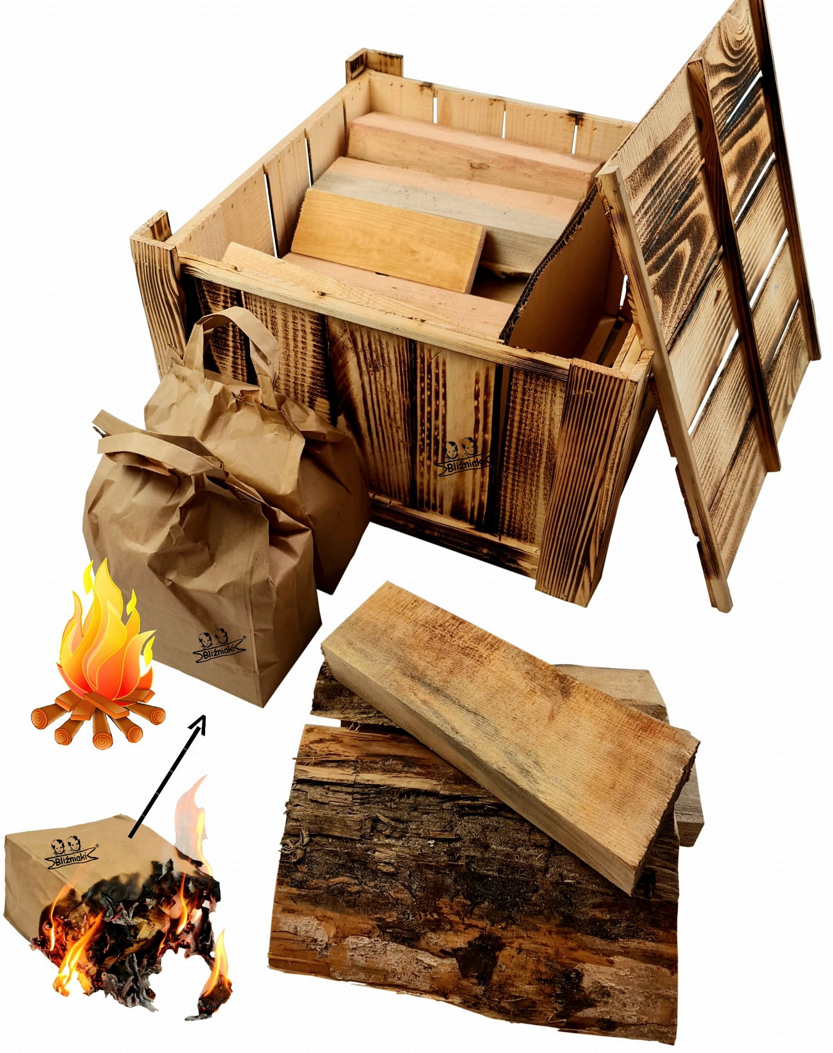 Drewno Kominkowe W Skrzyni Opał Do Kominka + 2 Torebki Rozpałki Podpałki Do Kominka Na Ognisko ( RZYGR1 14KG)