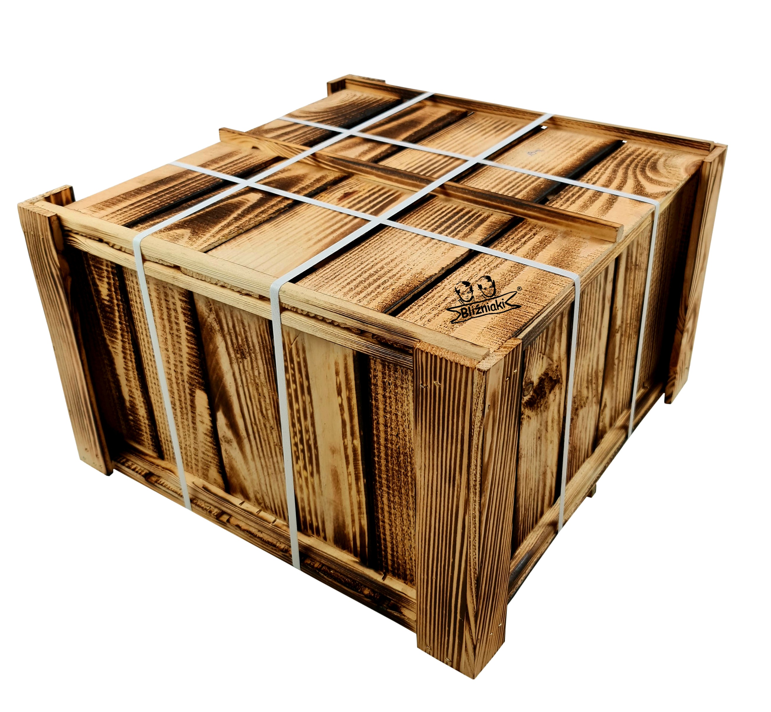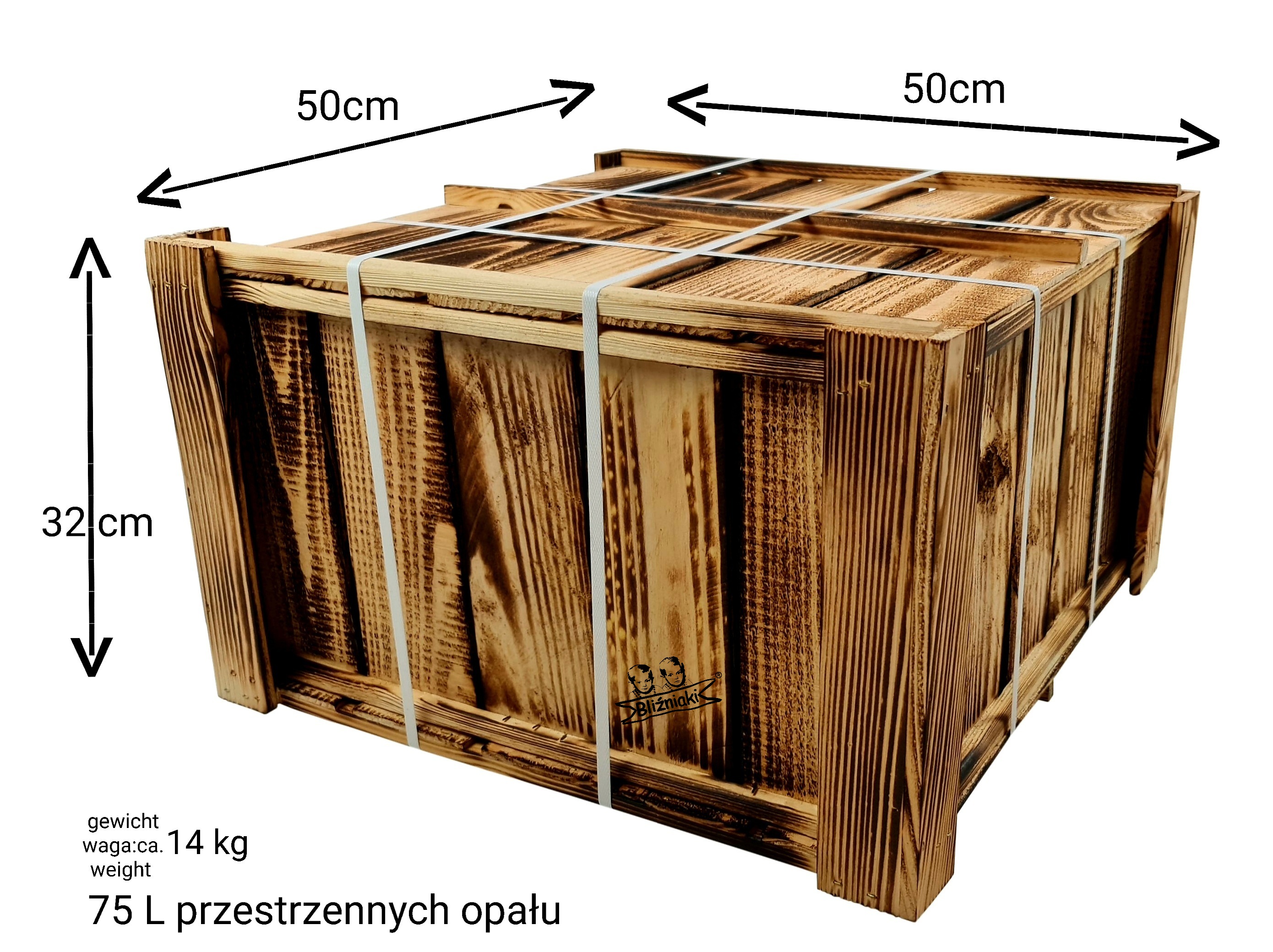 - Drewno kominkowe wysyłane jest w drewnianej skrzyni która może służyć jako skrzynia dekoracyjna. Wykonana została w całości z drewna, zabezpieczona metodą opalania ogniem, jej elegancki wygląd i wytrzymałość, sprawia, że może zostać wykorzystana wielokrotnie.