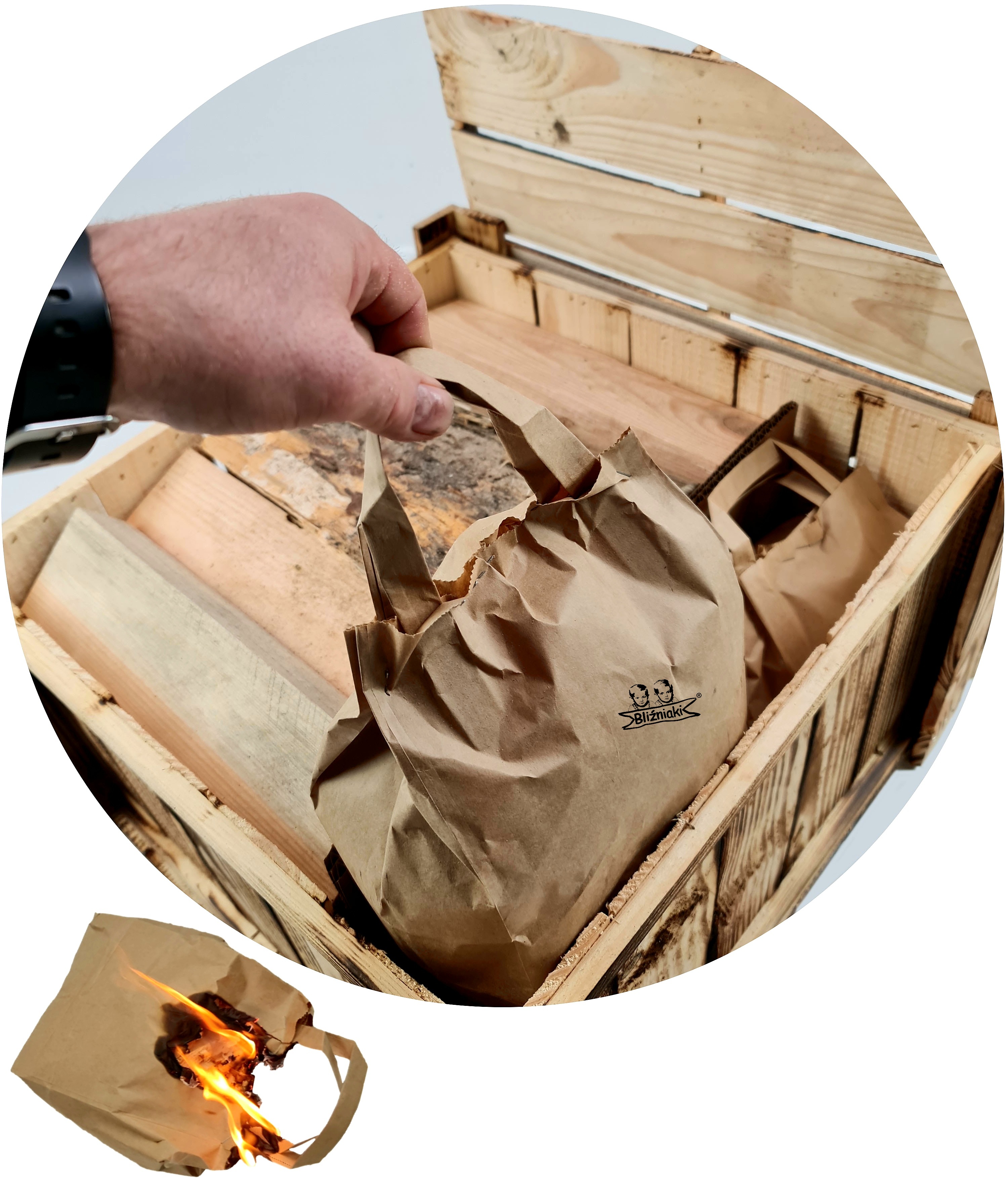 - W skrzyni znajduje się drewno rozpałkowe, ułożone tak, aby umieścić w niej jeszcze 2 torebki rozpałki.