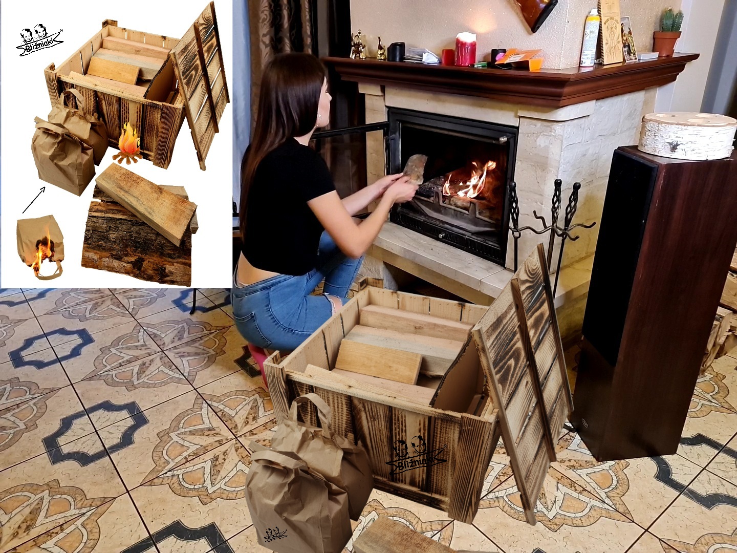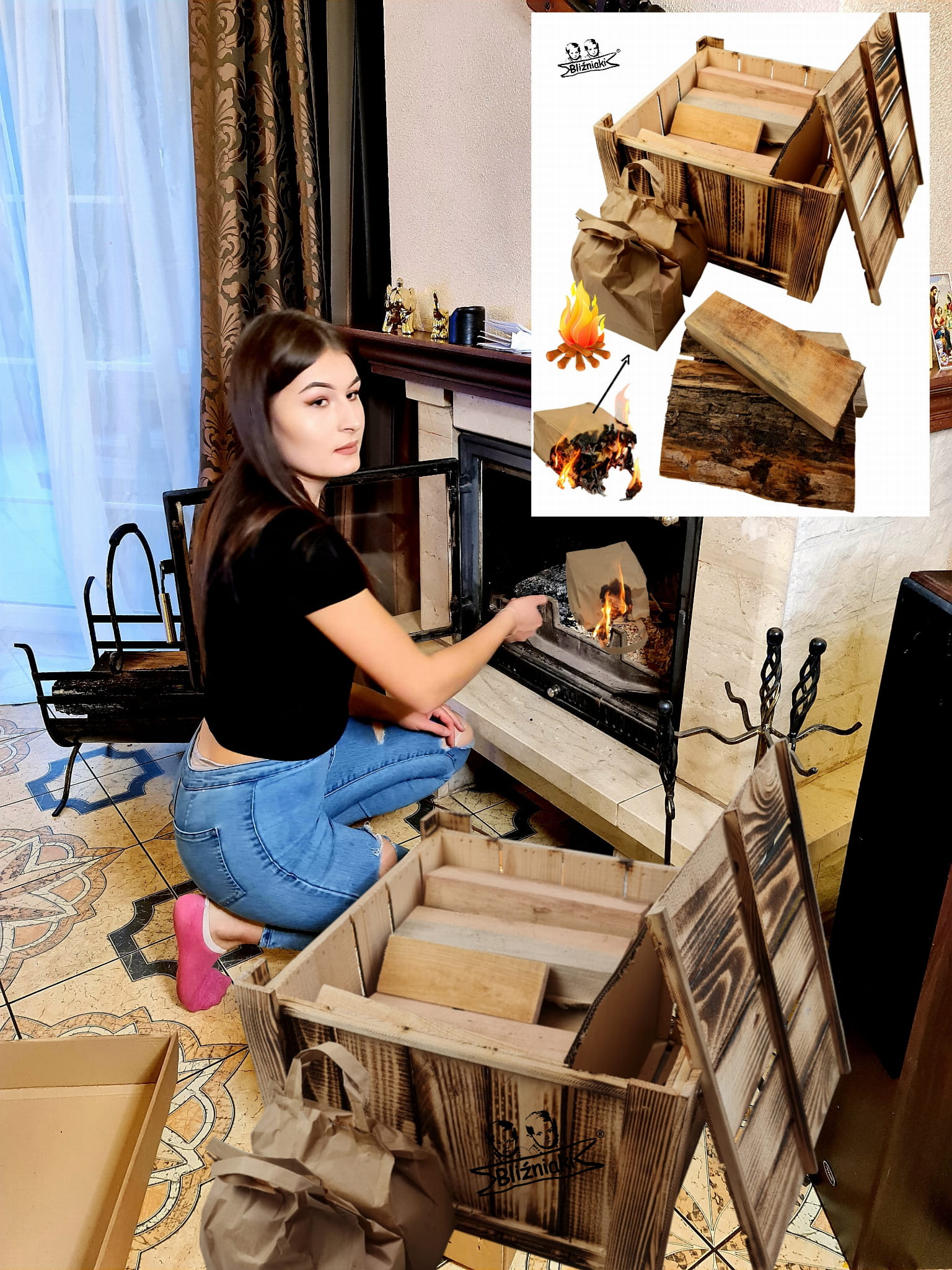 - Sprzedawany zestaw może być wykorzystany do palenia w: kominkach, piecach, ogniskach, a dekoracyjna skrzynka stanowić może elegancką i praktyczną dekorację Twojego salonu.