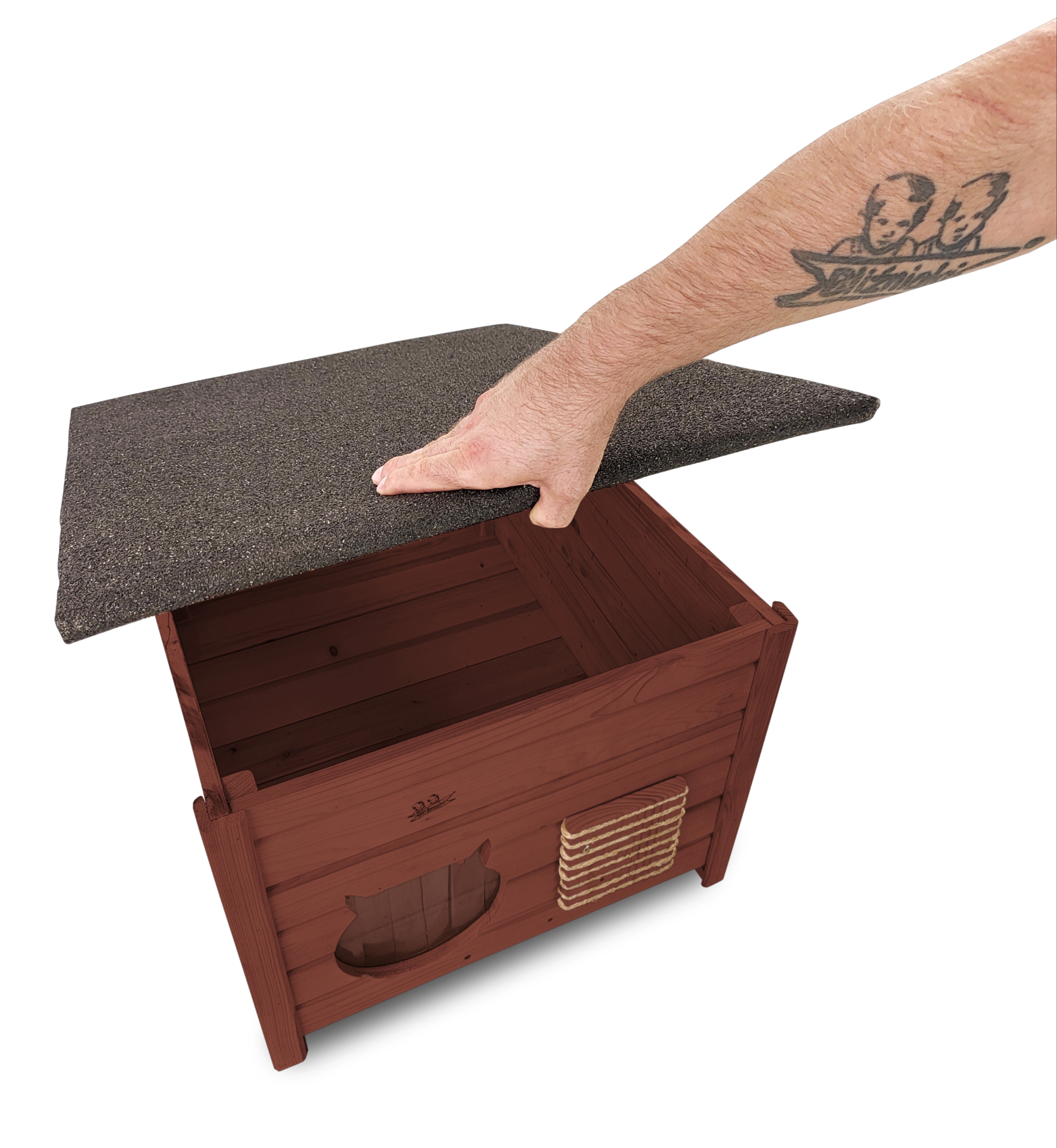 - Dach jest łatwo zdejmowany, co ułatwia uzupełnienie budki posłaniem lub jej czyszczeniem