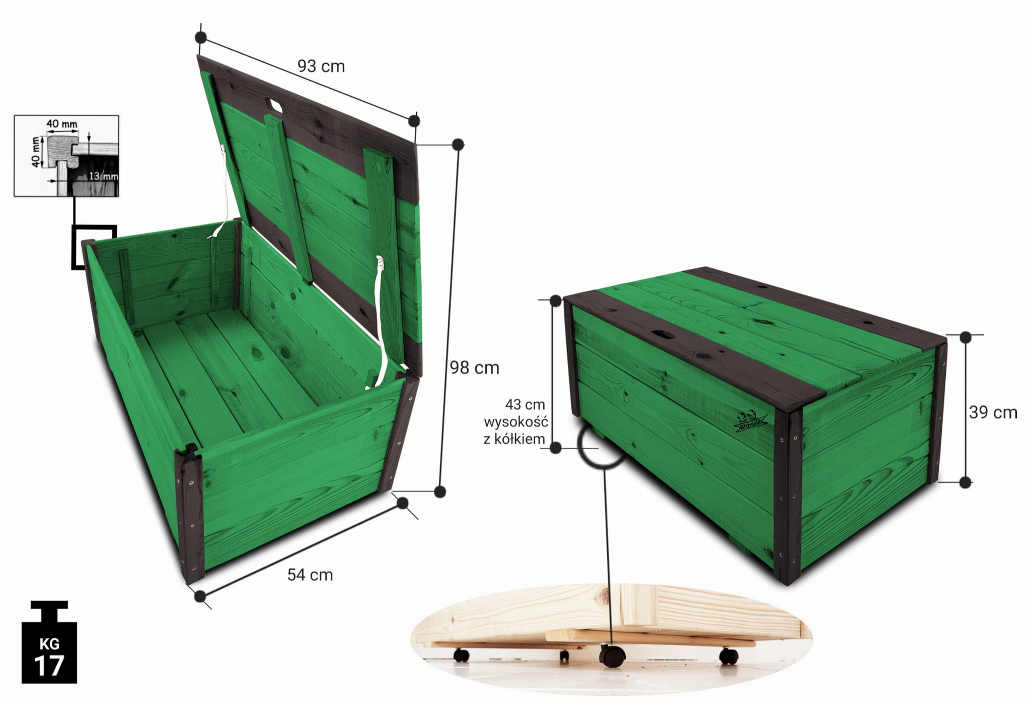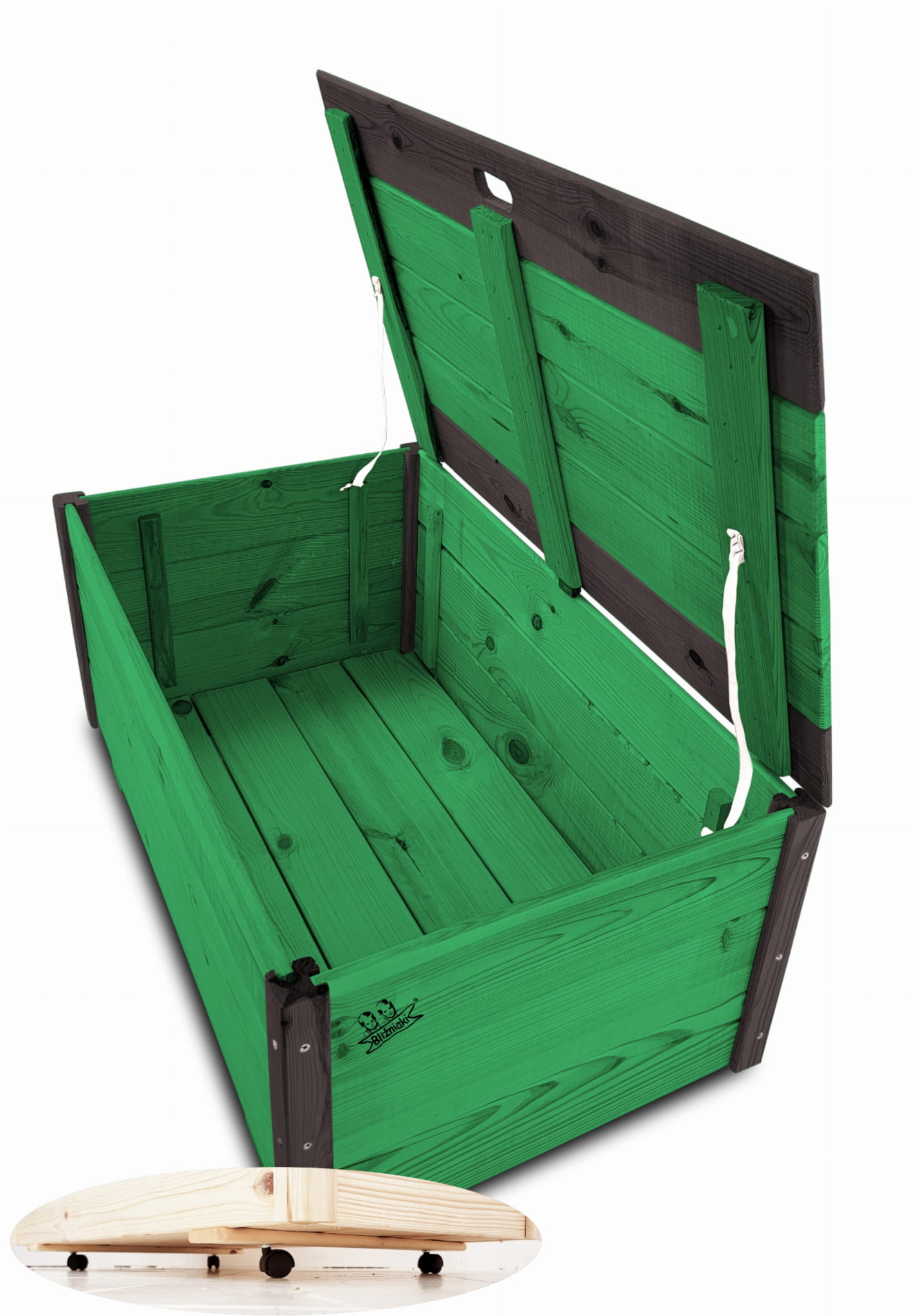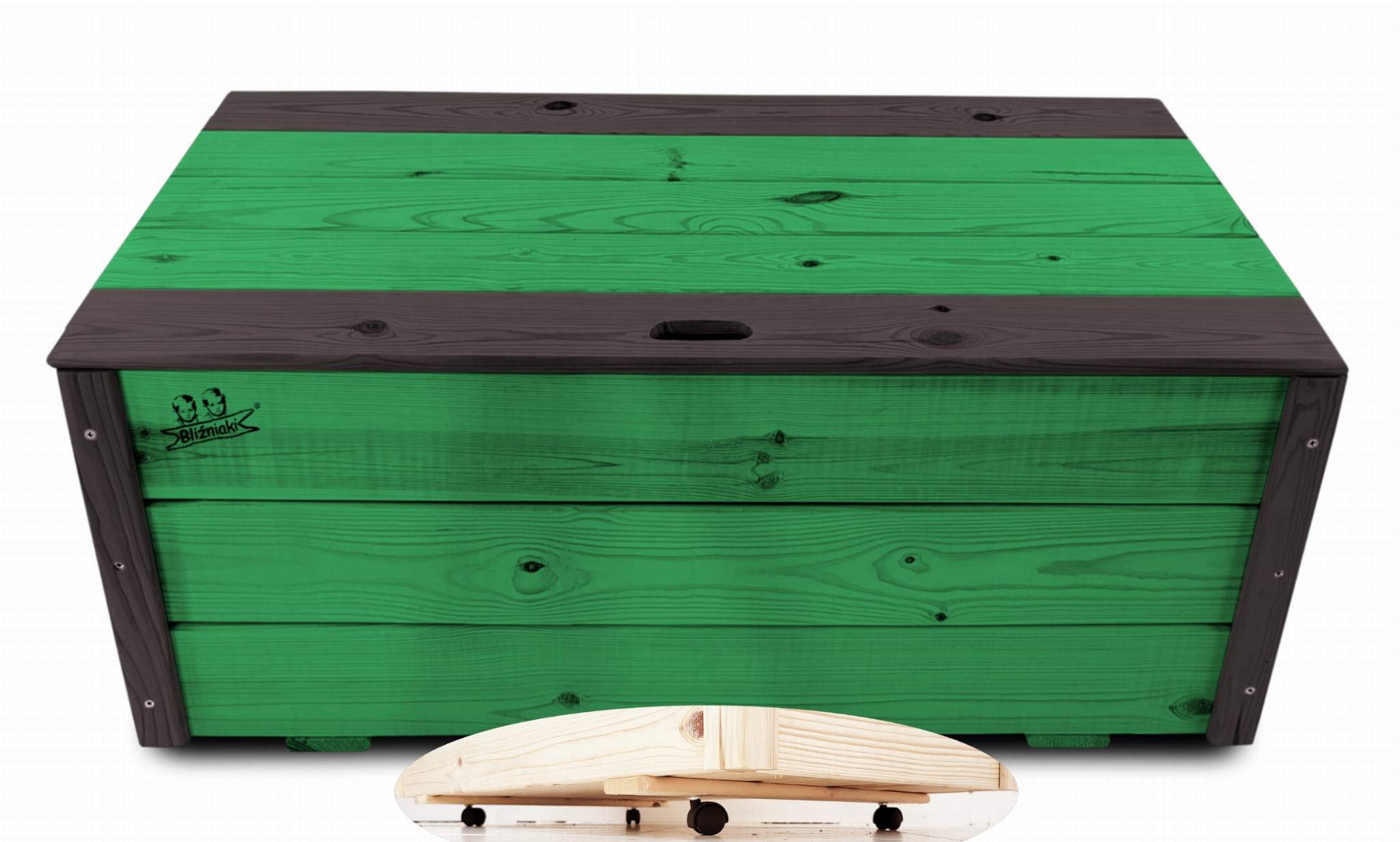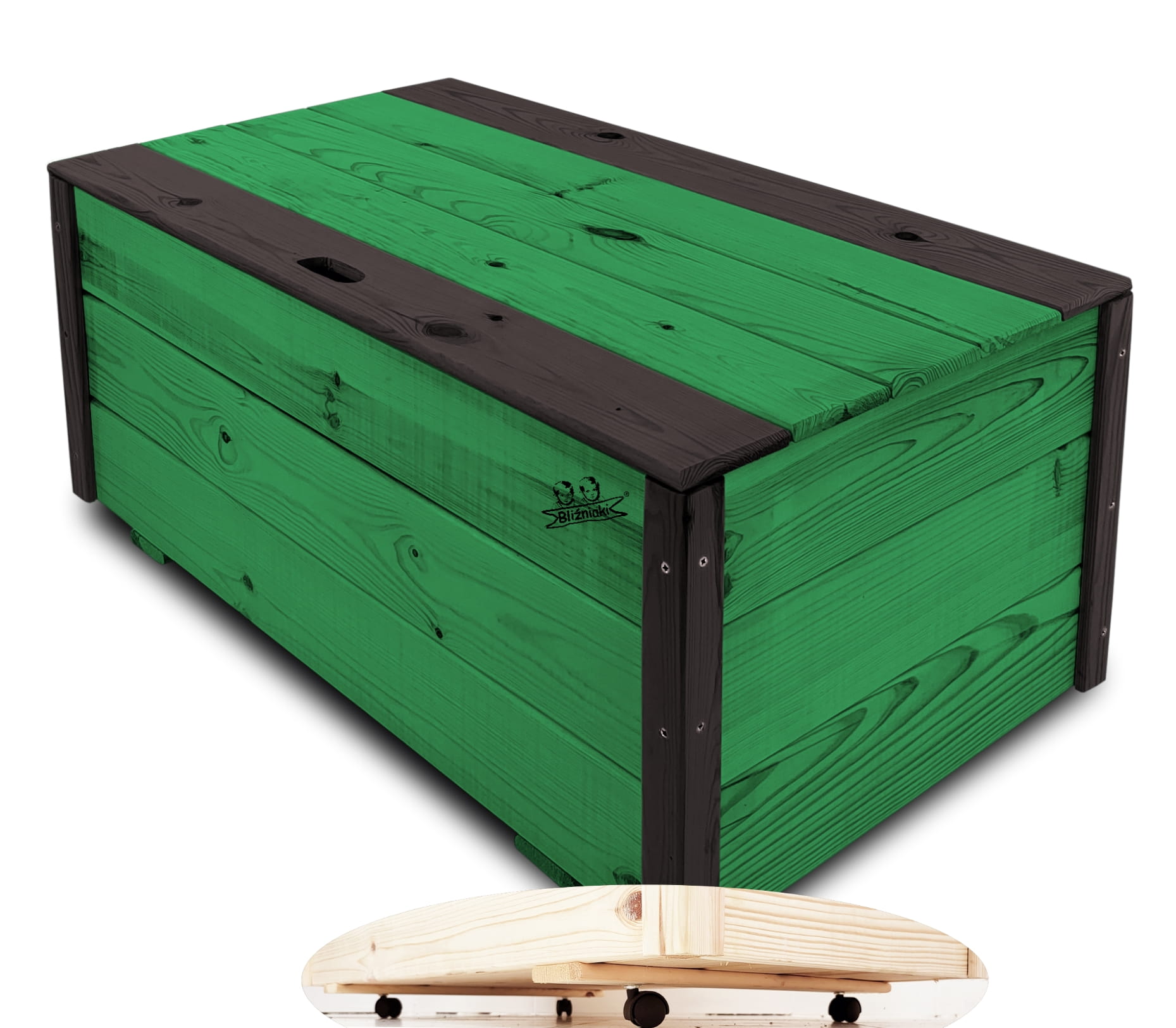 Produkt wykonany został z suszonego drewna sosnowego. Zabezpieczony metodą impregnowania. Środek na bazie wody użyty do impregnacji jest w pełni ekologiczny i bezpieczny dla ludzi i zwierząt. Zabezpieczone w taki sposób drewno sprawia, że skrzynia jest odporna na szkodliwe działanie wody oraz wilgoci, promieni UV, a także grzybów i pleśni, może być więc przechowywana przez cały rok na zewnątrz. Produkt dwukolorowy, w podstawowej przeważającej części w kolorze ZIELONYM, został wykończony w kątownikach i listwach kolorem CZARNYM.