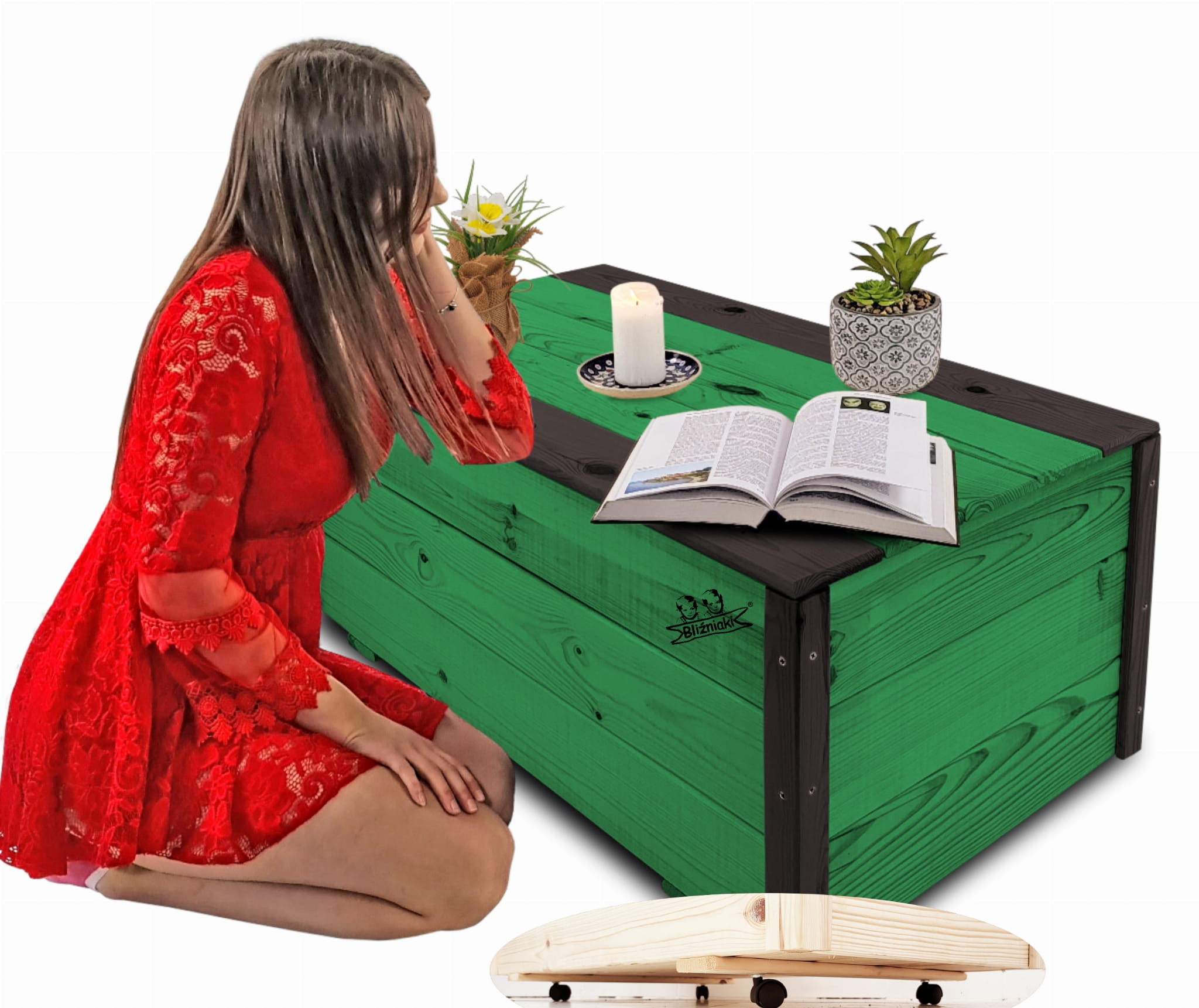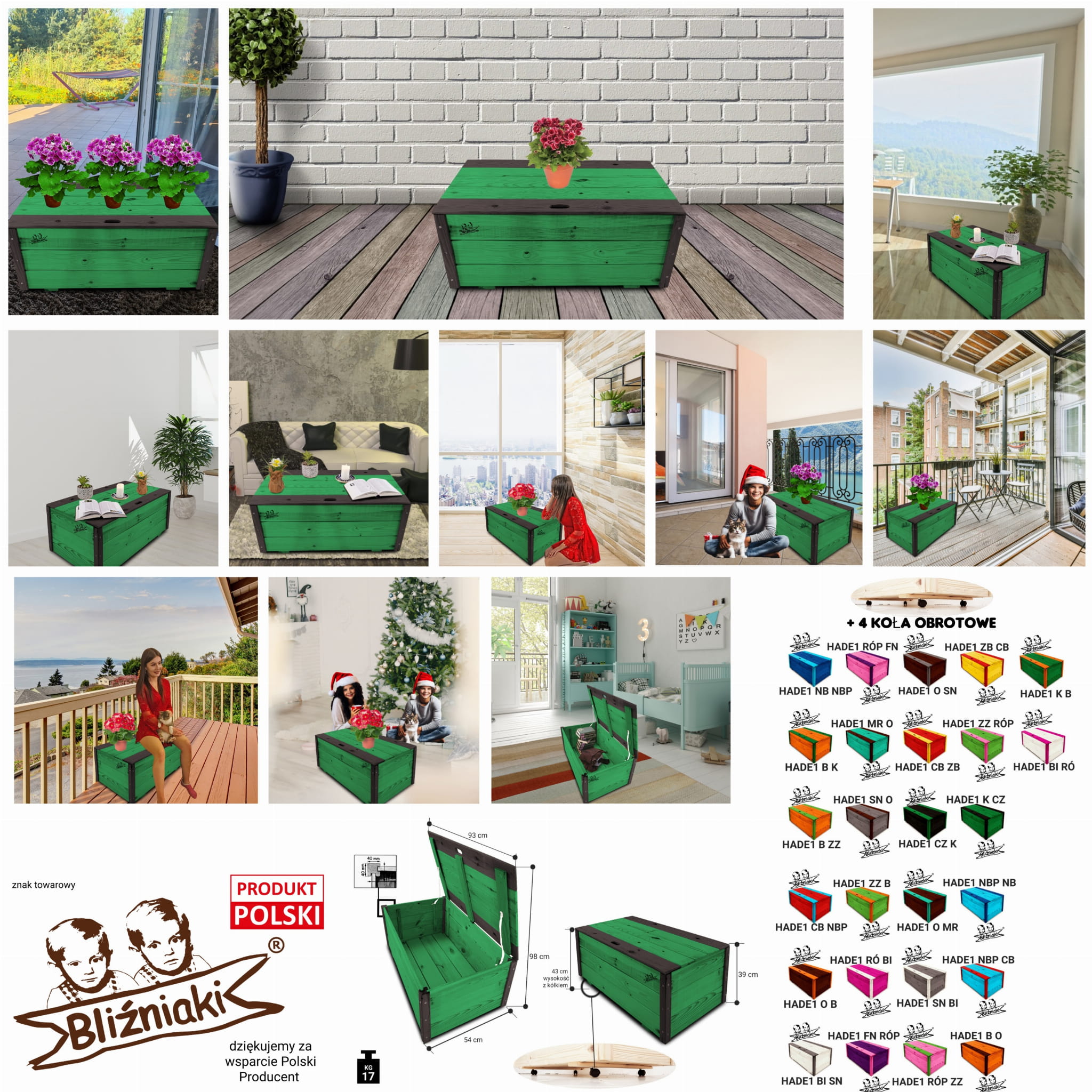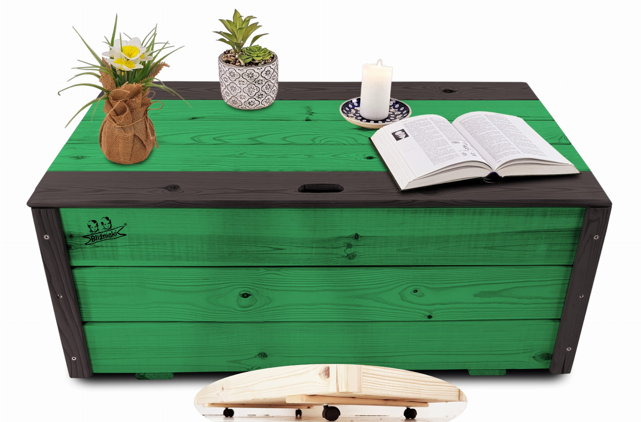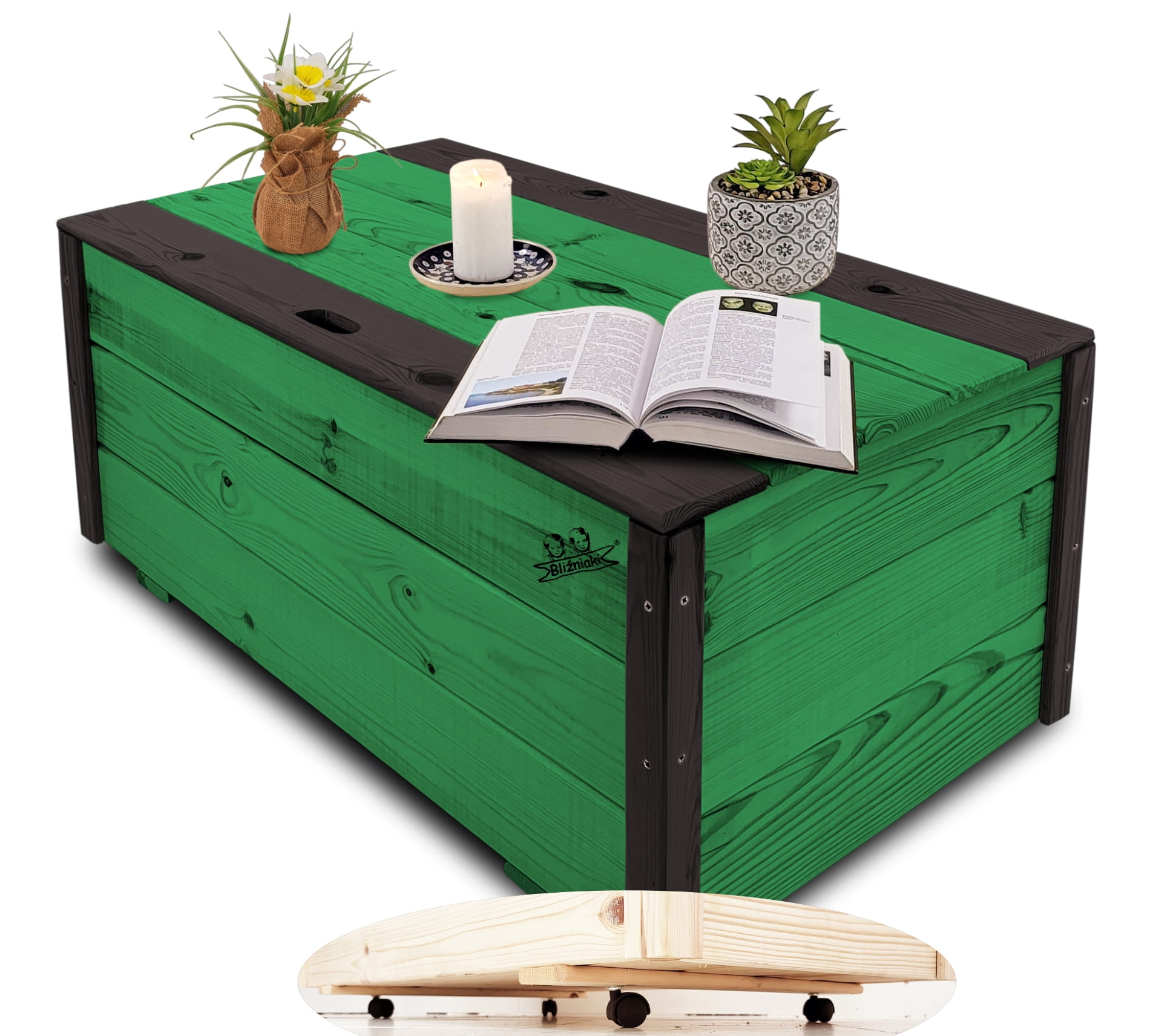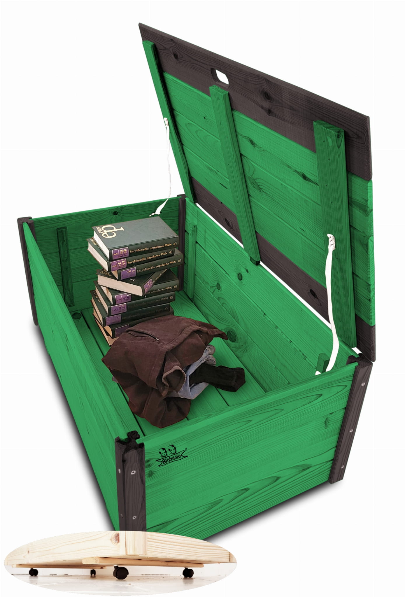Produkt wykonany został z suszonego drewna sosnowego. Zabezpieczony metodą impregnowania. Środek na bazie wody użyty do impregnacji jest w pełni ekologiczny i bezpieczny dla ludzi i zwierząt. Zabezpieczone w taki sposób drewno sprawia, że skrzynia jest odporna na szkodliwe działanie wody oraz wilgoci, promieni UV, a także grzybów i pleśni, może być więc przechowywana przez cały rok na zewnątrz. Produkt dwukolorowy, w podstawowej przeważającej części w kolorze ZIELONYM, został wykończony w kątownikach i listwach kolorem CZARNYM.