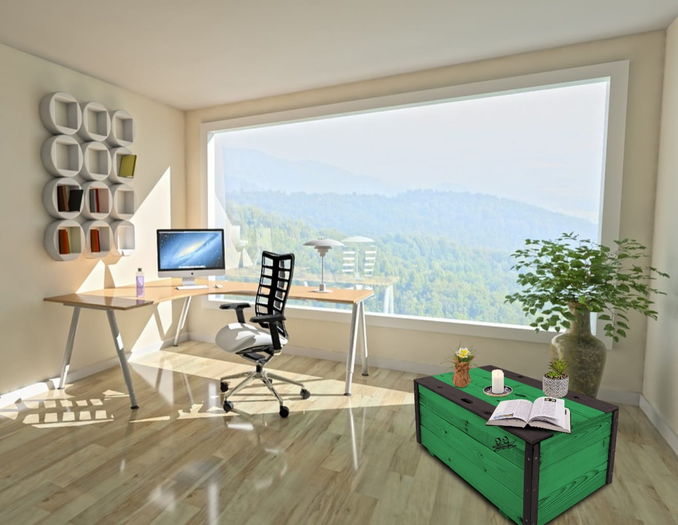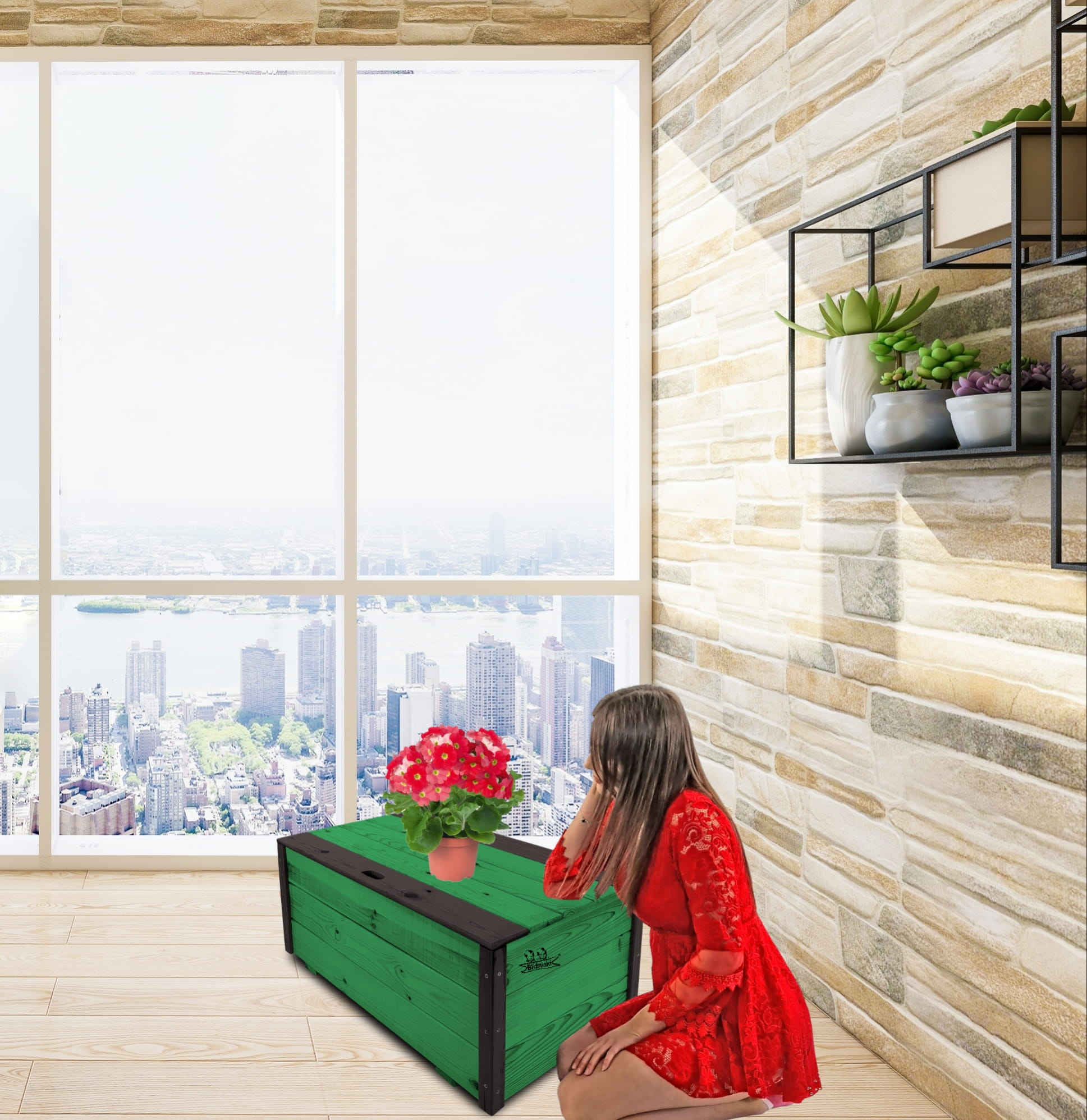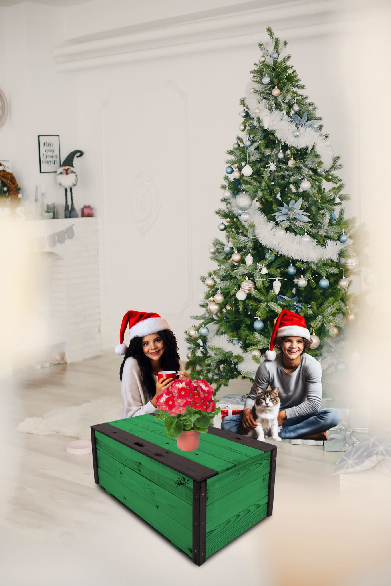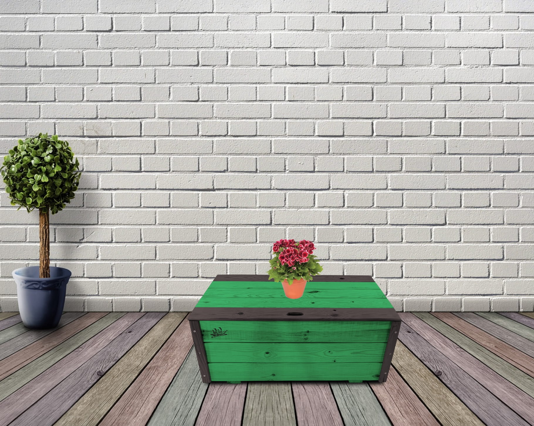 Produkt wykonany został z suszonego drewna sosnowego. Zabezpieczony metodą impregnowania. Środek na bazie wody użyty do impregnacji jest w pełni ekologiczny i bezpieczny dla ludzi i zwierząt. Zabezpieczone w taki sposób drewno sprawia, że skrzynia jest odporna na szkodliwe działanie wody oraz wilgoci, promieni UV, a także grzybów i pleśni, może być więc przechowywana przez cały rok na zewnątrz. Produkt dwukolorowy, w podstawowej przeważającej części w kolorze ZIELONYM, został wykończony w kątownikach i listwach kolorem CZARNYM.