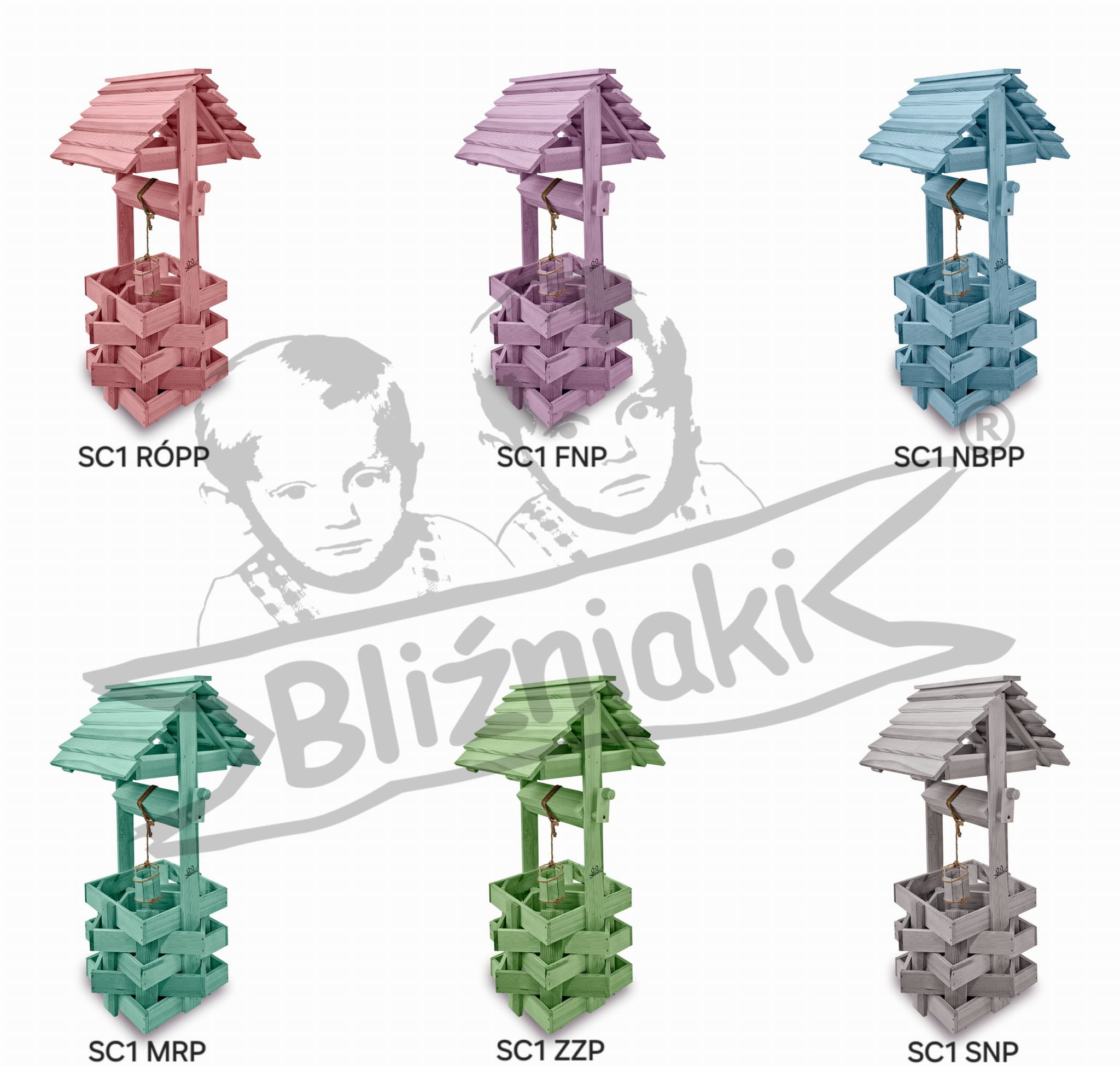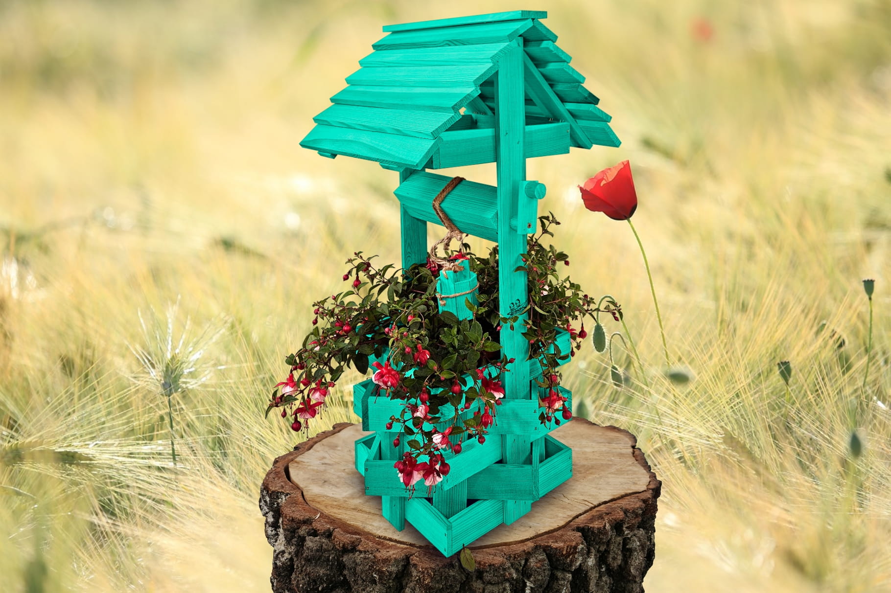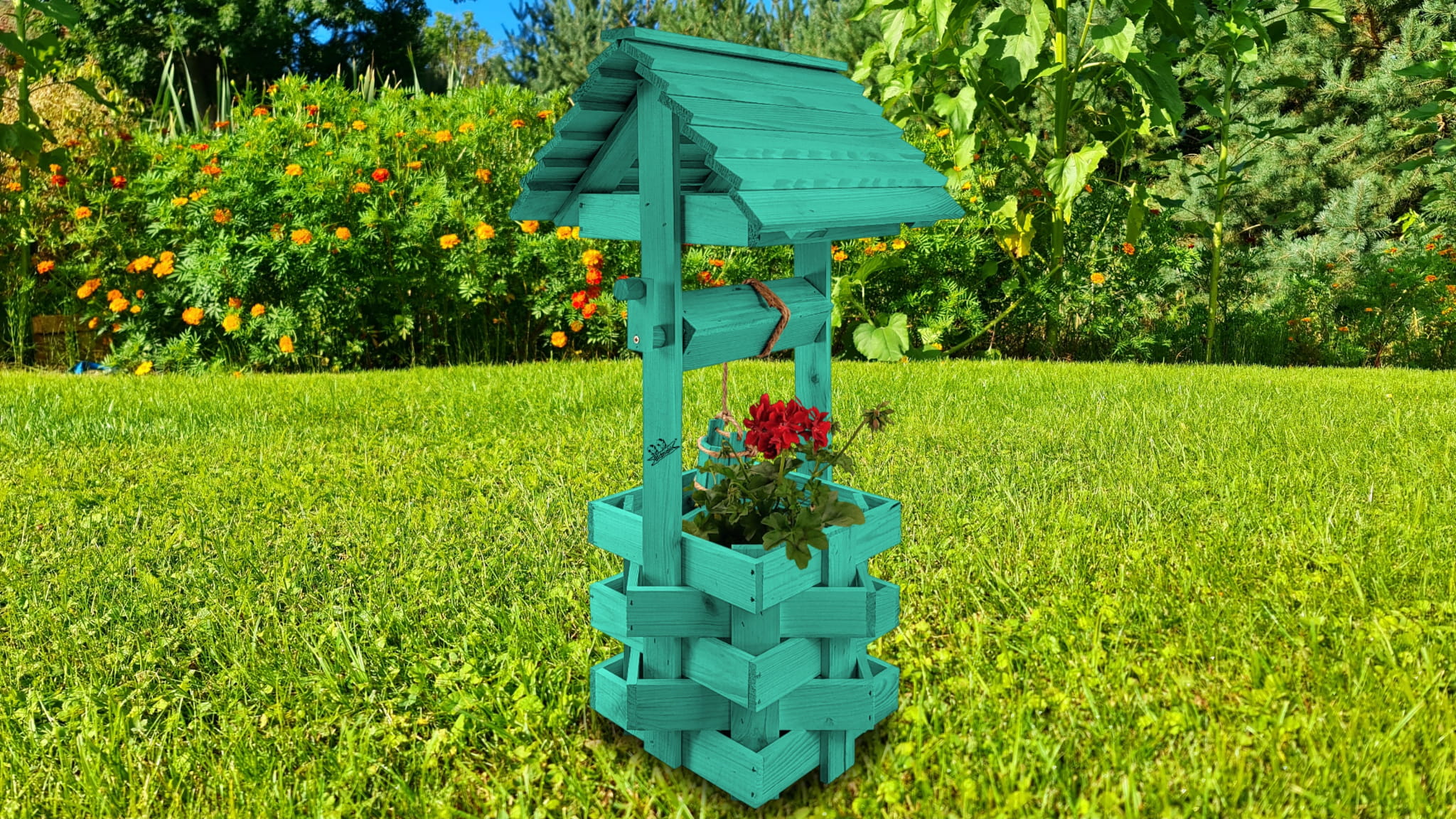 Do studni dołączona jest drewniana doniczka na kwiaty, utrzymana w tej samej estetyce, tworząc spójną i harmonijną całość.