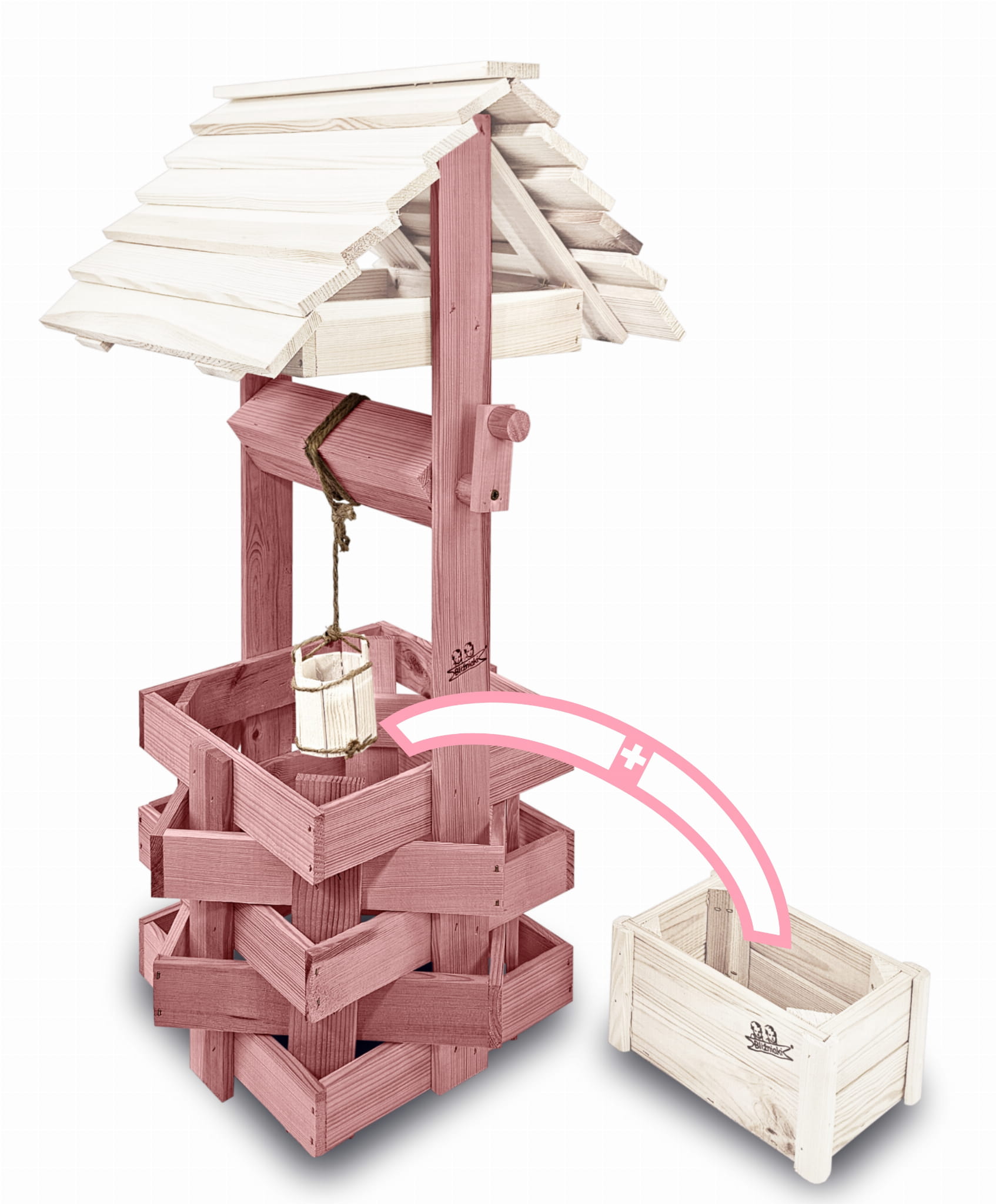 Do studni dołączona jest drewniana doniczka na kwiaty, utrzymana w tej samej estetyce, tworząc spójną i harmonijną całość.