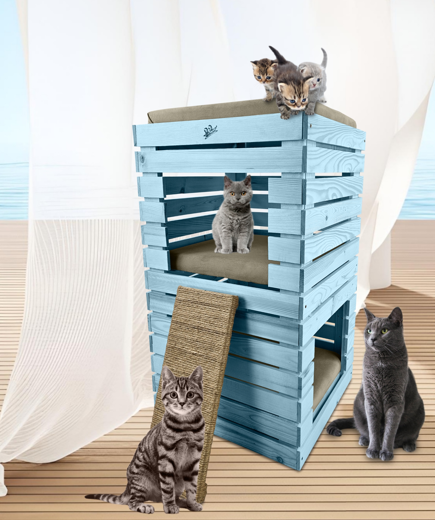 Trzy niezależne legowiska to rozwiązanie, które gwarantuje każdemu kotu prywatność i wygodę. Konstrukcja domku pozwala na przebywanie w nim kilku kotów na trzech poziomach.