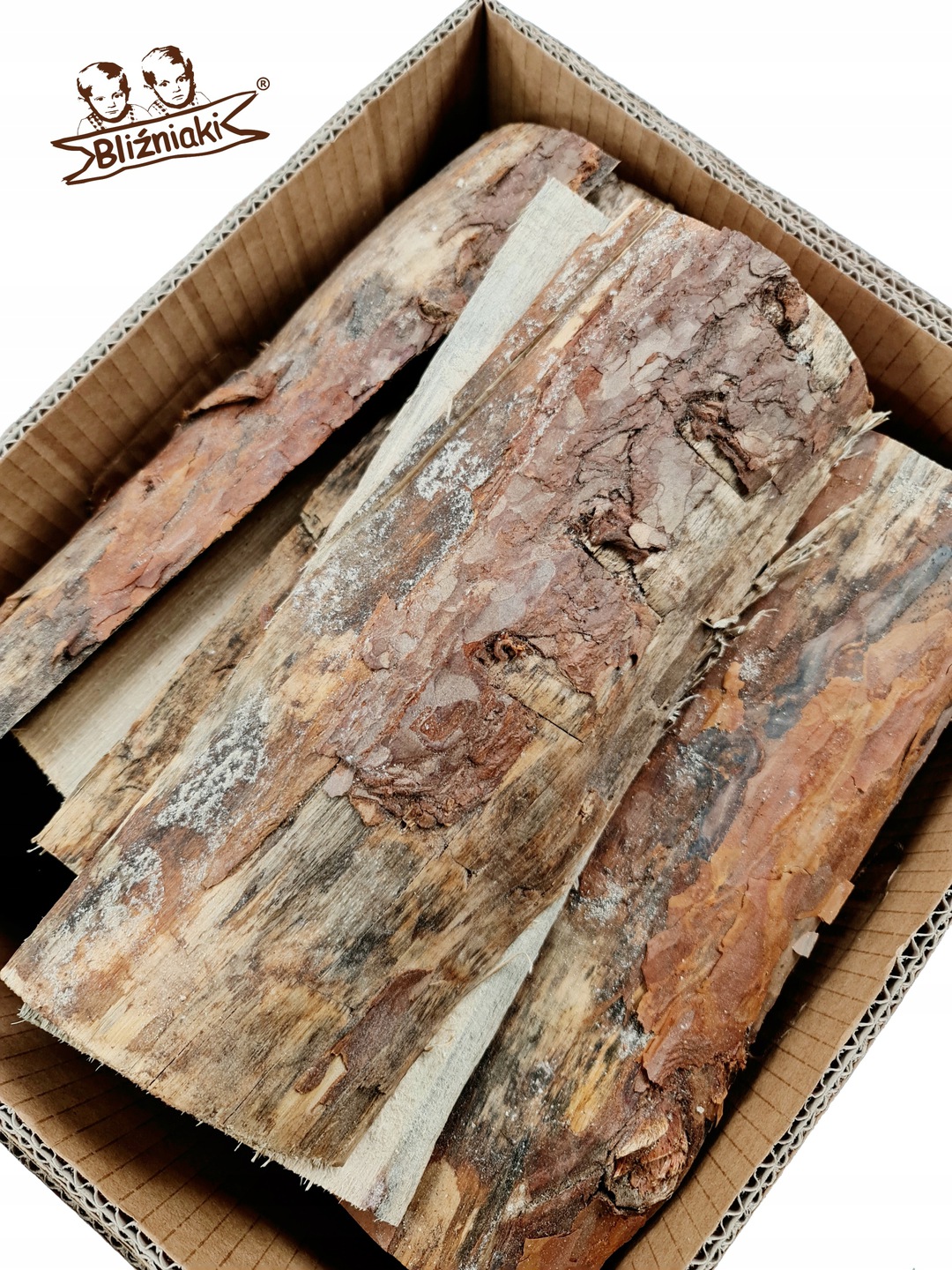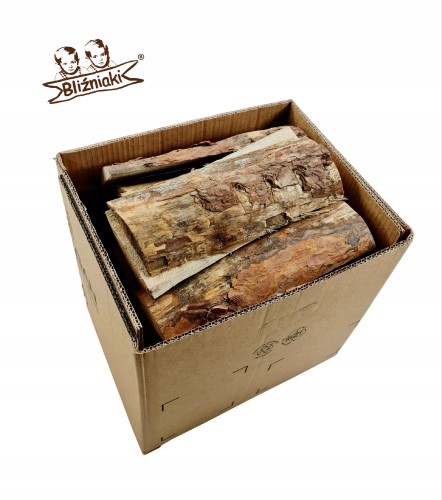 Nasz produkt to duże, grube kawałki drewna, około 30 cm długości, zapakowane w karton.