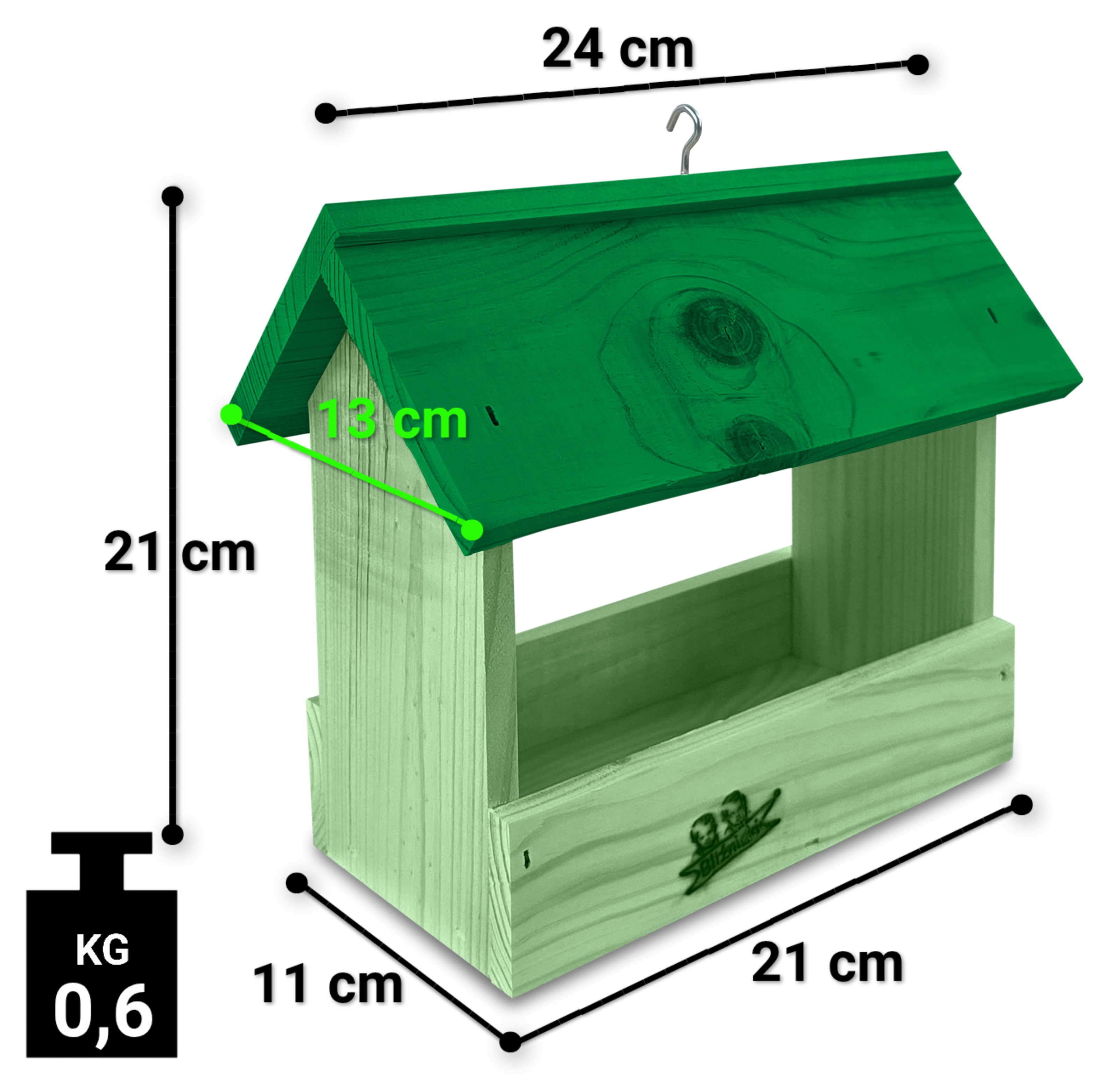 - Karmnik wykonany jest w całości z drewna iglastego, KOLOR JASNA ZIELEŃ Z CIEMNOZIELONYM DACHEM