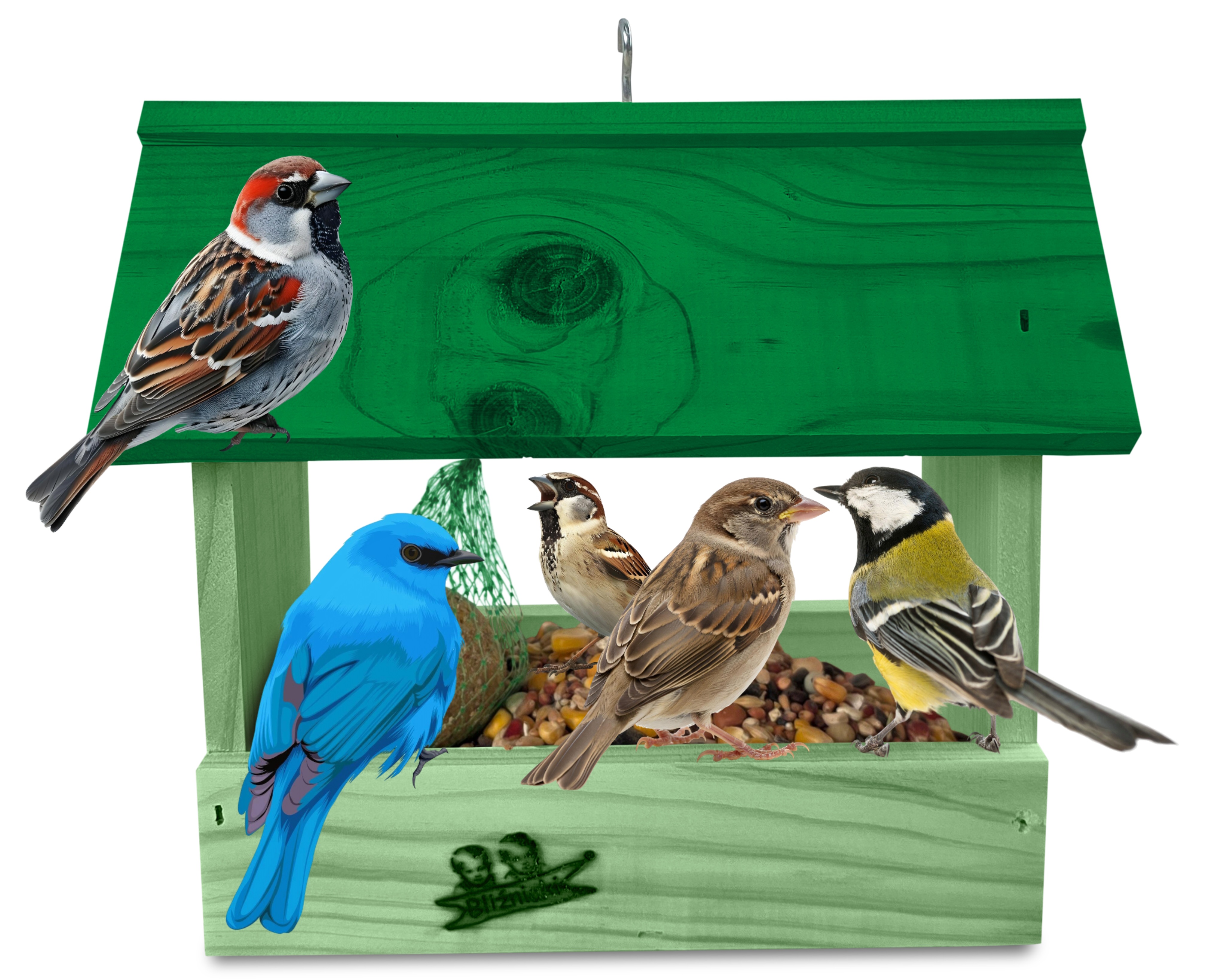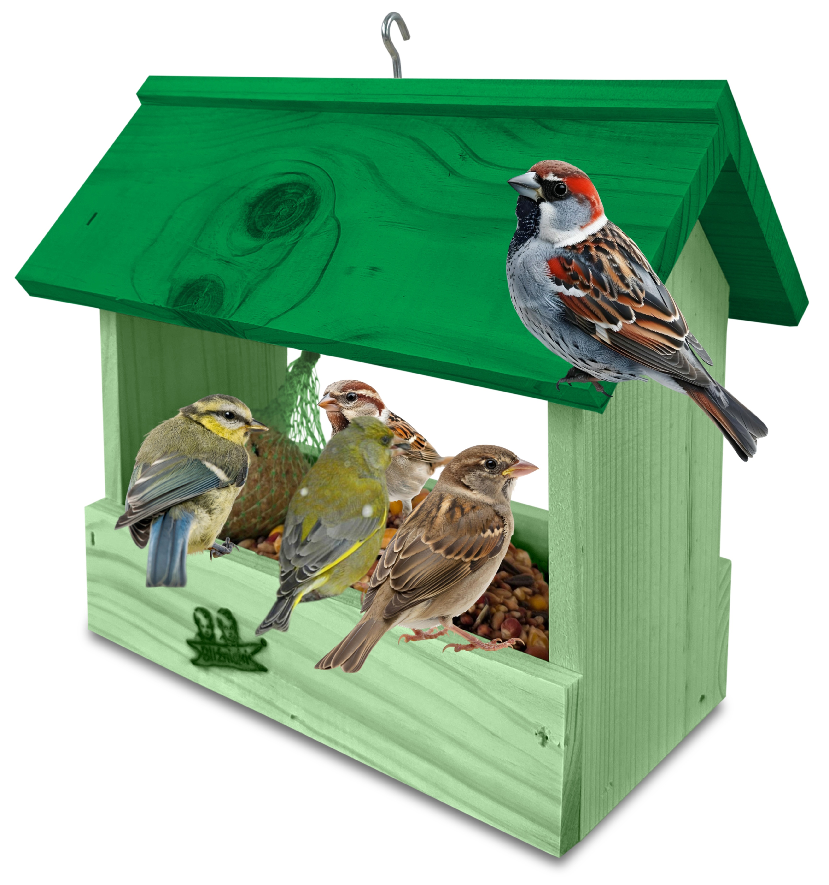 - U góry widoczny jest haczyk umożliwiający zawieszenie karmnika w dowolnym miejscu, możliwe jest również jego postawienie