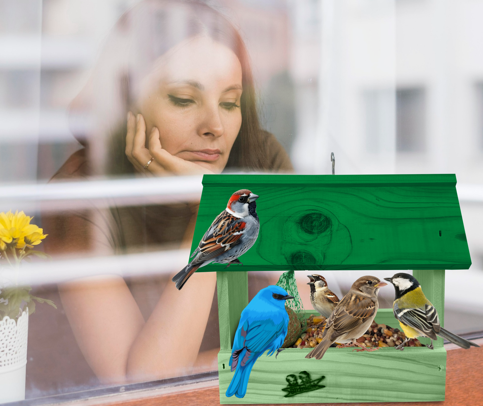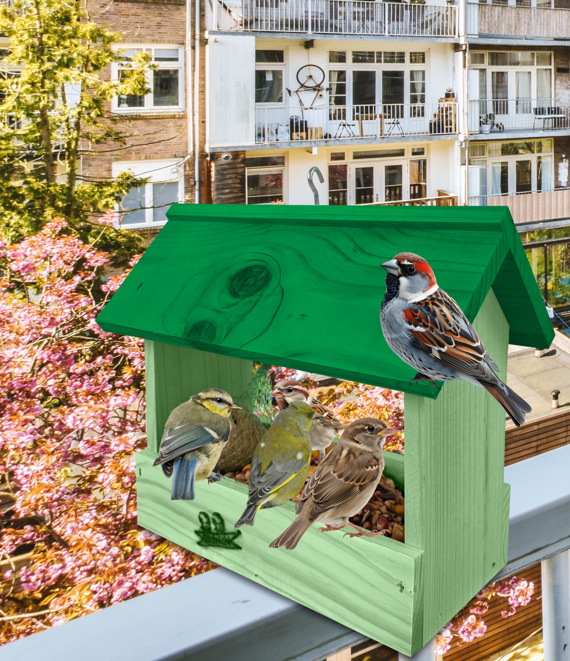 Przedmiotem sprzedaży jest ozdobny drewniany karmnik dla ptaków budka domek na balkon K204 ZZP K kolor jasna zieleń z ciemnozielonym dachem