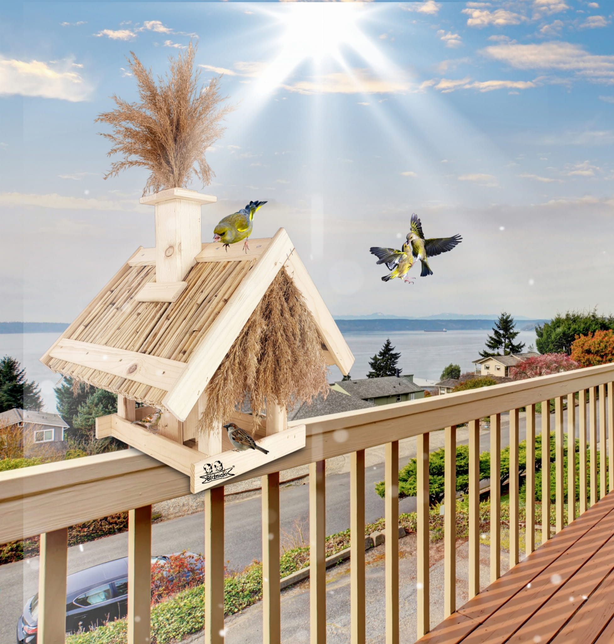 - Na szczytach dachu jest kurtyna z trzciny, która dodatkowo zdobi karmnik a także chroni pokarm przed zamakaniem i wywiewaniem
