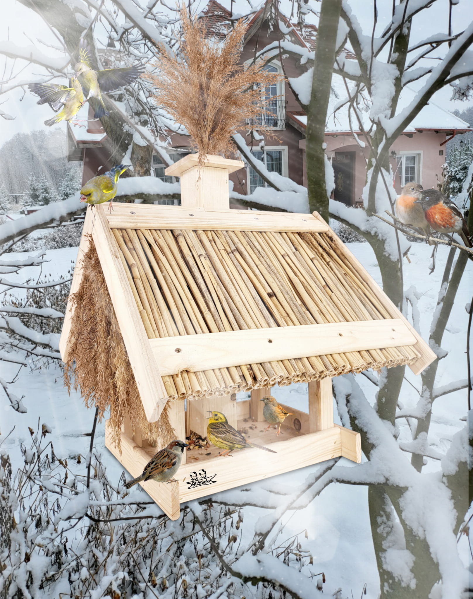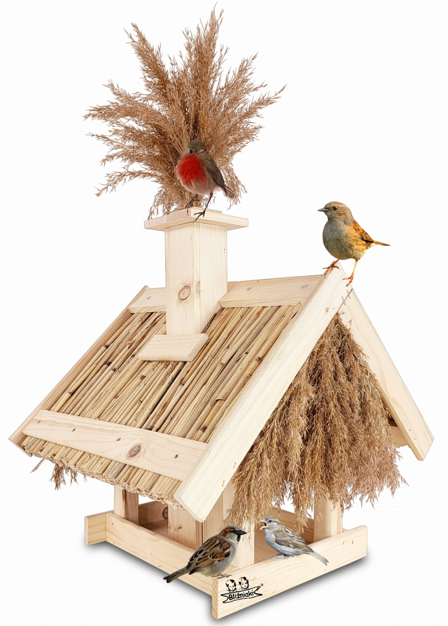 Karmnik dla ptaków został wykonany w przeważającej części z drewna, konstrukcja wyposażona w solidny dach na którym jest trzcinowa słoma, karmnik uwieńczony kominem na szczycie którego jest pióropusz z trzciny oraz zwisające kurtyny z trzciny z wiatrownic ochraniające pokarm przed zacinającym deszczem, wiatrem czy śniegiem. Karmnik wysyłany w postaci zmontowanej, nie wymaga samodzielnego montażu.