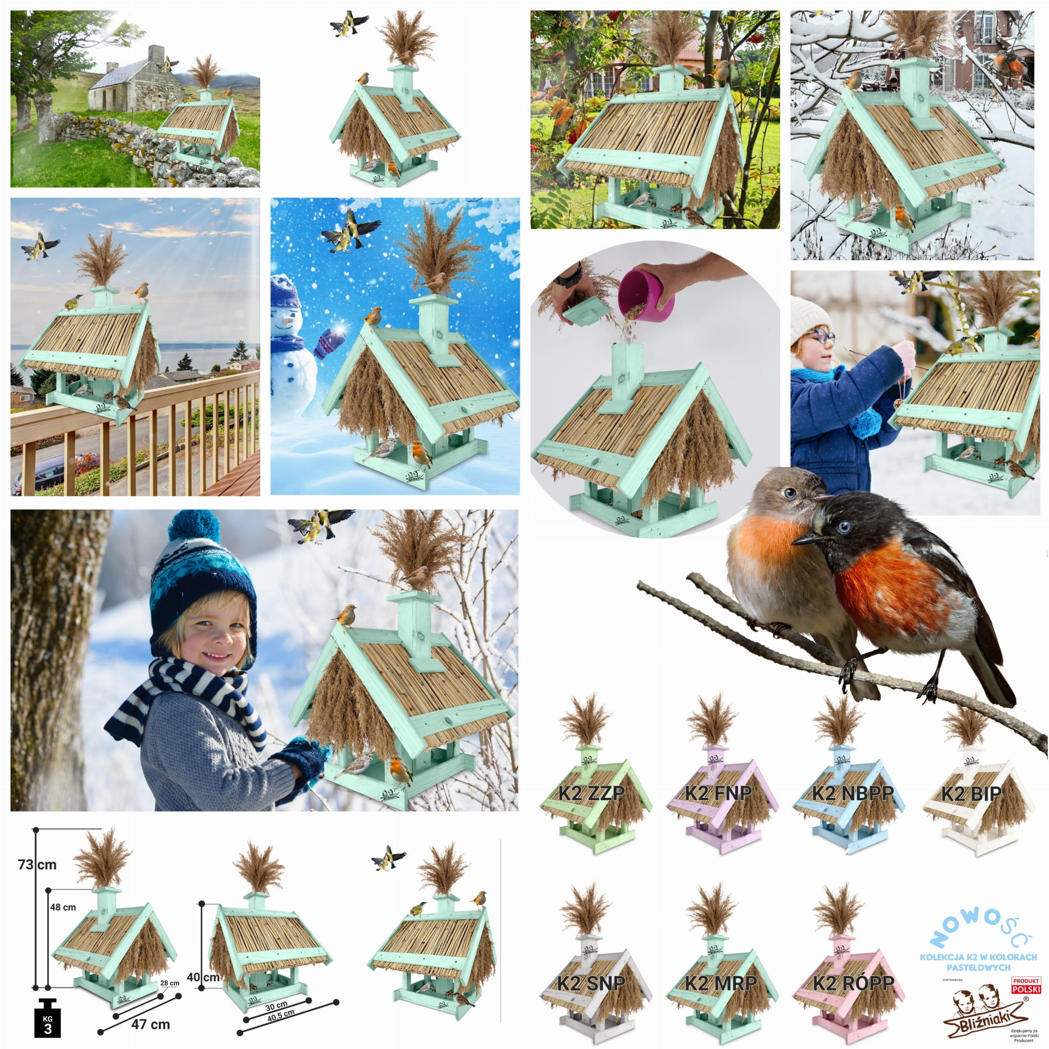 Karmnik dla ptaków został wykonany w przeważającej części z drewna, konstrukcja wyposażona w solidny dach na którym jest trzcinowa słoma, karmnik uwieńczony kominem na szczycie którego jest pióropusz z trzciny oraz zwisające kurtyny z trzciny z wiatrownic ochraniające pokarm przed zacinającym deszczem, wiatrem czy śniegiem. Karmnik wysyłany w postaci zmontowanej, nie wymaga samodzielnego montażu.