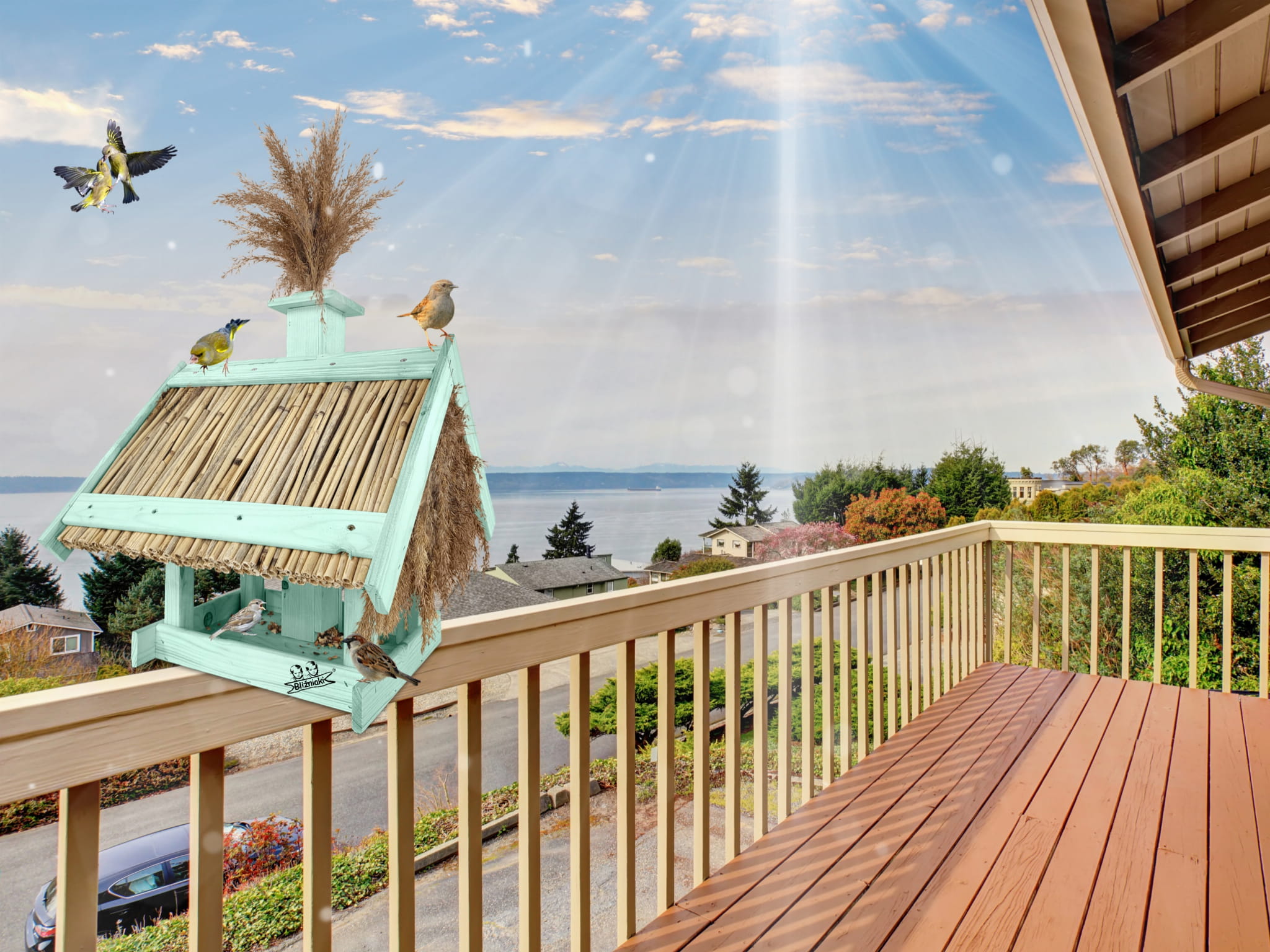 - Na szczytach dachu jest kurtyna z trzciny, która dodatkowo zdobi karmnik a także chroni pokarm przed zamakaniem i wywiewaniem