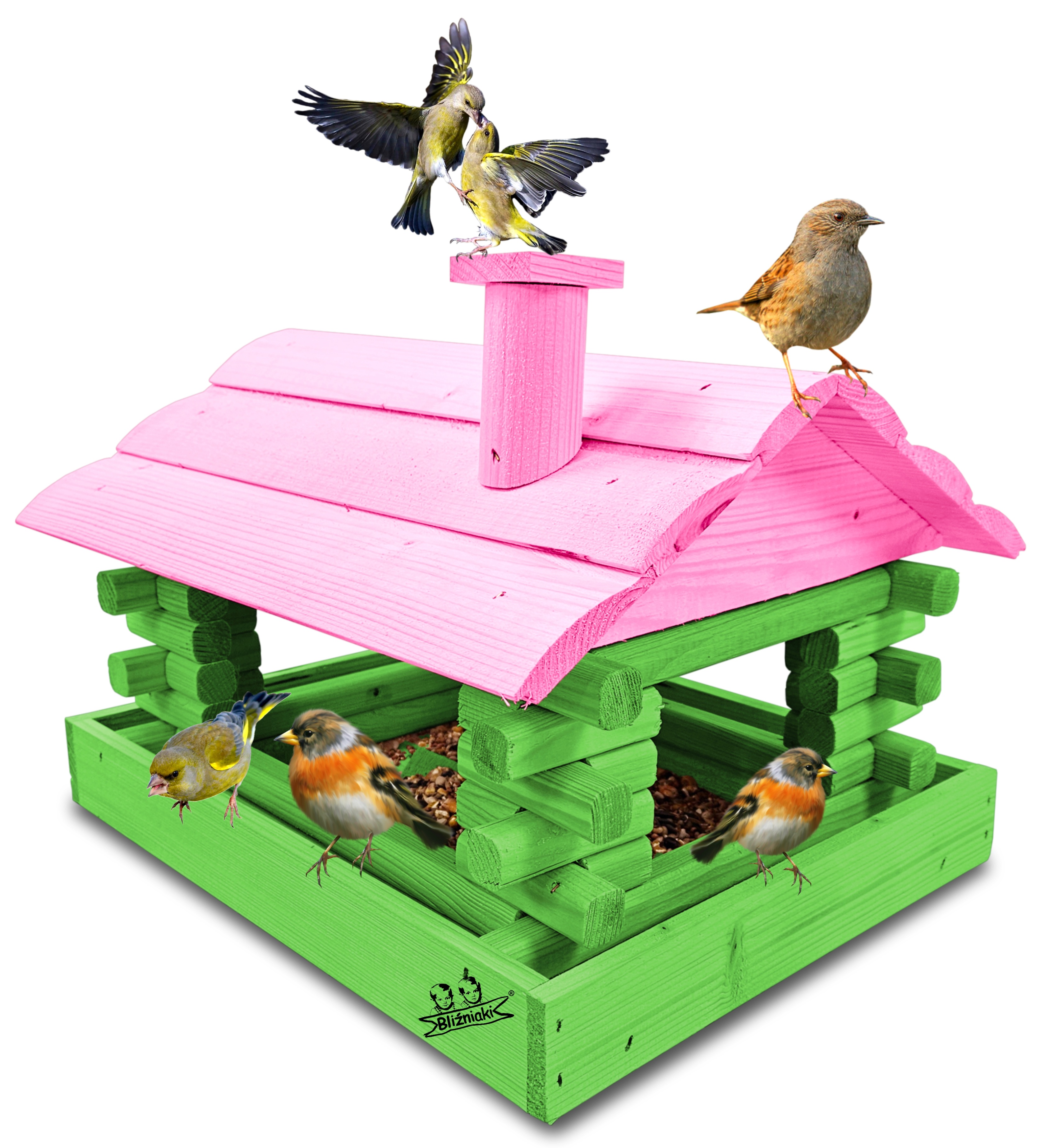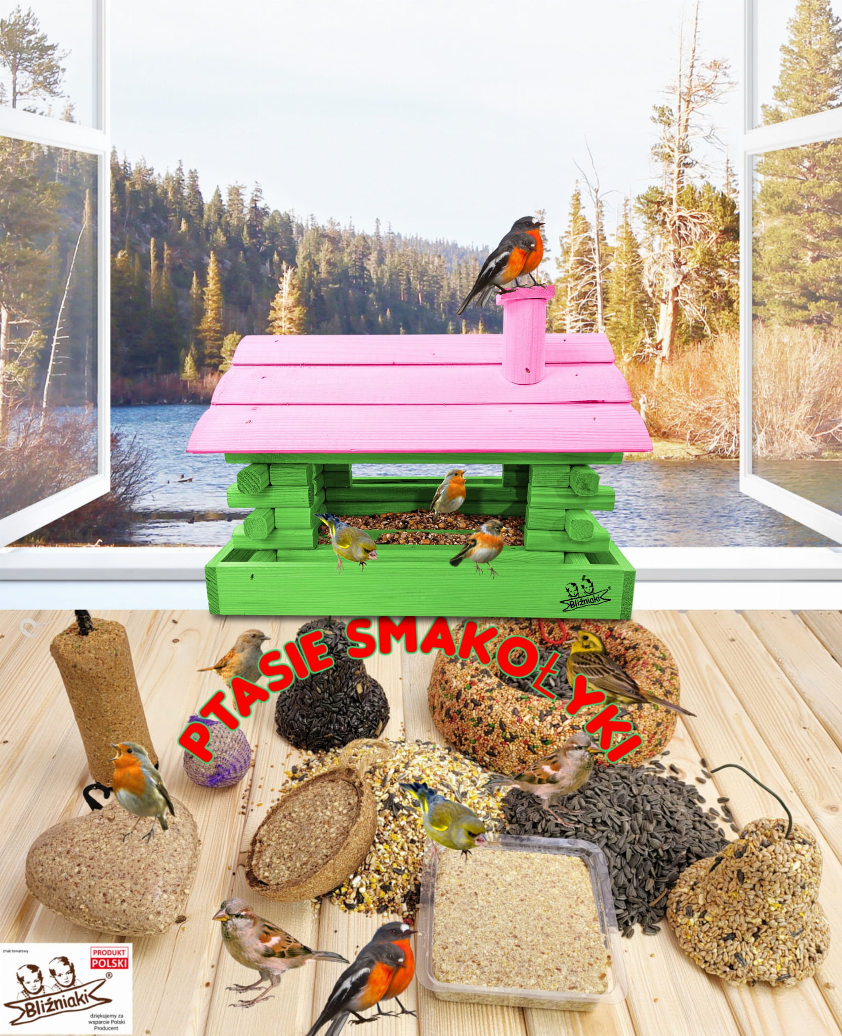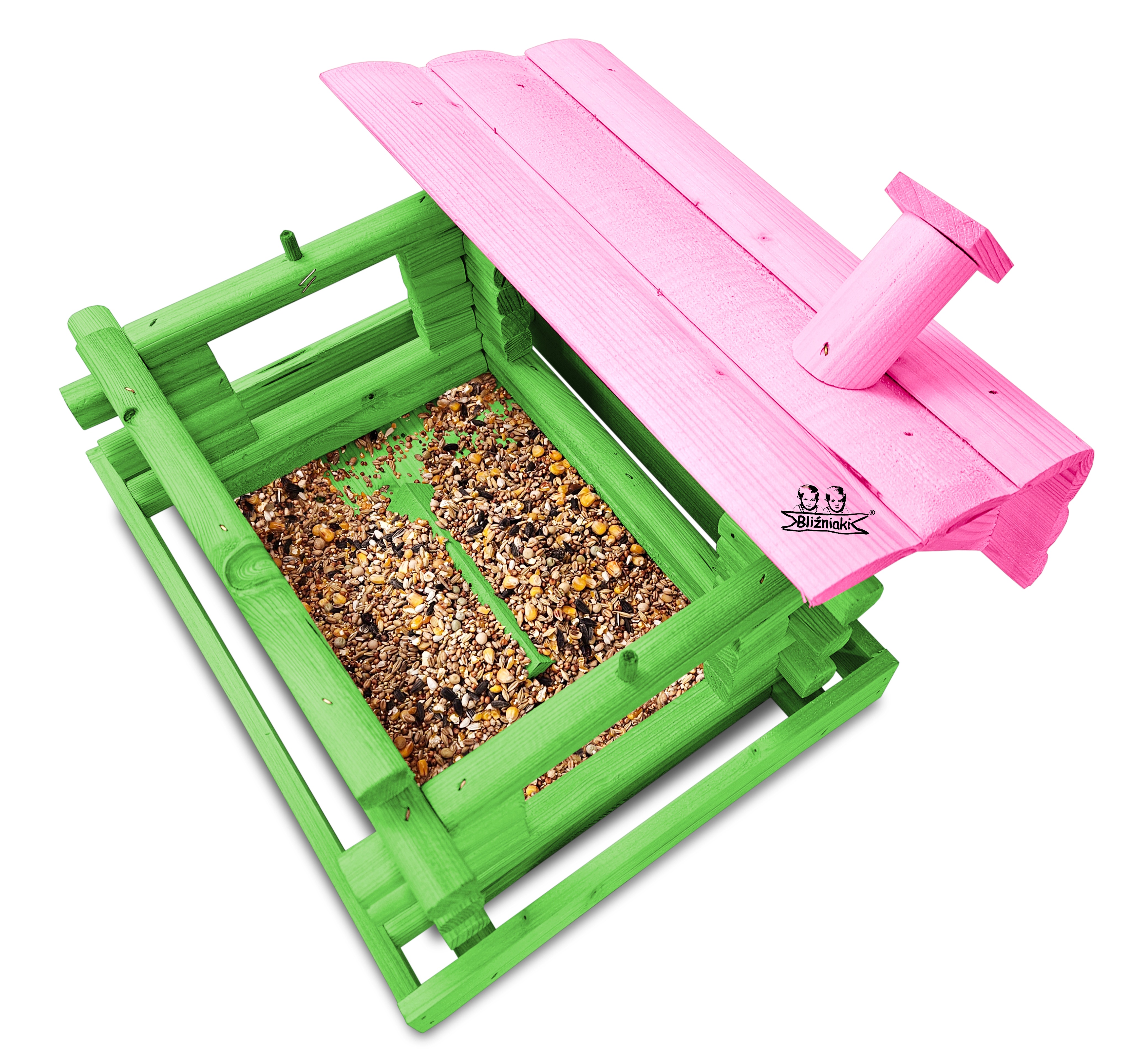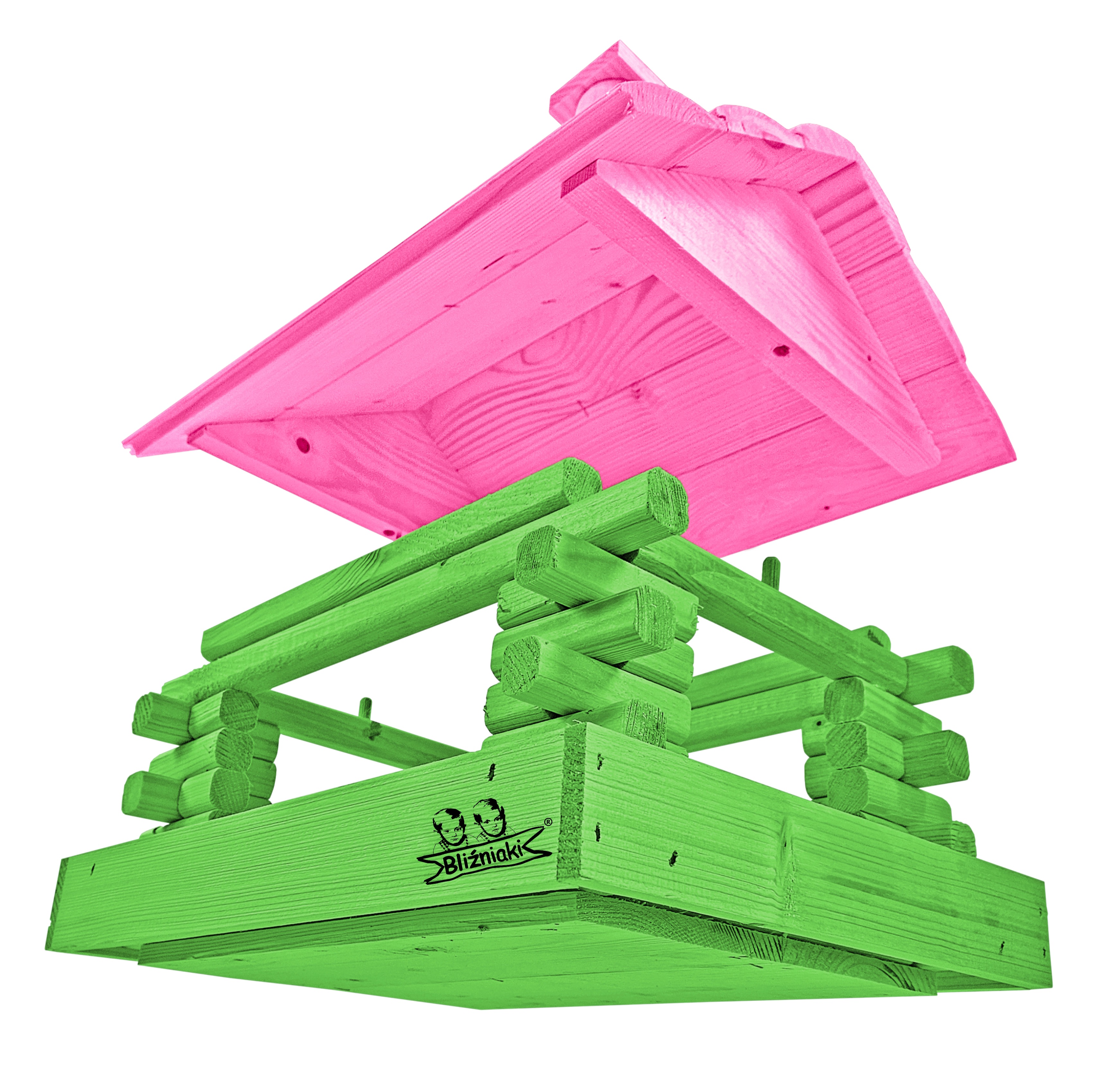 Karmnik Drewniany Zielony z Różowym z Otwieranym Dachem na Balkon Taras Okno Karmniki Ekologiczne Ozdobne Schronienie Domek Karmniczek na Pokarm dla Ptaków K182a ZZ RÓP