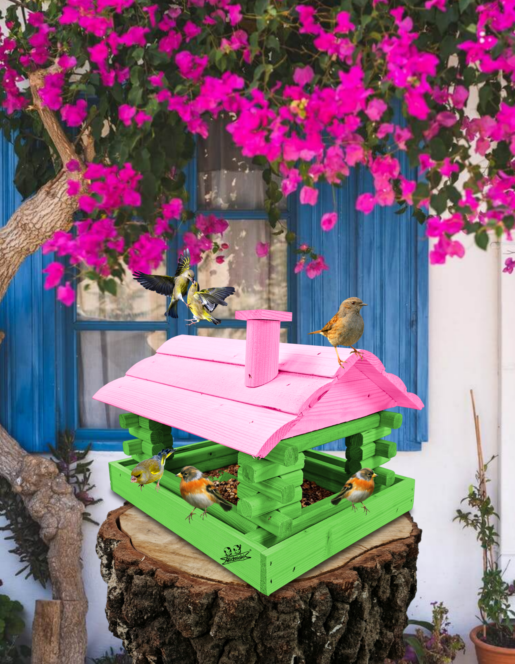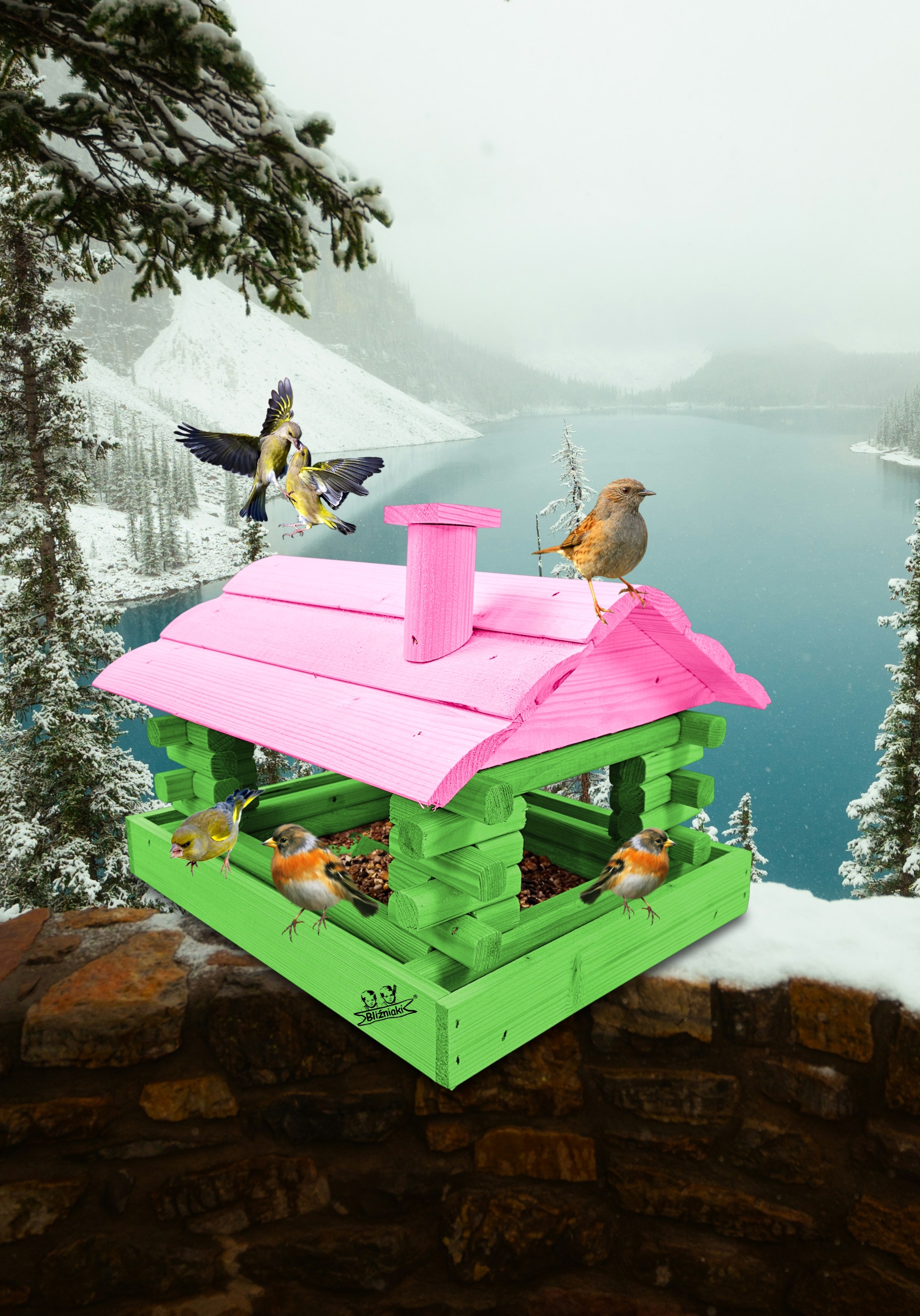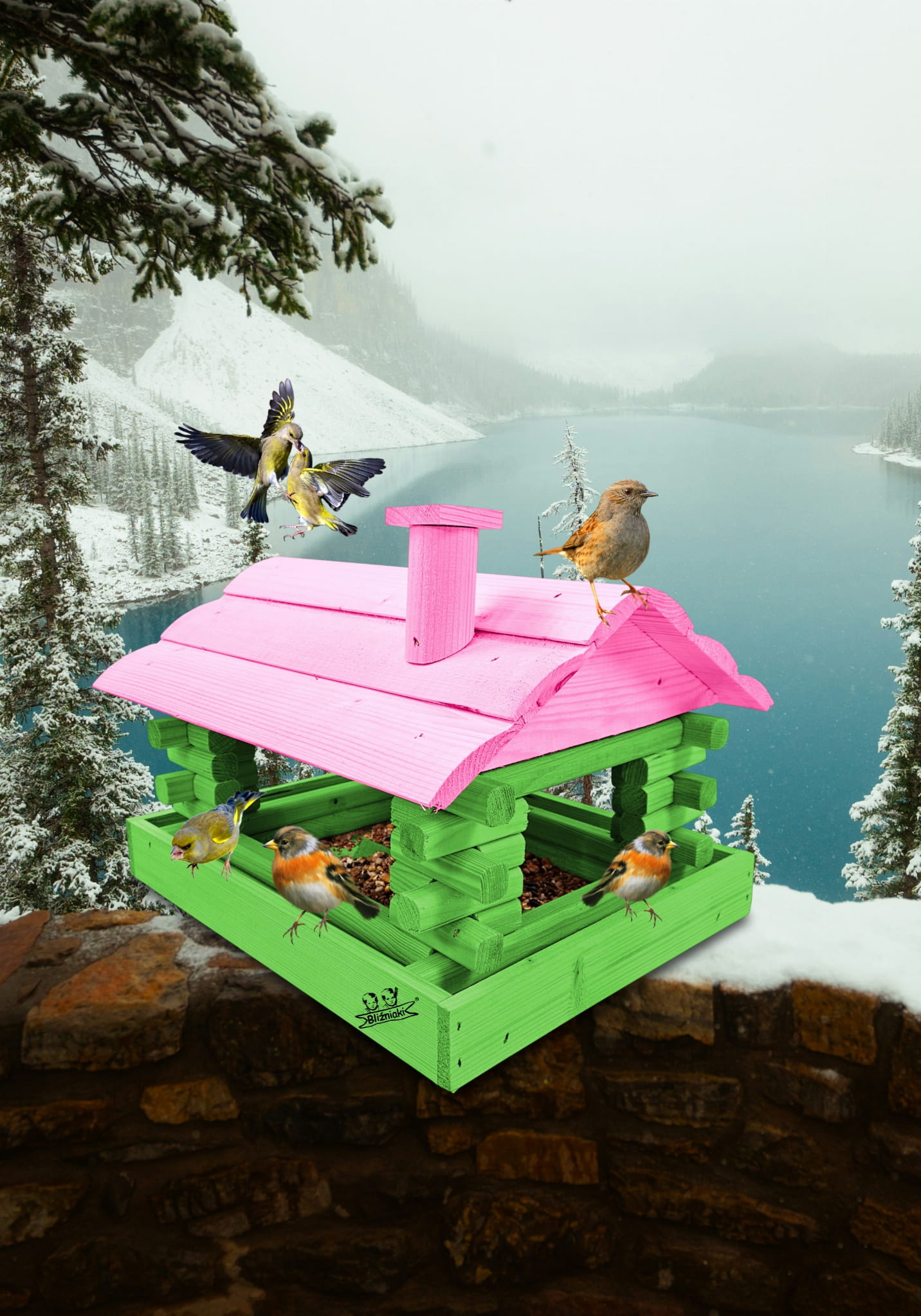 Karmnik Drewniany Zielony z Różowym z Otwieranym Dachem na Balkon Taras Okno Karmniki Ekologiczne Ozdobne Schronienie Domek Karmniczek na Pokarm dla Ptaków K182a ZZ RÓP