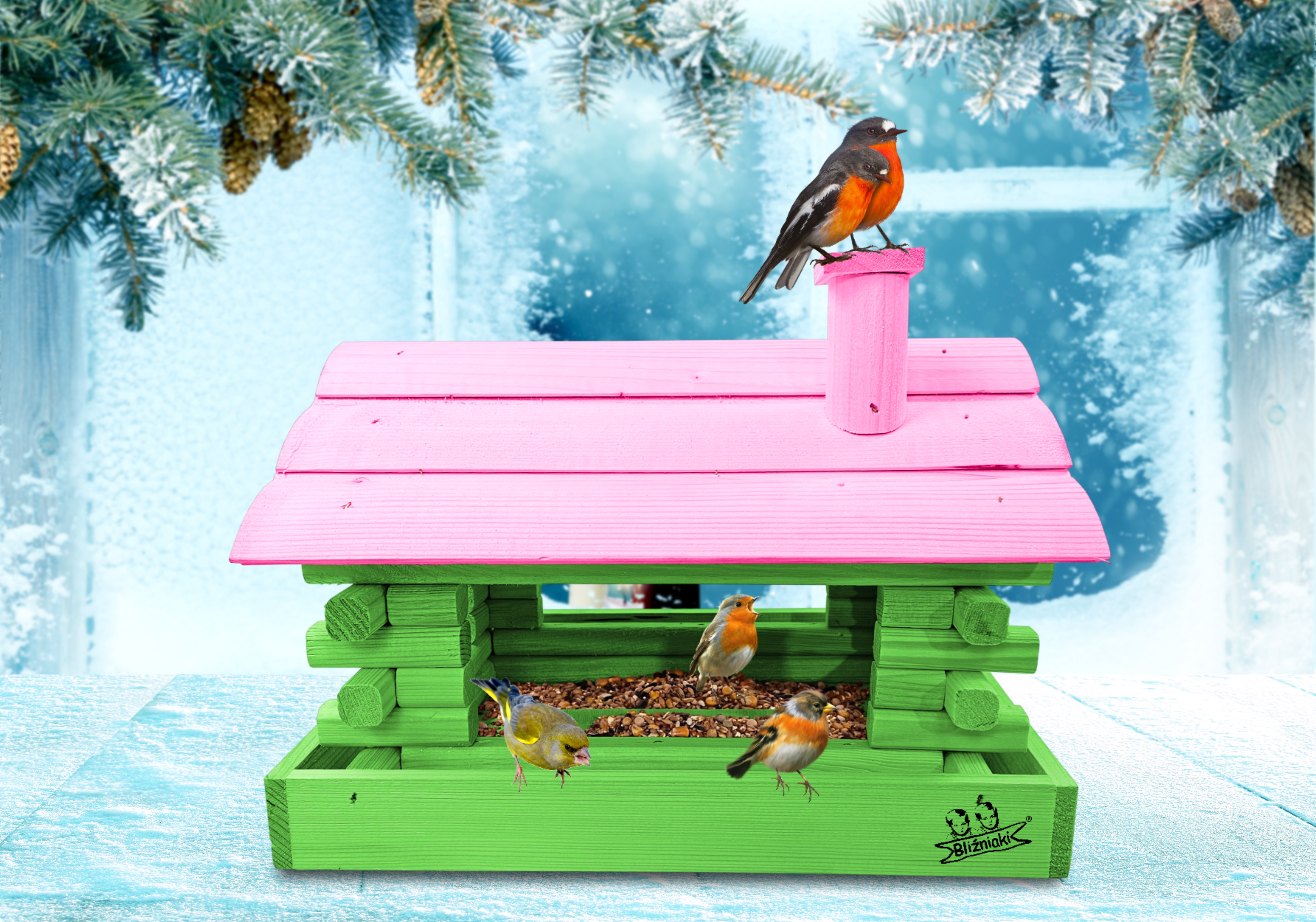 Karmnik wykonany z trwałego drewna, o starannym wykończeniu, przypomina klasyczny domek z kominem. Zapewnia ptakom bezpieczne i przytulne miejsce do odpoczynku oraz dostępu do pożywienia w zimniejszych miesiącach.