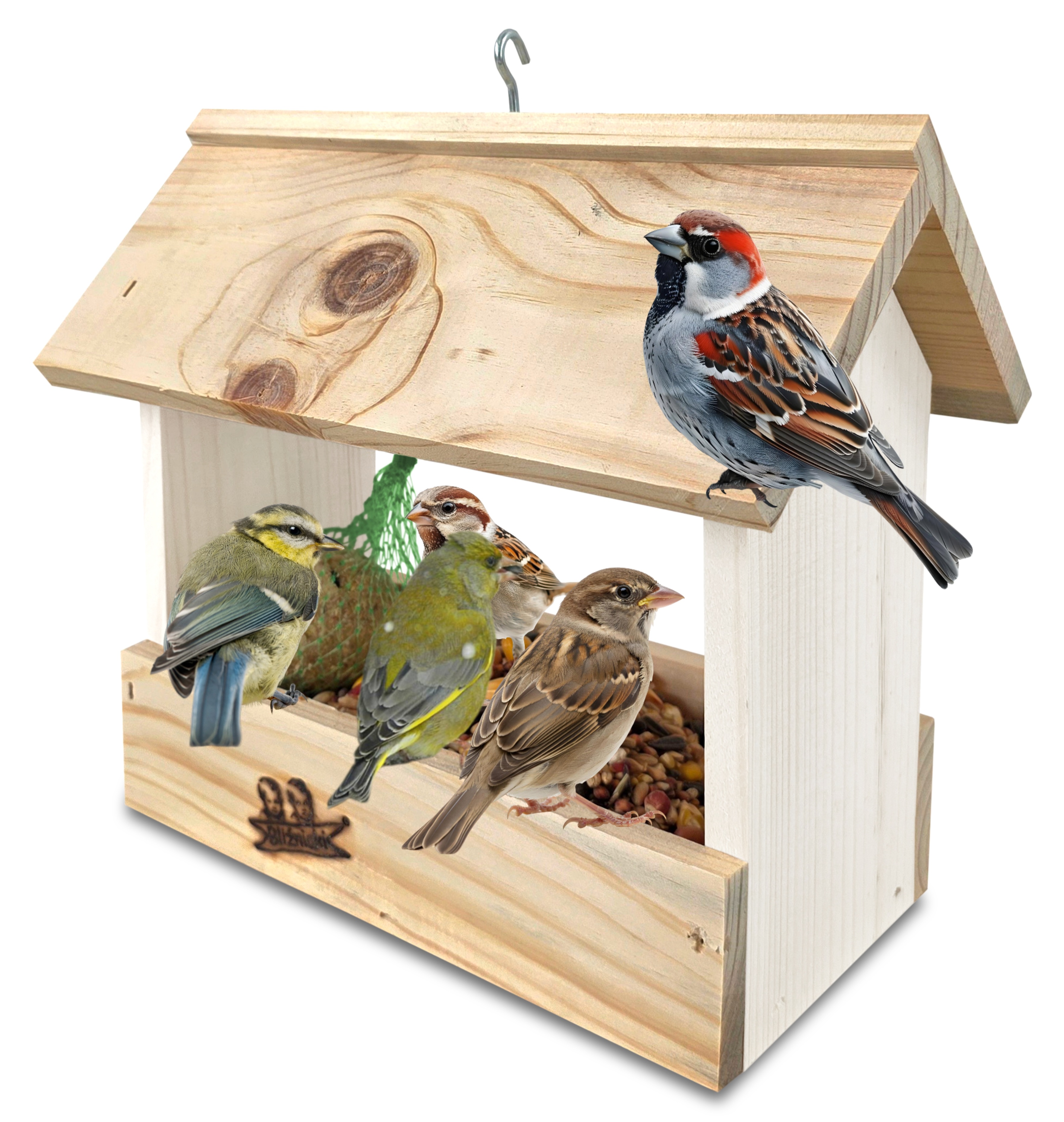- U góry widoczny jest haczyk umożliwiający zawieszenie karmnika w dowolnym miejscu, możliwe jest również jego postawienie