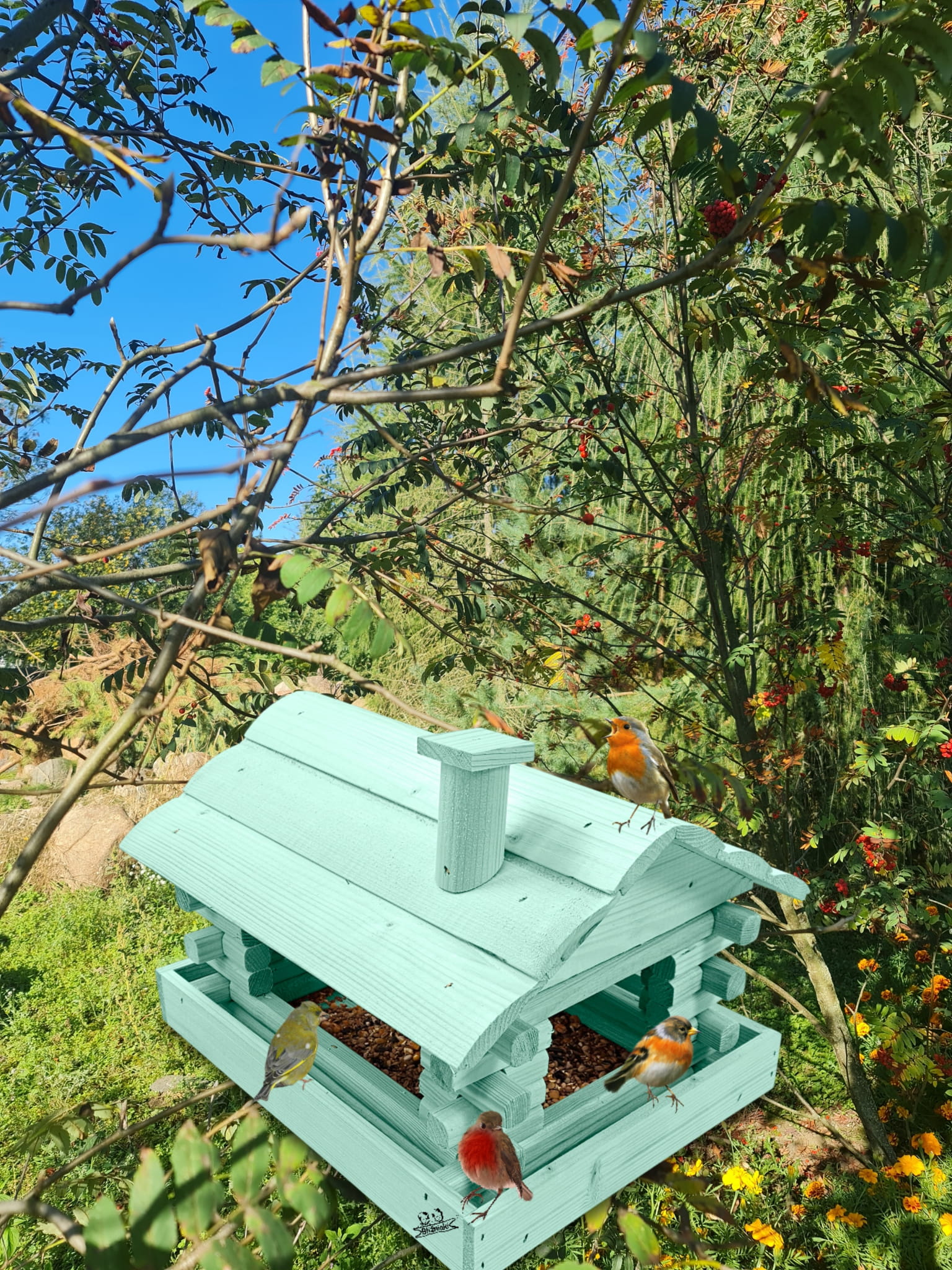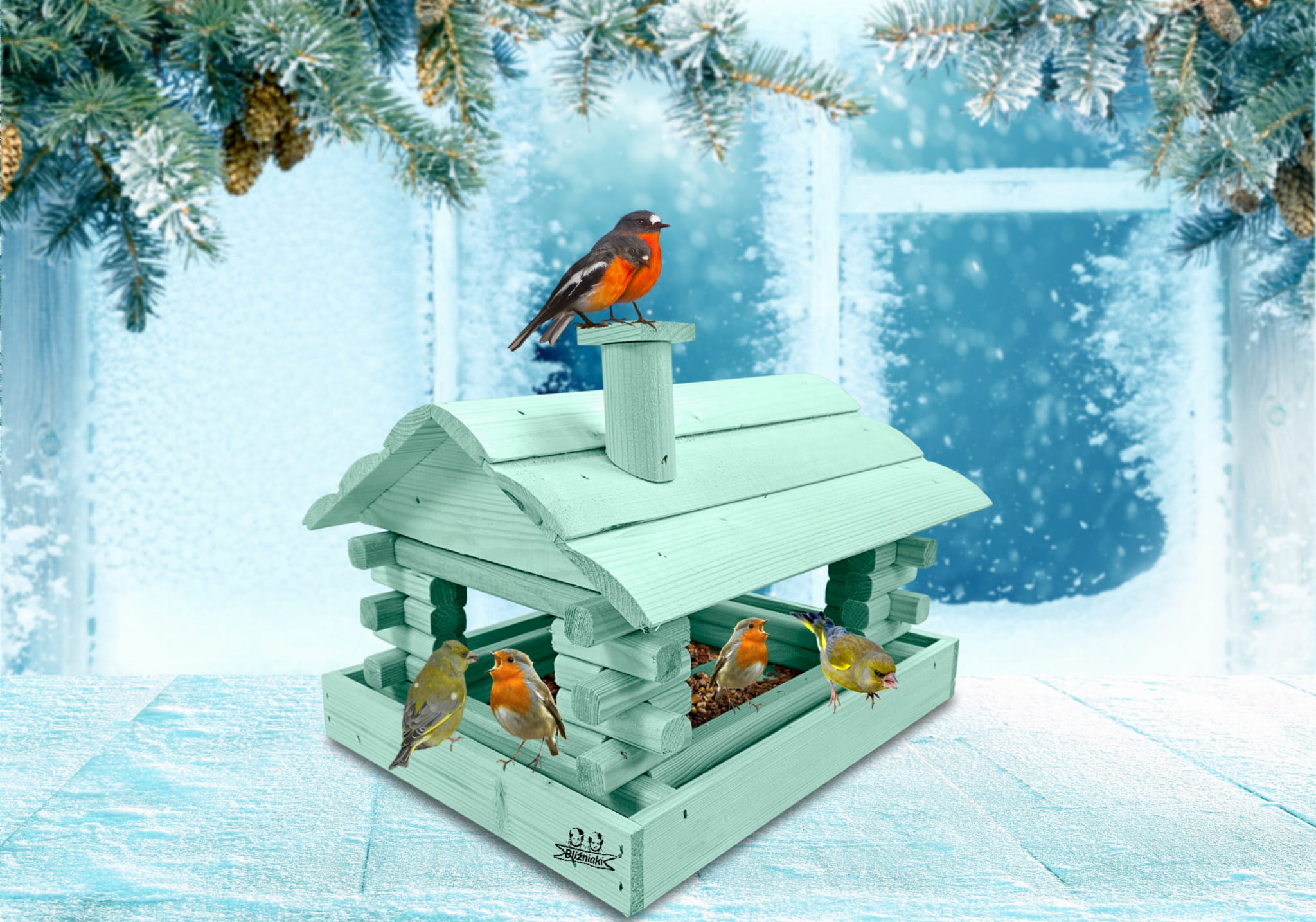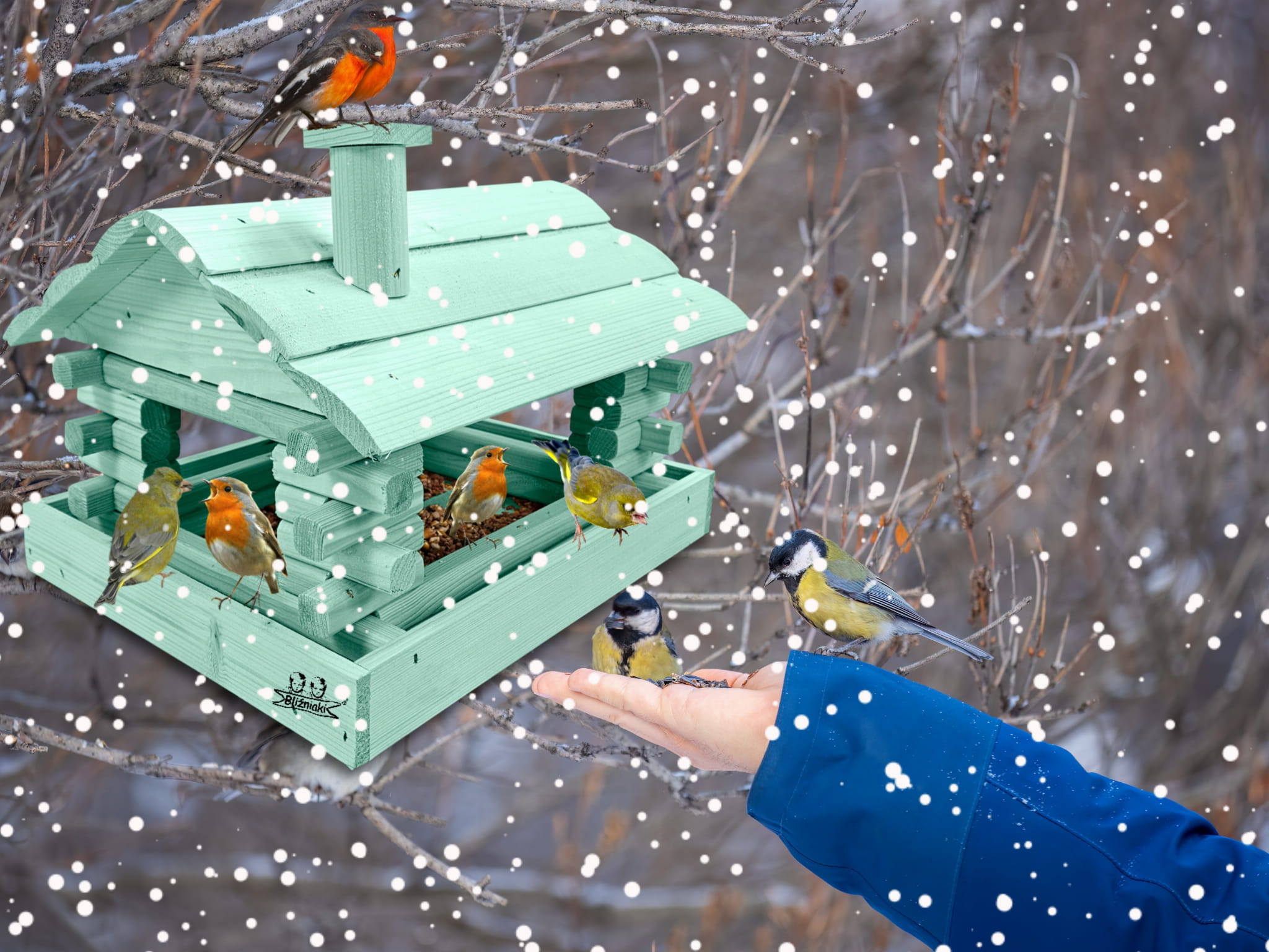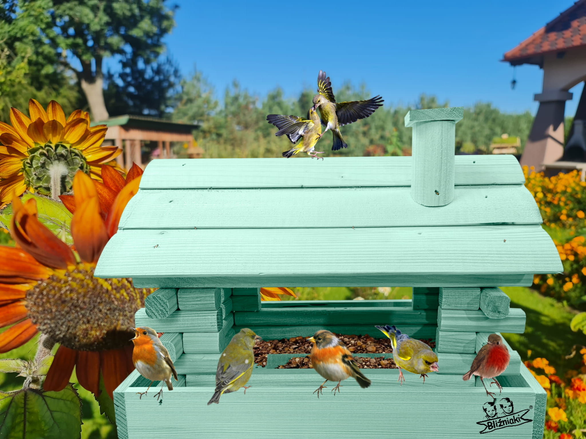 Karmnik wykonany z trwałego drewna, o starannym wykończeniu, przypomina klasyczny domek z kominem. Zapewnia ptakom bezpieczne i przytulne miejsce do odpoczynku oraz dostępu do pożywienia w zimniejszych miesiącach.
