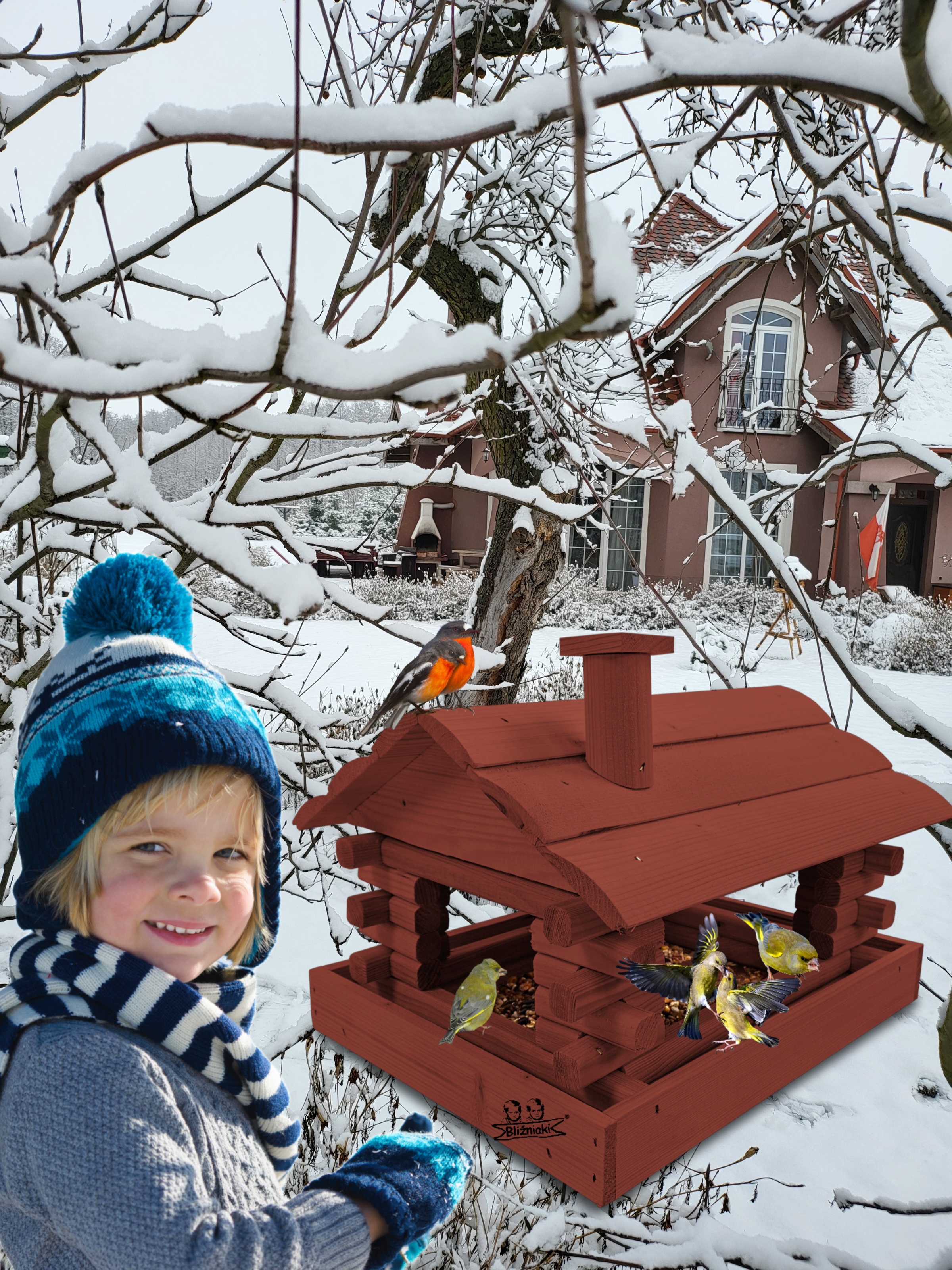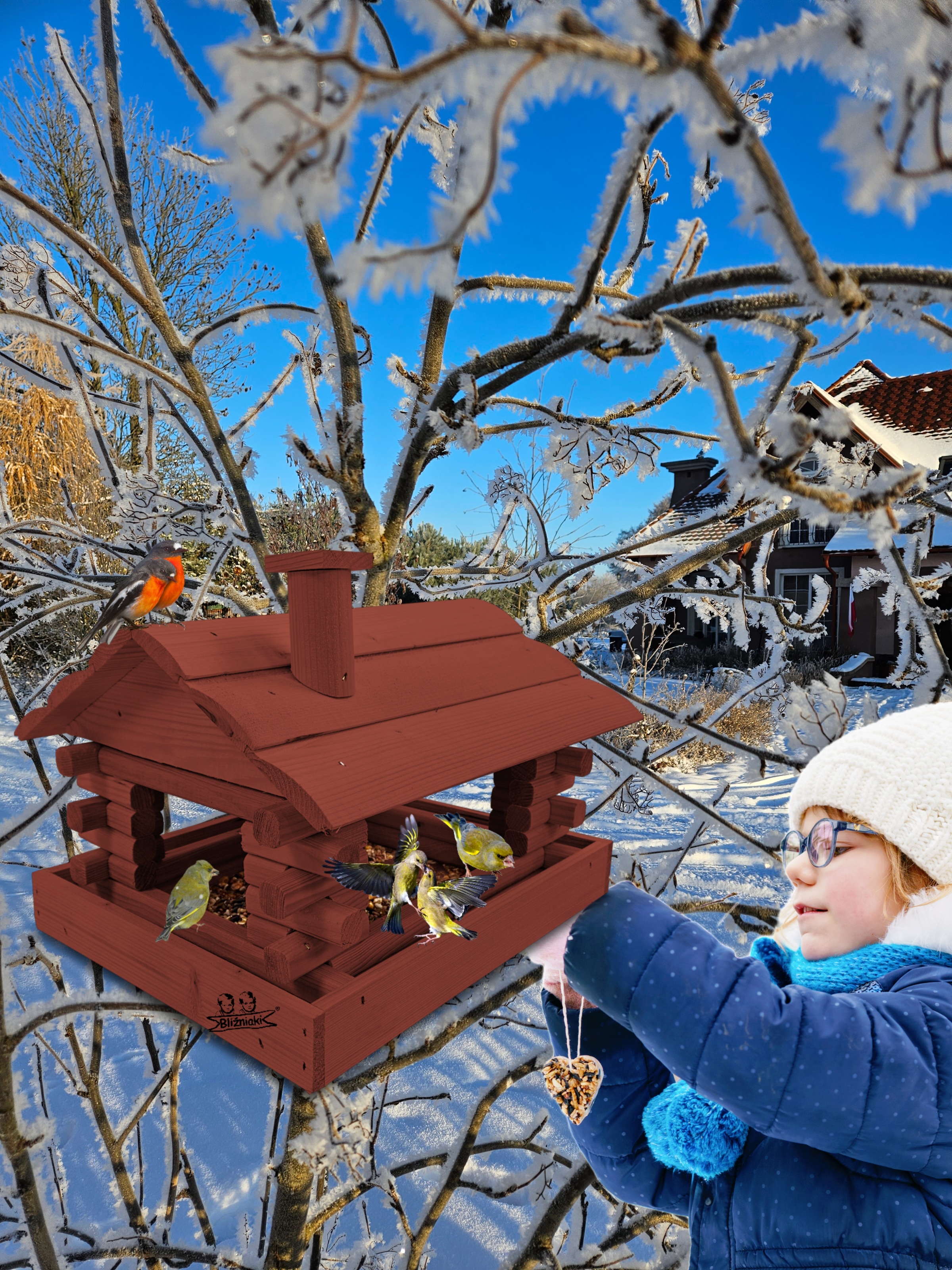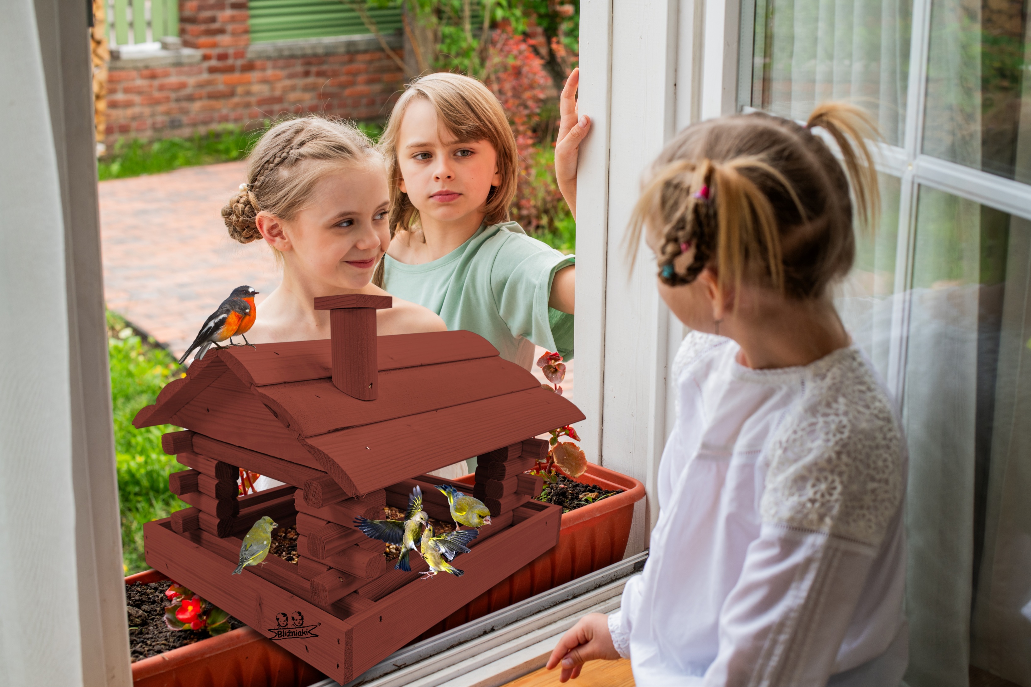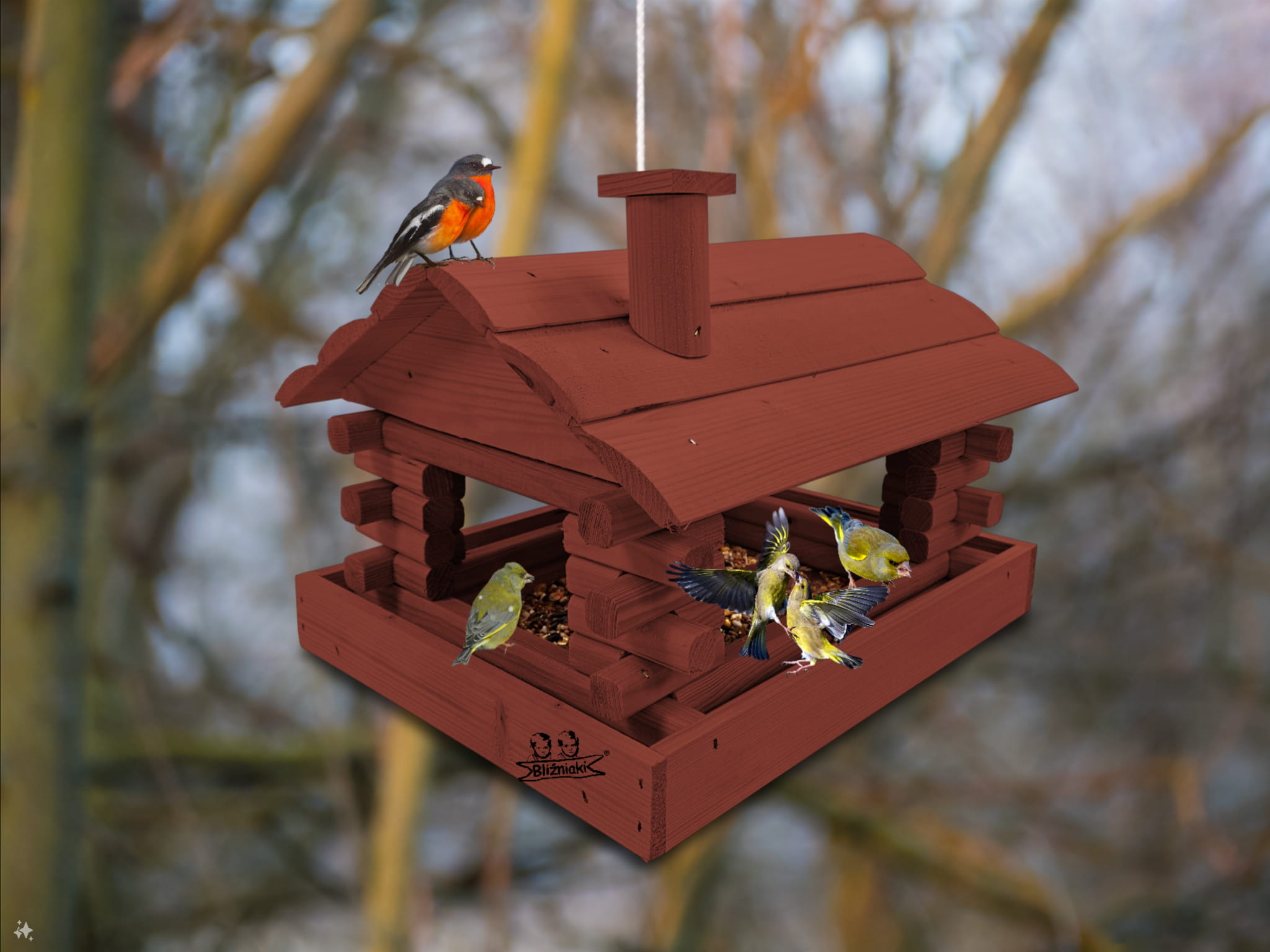 Karmnik wykonany z trwałego drewna, o starannym wykończeniu, przypomina klasyczny domek z kominem. Zapewnia ptakom bezpieczne i przytulne miejsce do odpoczynku oraz dostępu do pożywienia w zimniejszych miesiącach.
