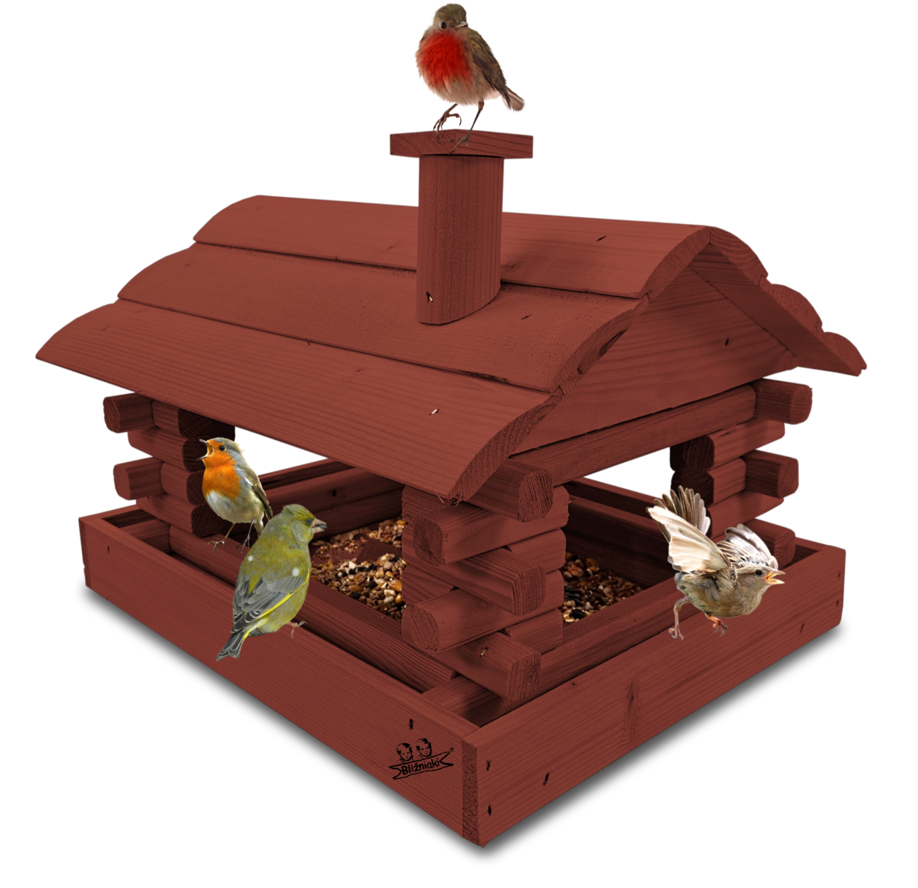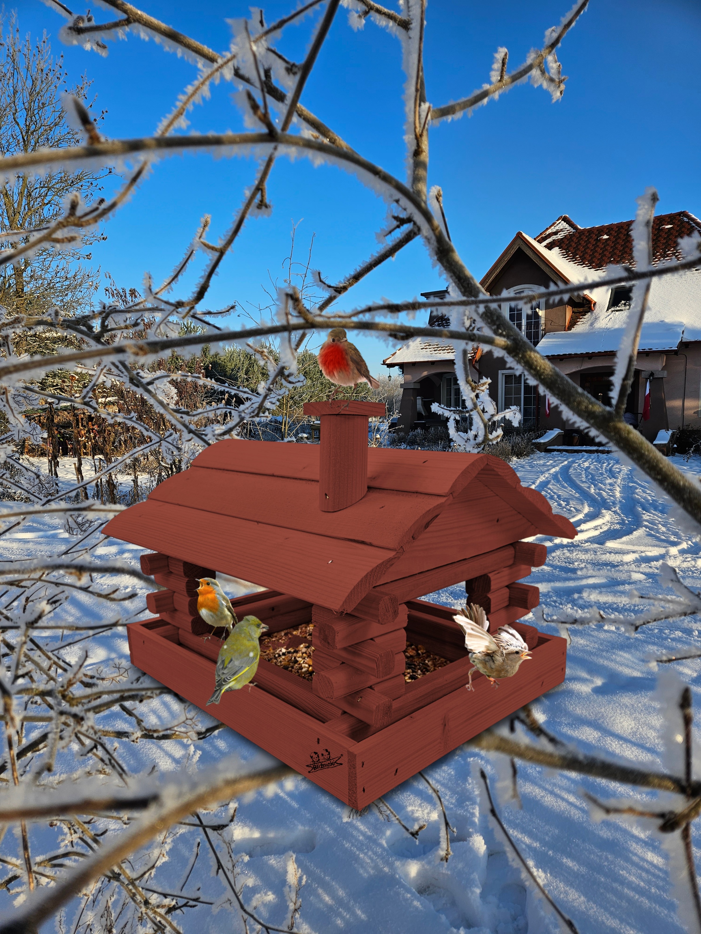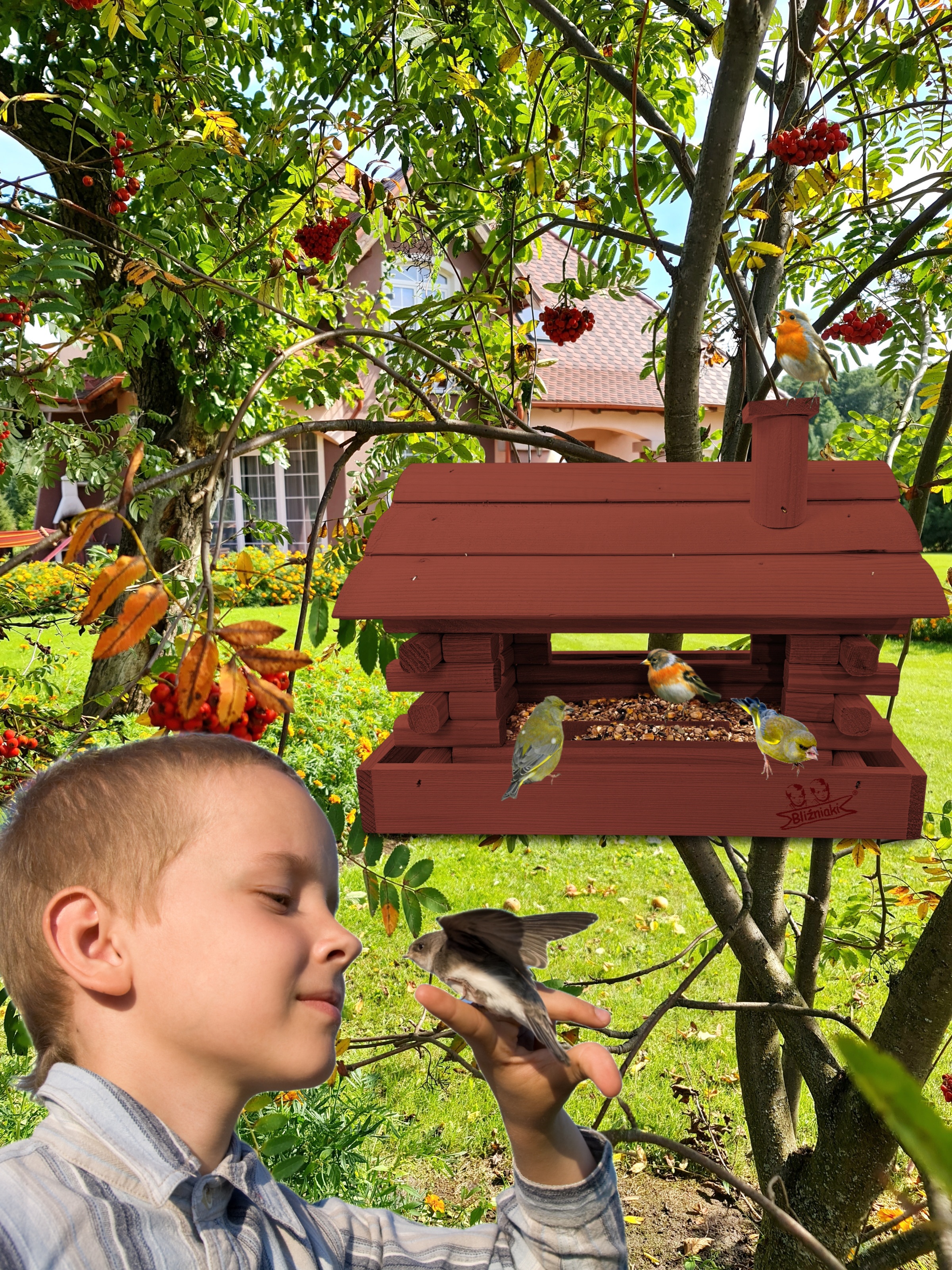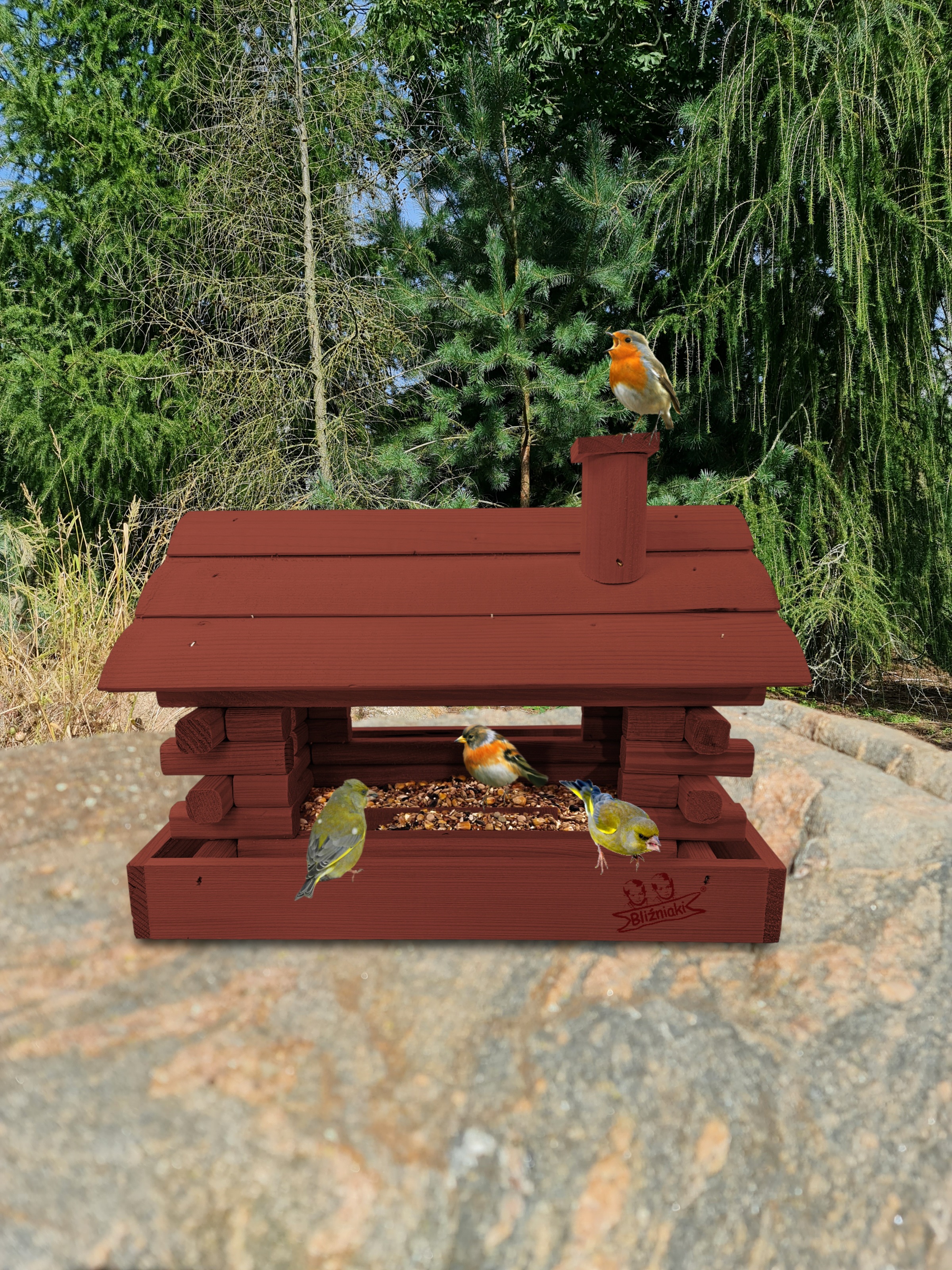 Karmnik wykonany z trwałego drewna, o starannym wykończeniu, przypomina klasyczny domek z kominem. Zapewnia ptakom bezpieczne i przytulne miejsce do odpoczynku oraz dostępu do pożywienia w zimniejszych miesiącach.