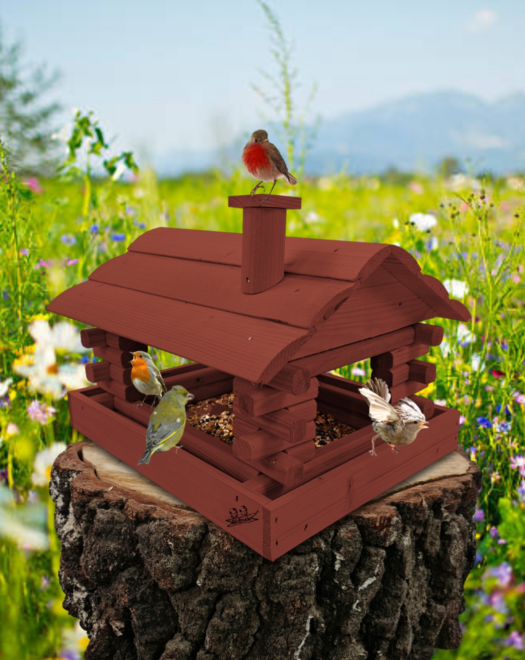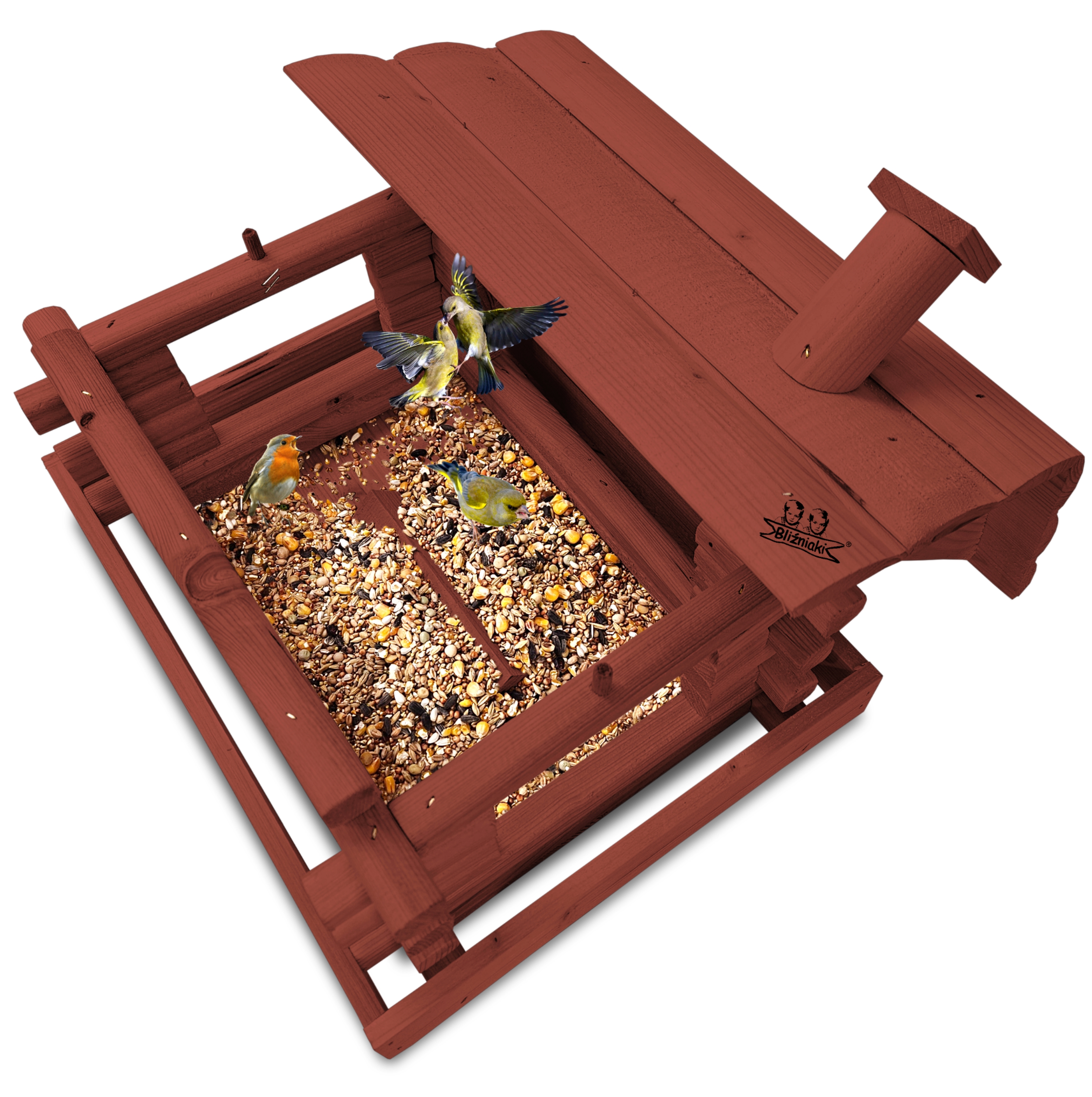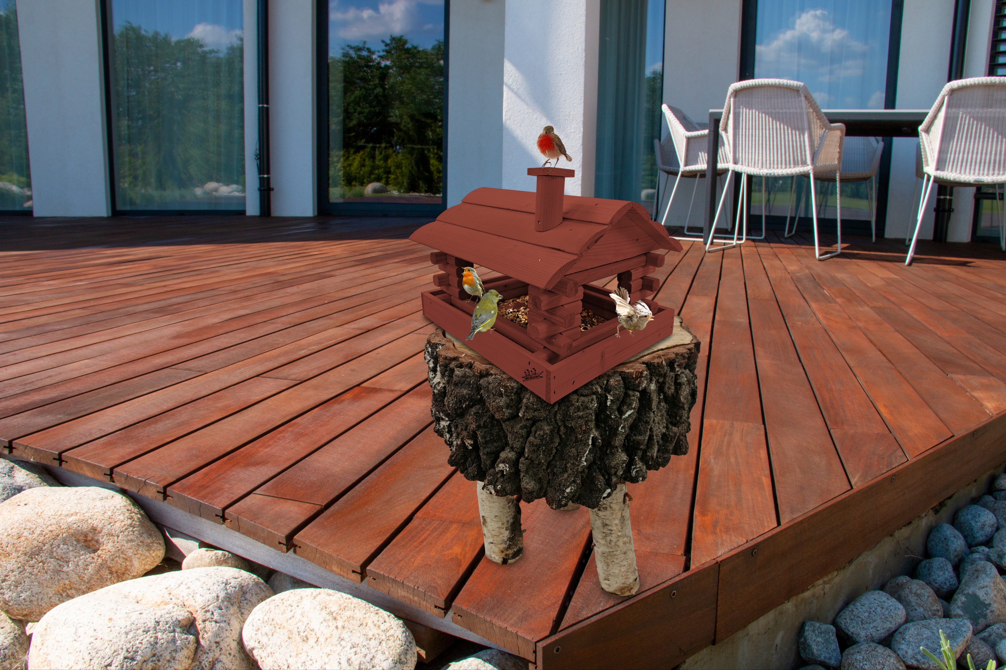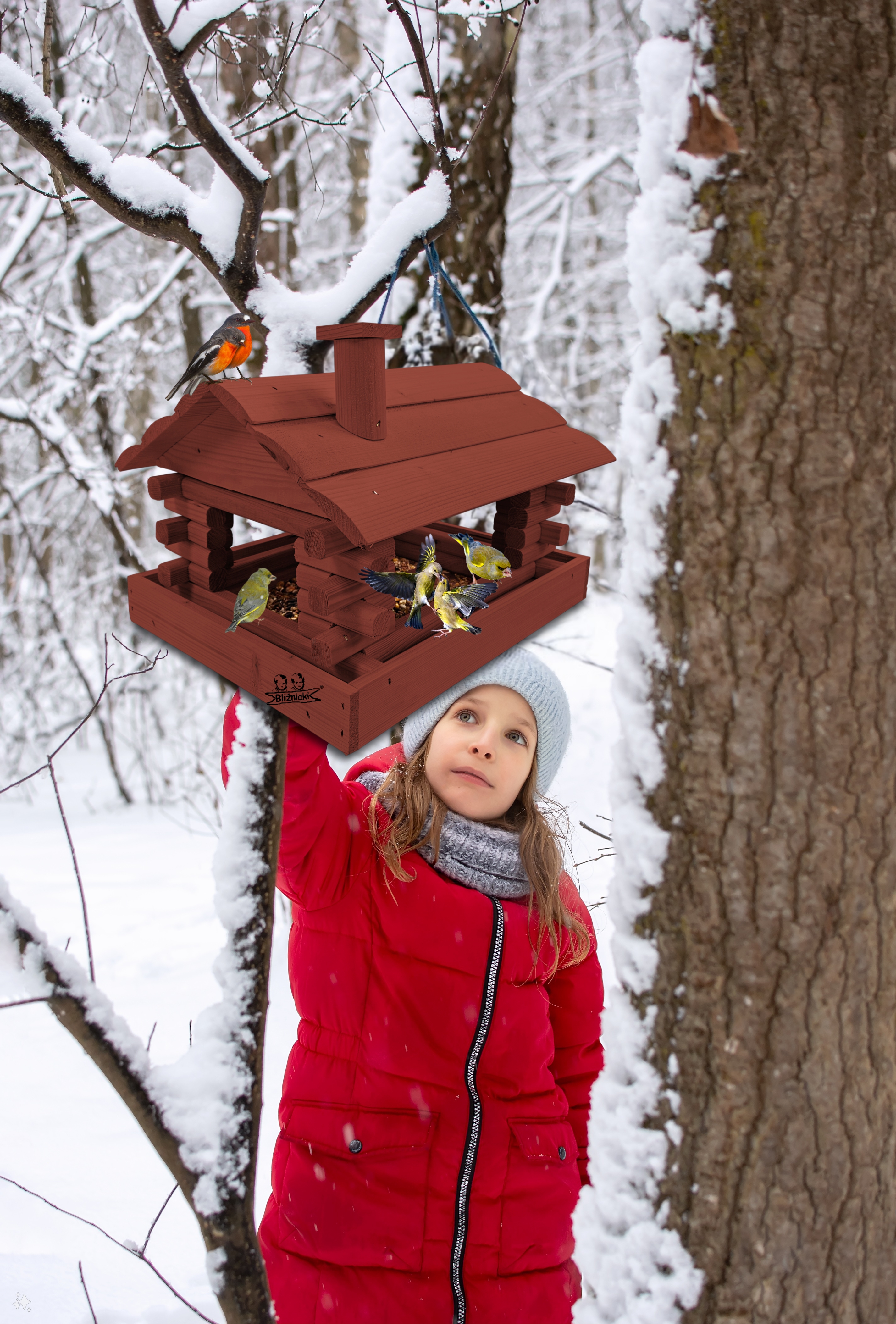 Karmnik w kolorze brązowym został zaprojektowany w taki sposób, aby sprostać każdym warunkom atmosferycznym przez cały rok. Wykonany w całości z impregnowanego ekologicznie drewna uzyskał trwałość i odporność na szkodliwe działanie wody oraz wilgoci, promieni UV, a także grzybów i pleśni. Może być więc przechowywany przez cały rok na zewnątrz.