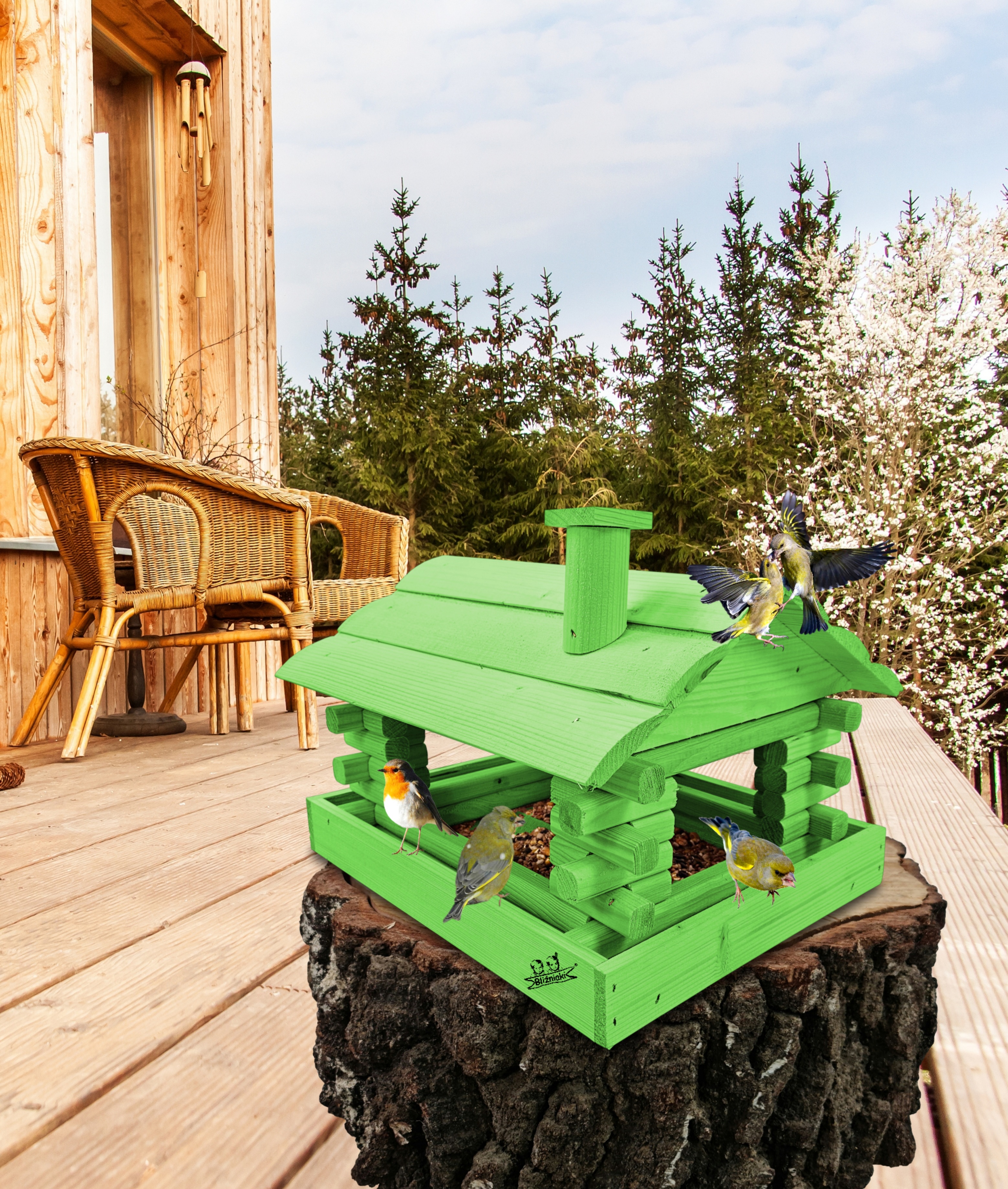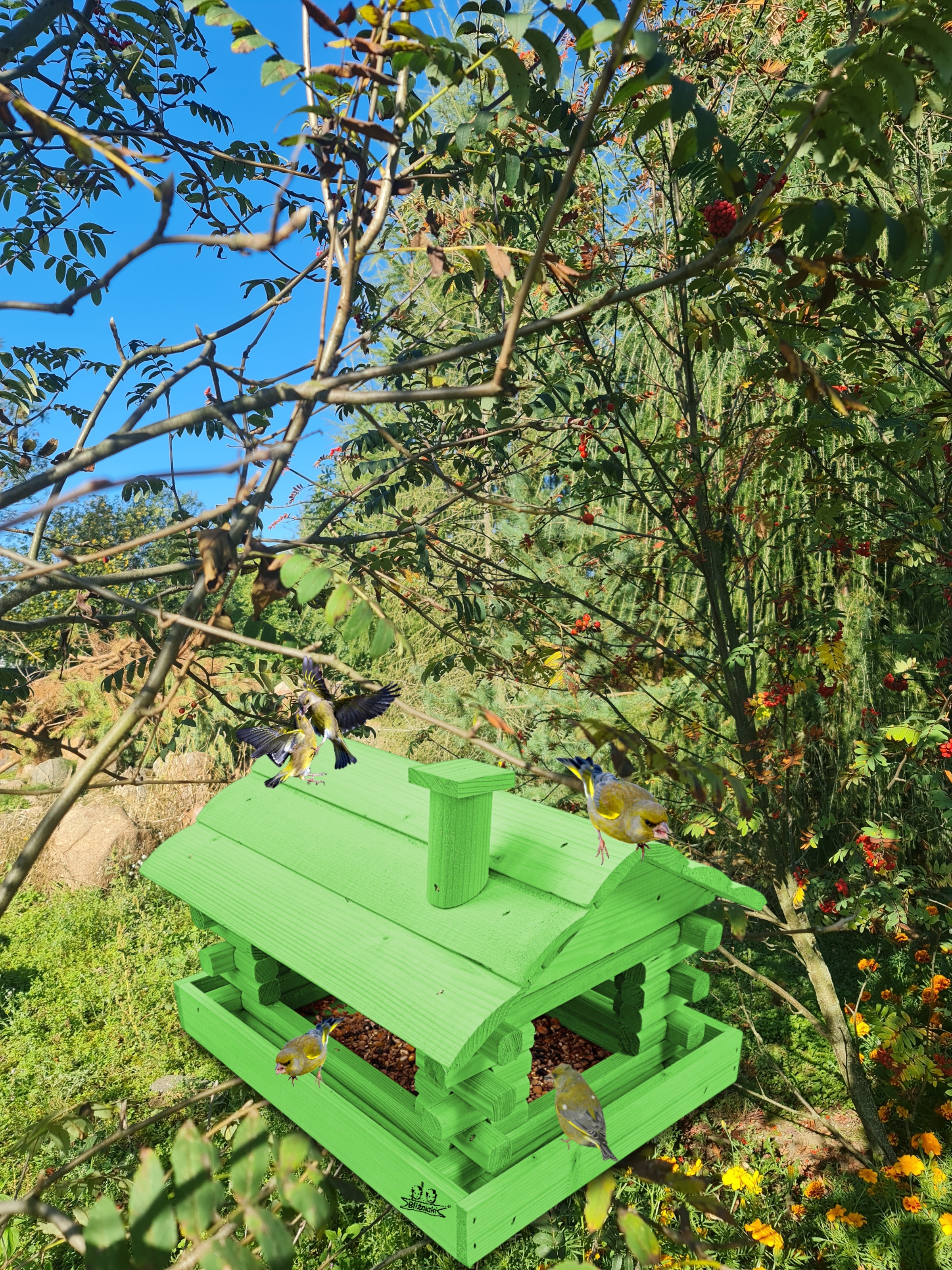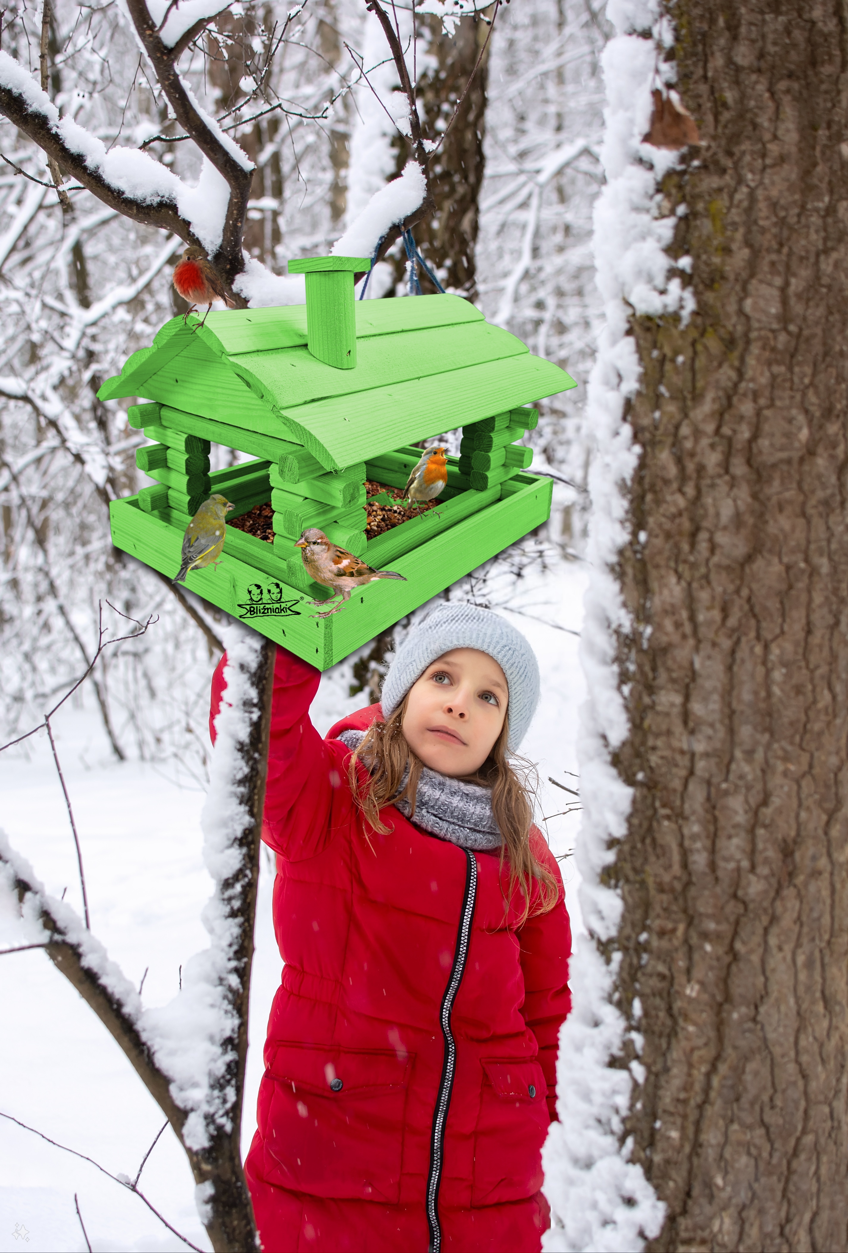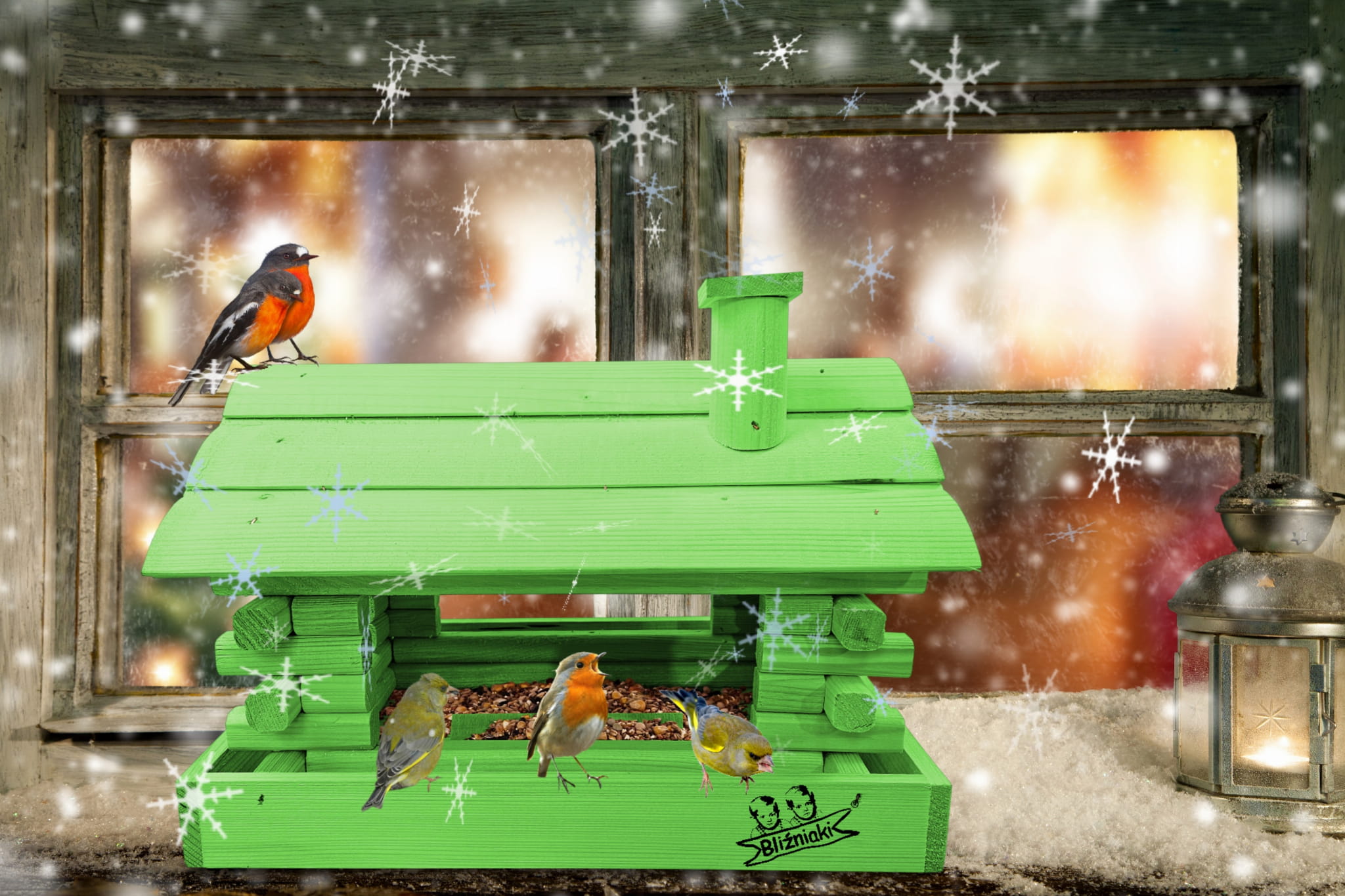 Karmnik wykonany z trwałego drewna, o starannym wykończeniu, przypomina klasyczny domek z kominem. Zapewnia ptakom bezpieczne i przytulne miejsce do odpoczynku oraz dostępu do pożywienia w zimniejszych miesiącach.